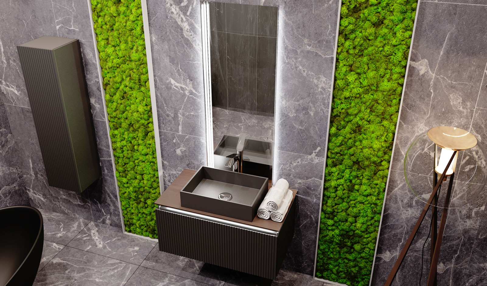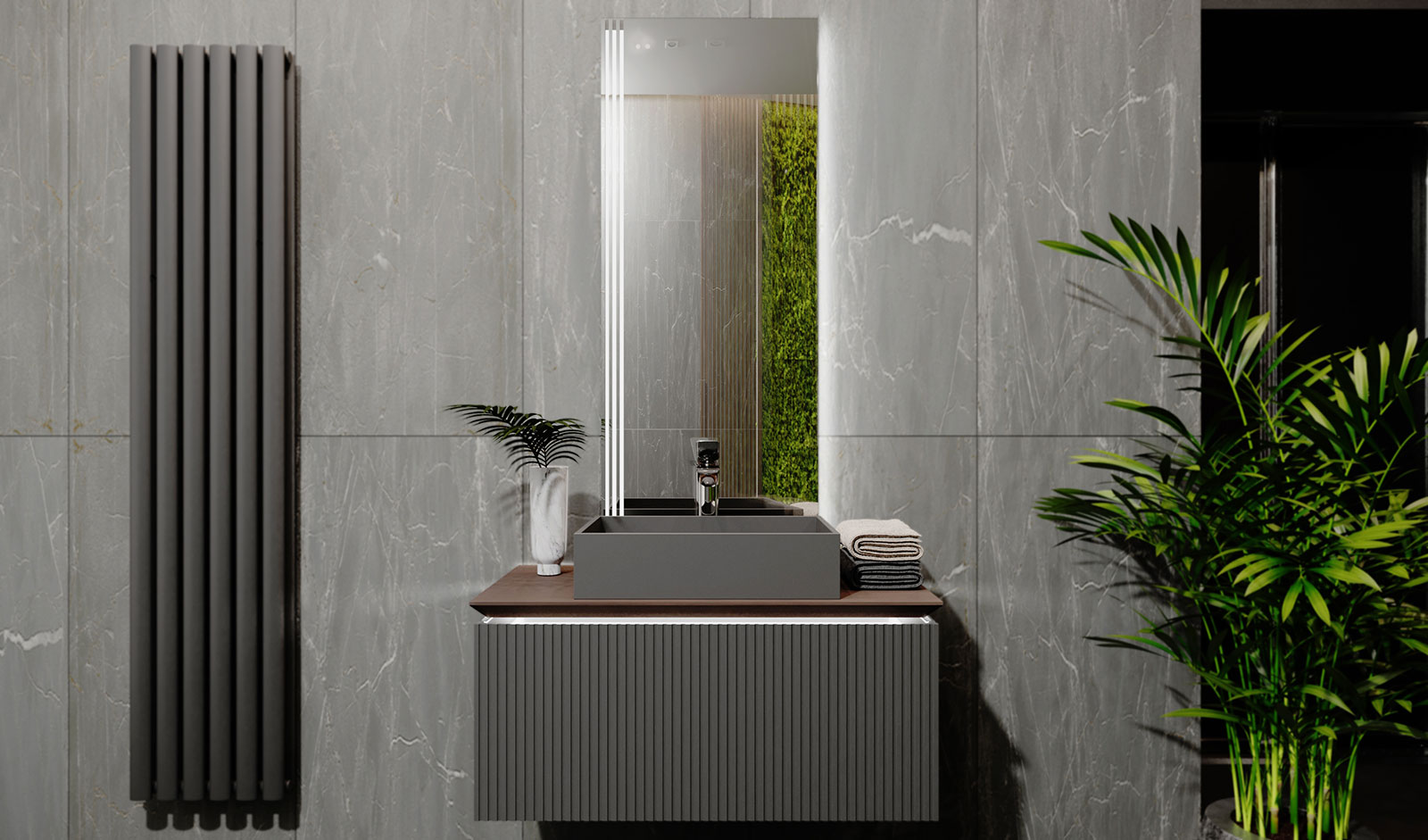Коллекция Strong Торговой марки Jorno. Черный куб, над которым возвышается массивная столешница из массива натурального бука. Соединение брутальности и изящества, массы и легкости. Сила темного цвета, натурального материала дерева сочетается с четкими тонкими линиями краев столешницы, тумбы с регулярными линиями на фасаде. Свет от подсветки столешницы тумбы не только придает функциональности, но и усиливает эмоциональный эффект на контрасте темной тяжелой формы и мягкого света. Вертикальное зеркало, расположенное по центру, придает еще большей строгости и лаконичности комплекту.