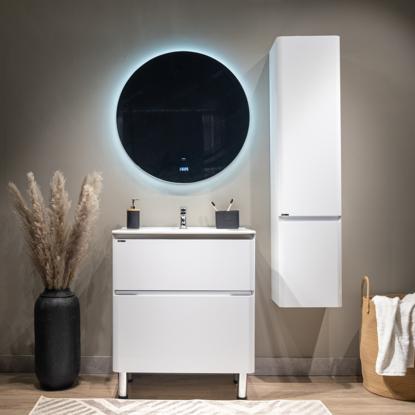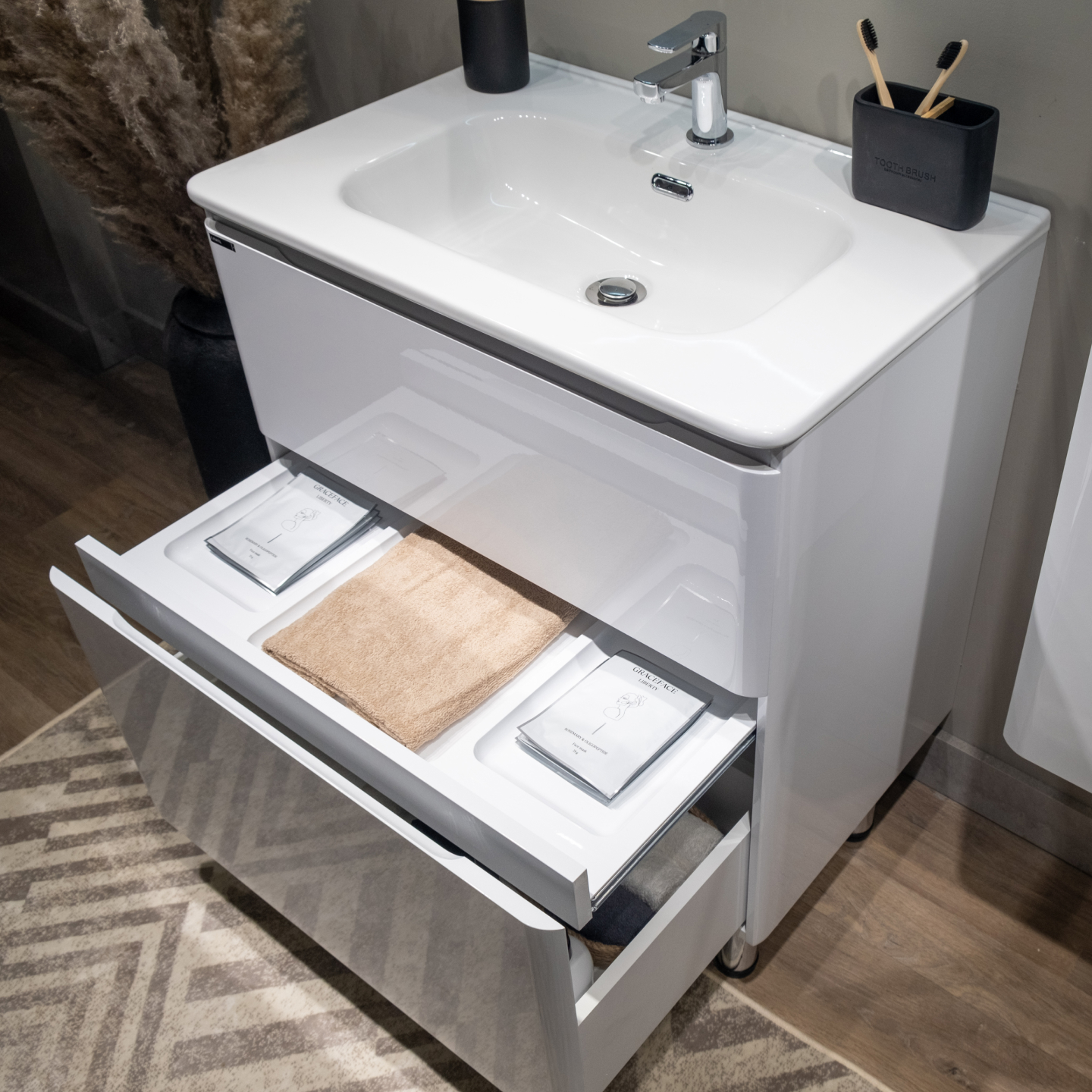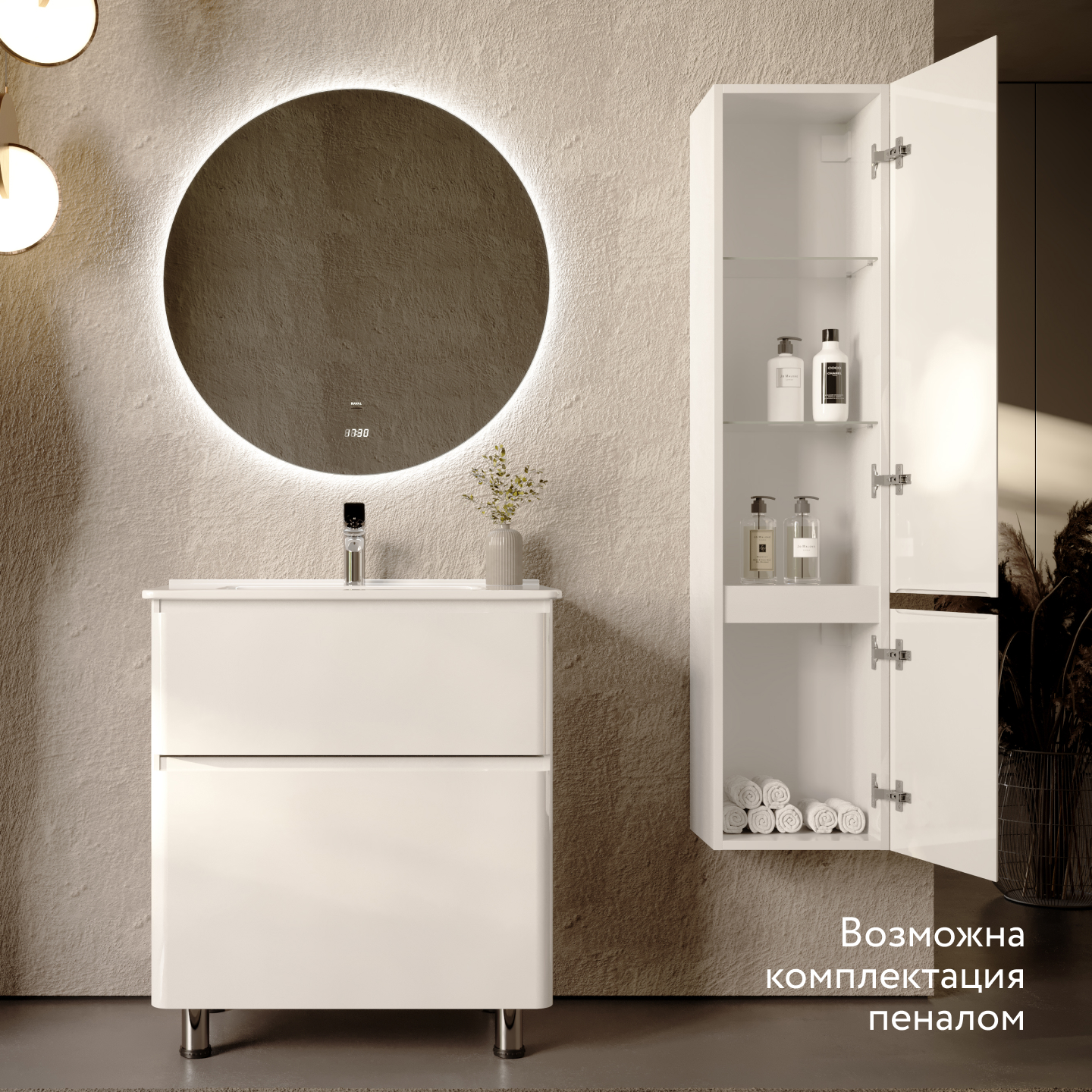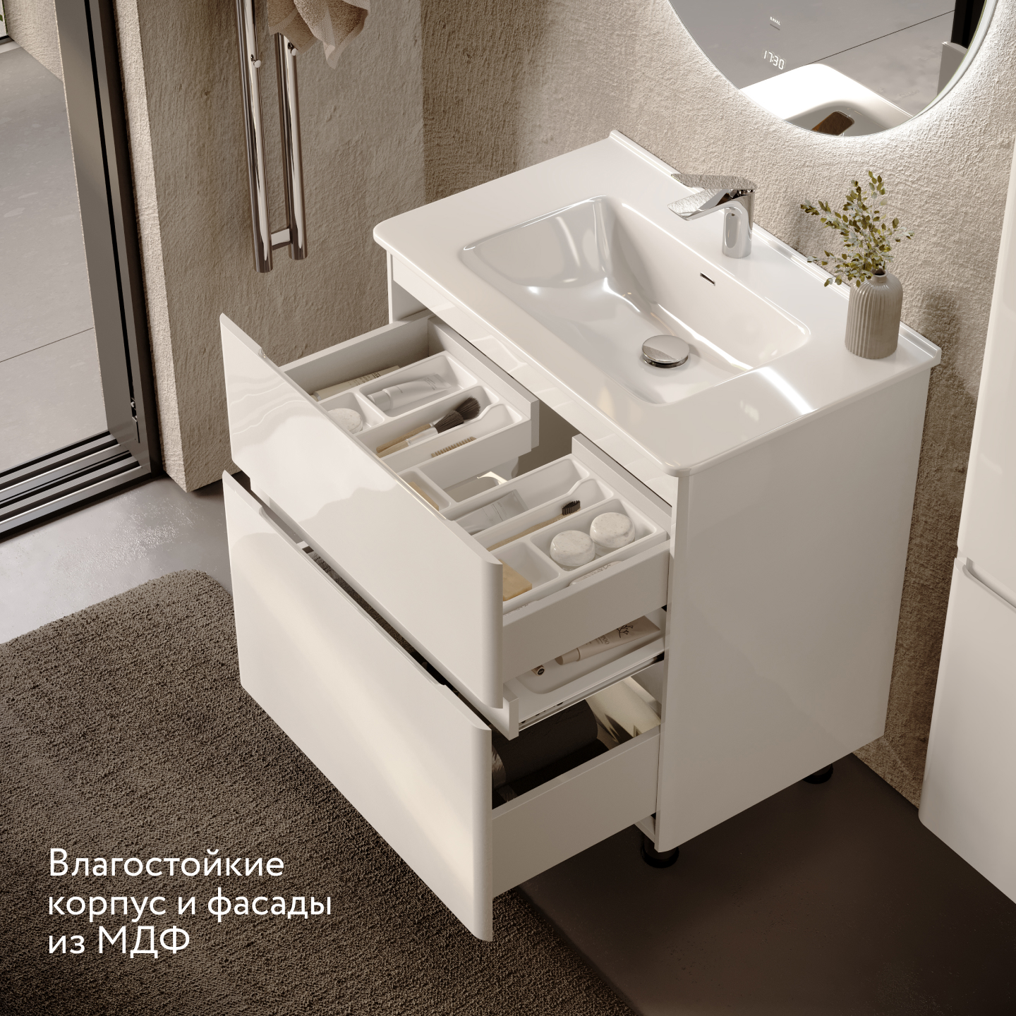 Скругленные углы мебели повторяют плавные изгибы чаши раковины, придавая комплекту мягкости и уюта.