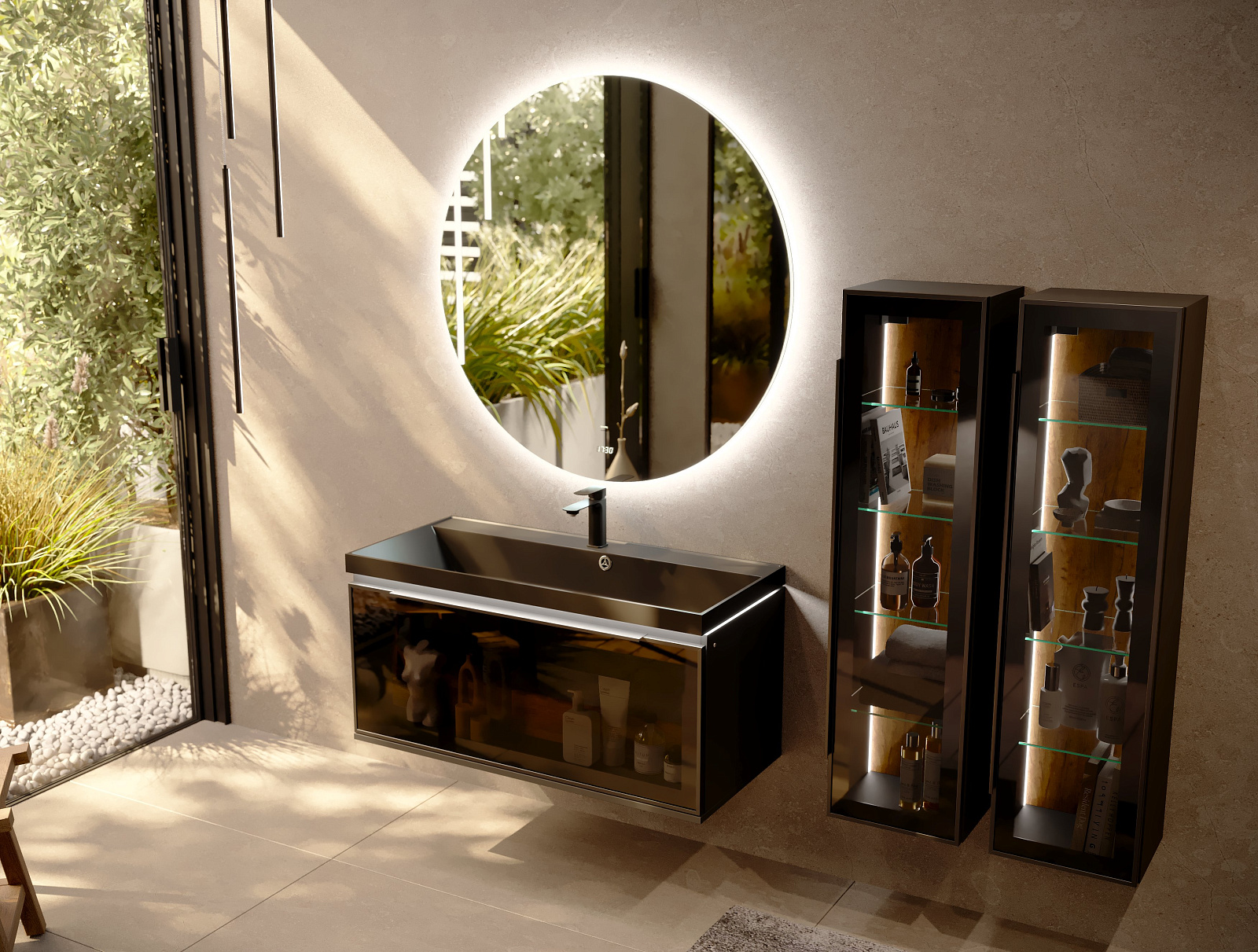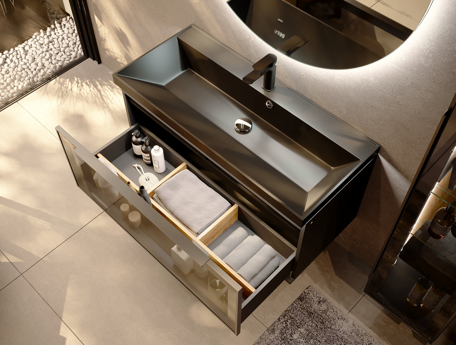 Выдвижной ящик-органайзер помогает поддерживать порядок в ящиках тумбы и обеспечивает лёгкий доступ к необходимым вещам. Чёрная вкладная раковина с подсветкой по периметру прекрасно вписываются в общую концепцию гармонии противоречий – силы и легкости. Влагостойкие корпуса и внутренние элементы обеспечивают мебели надёжность и долговечность.