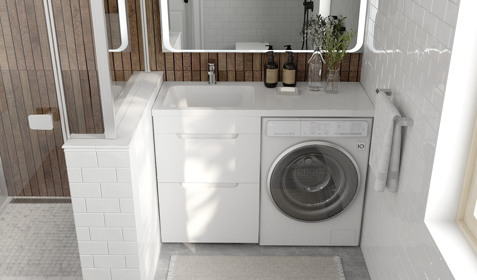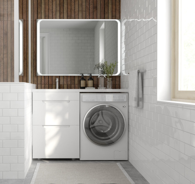 Комплект мебели для ванных комнат Forte под стиральную машину представлен в 2 размерах 110 и 120 см, возможна установка правой и левой раковин (литьевой мрамор).