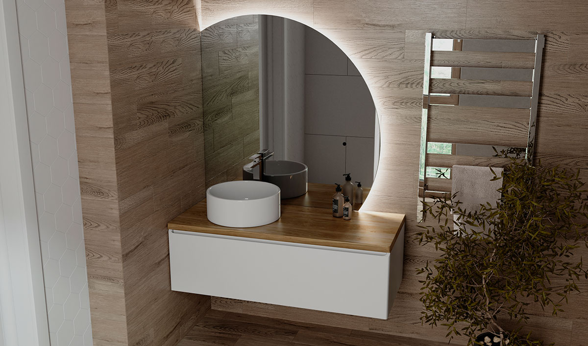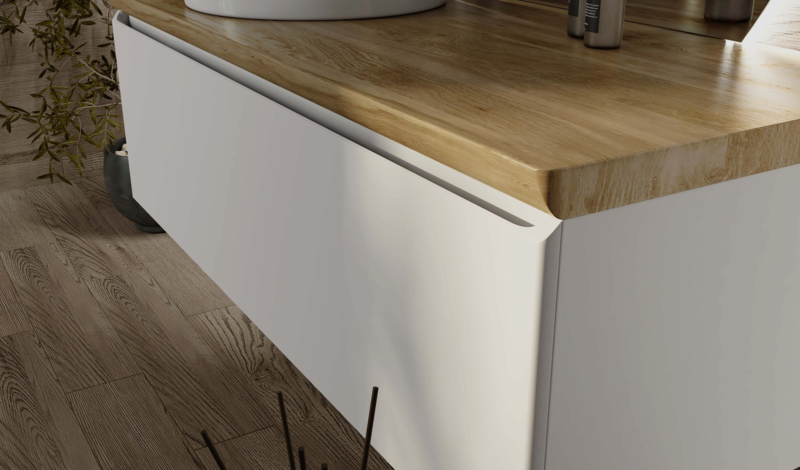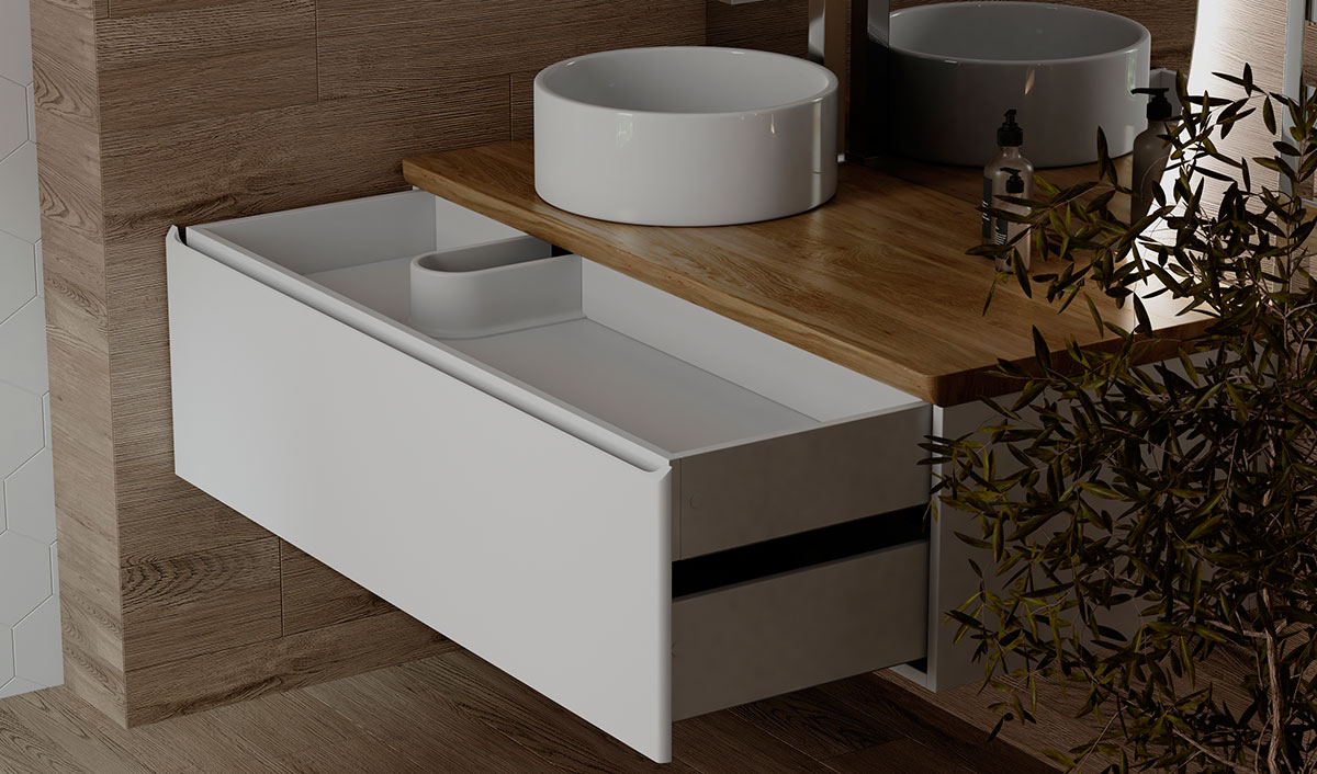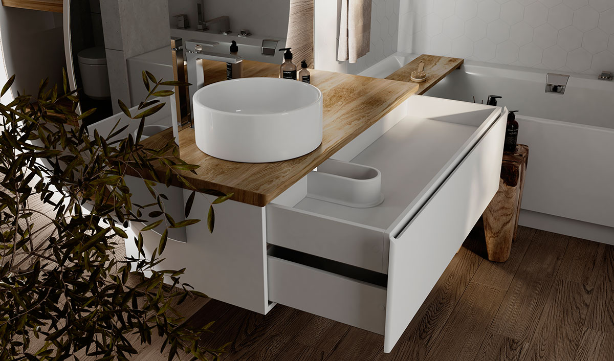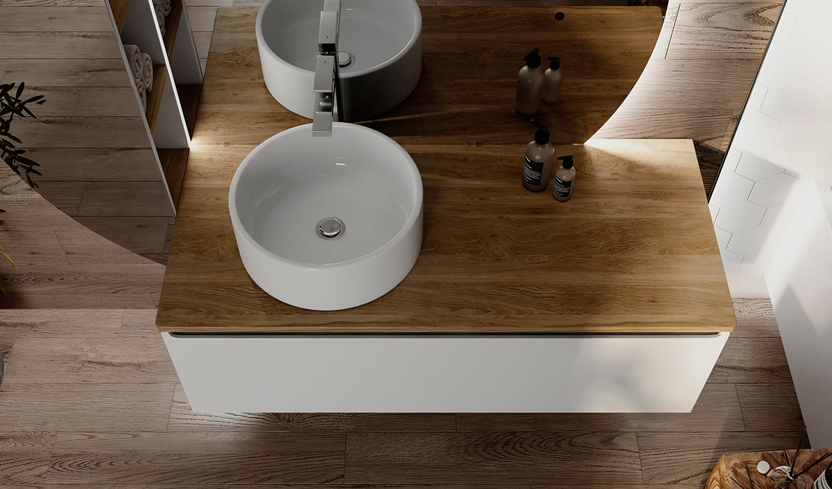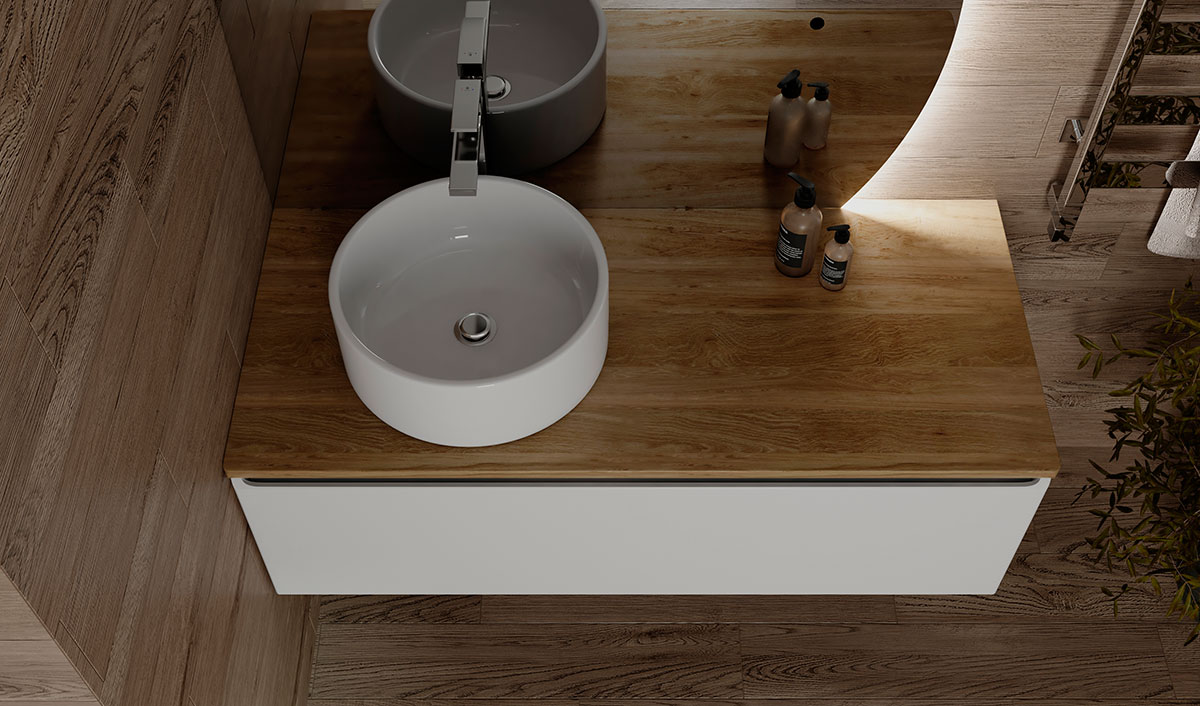 Корпус тумбы Solis 120 с изящной интегрированной ручкой на фасаде выполнен из МДФ в белой глянцевой пленке ПВХ. Столешница из цельного массива бука.