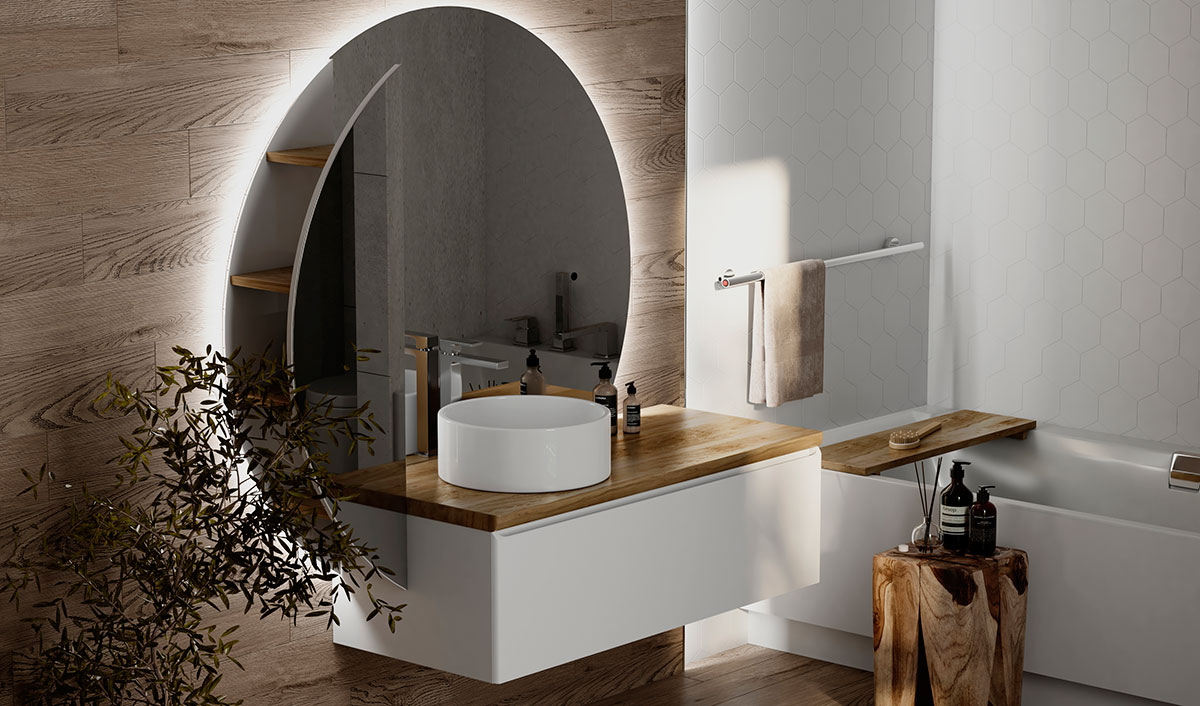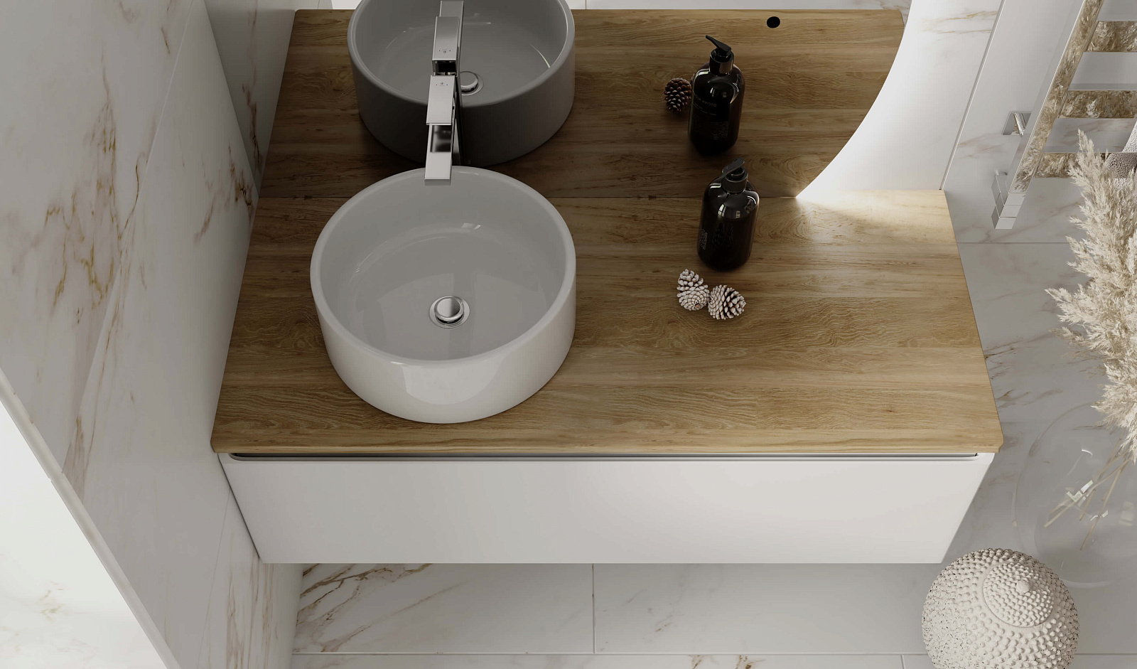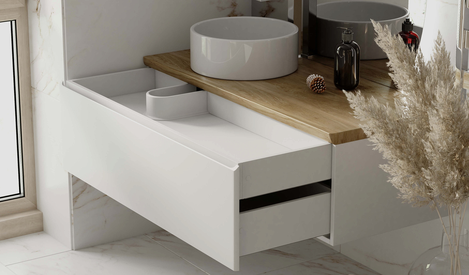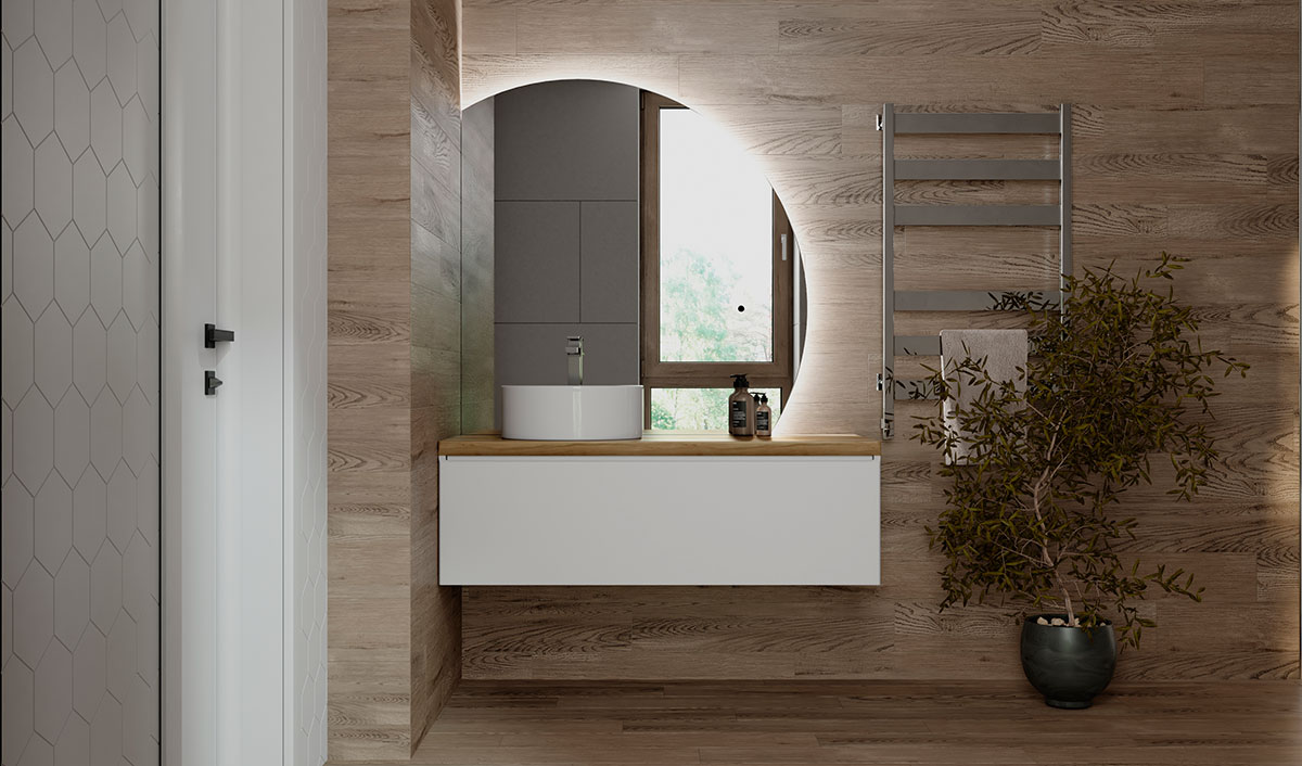 Корпус тумбы Solis 120 с изящной интегрированной ручкой на фасаде выполнен из МДФ в белой глянцевой пленке ПВХ. Столешница из цельного массива бука.