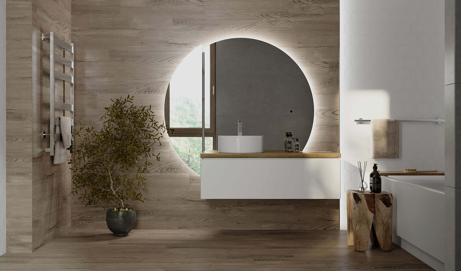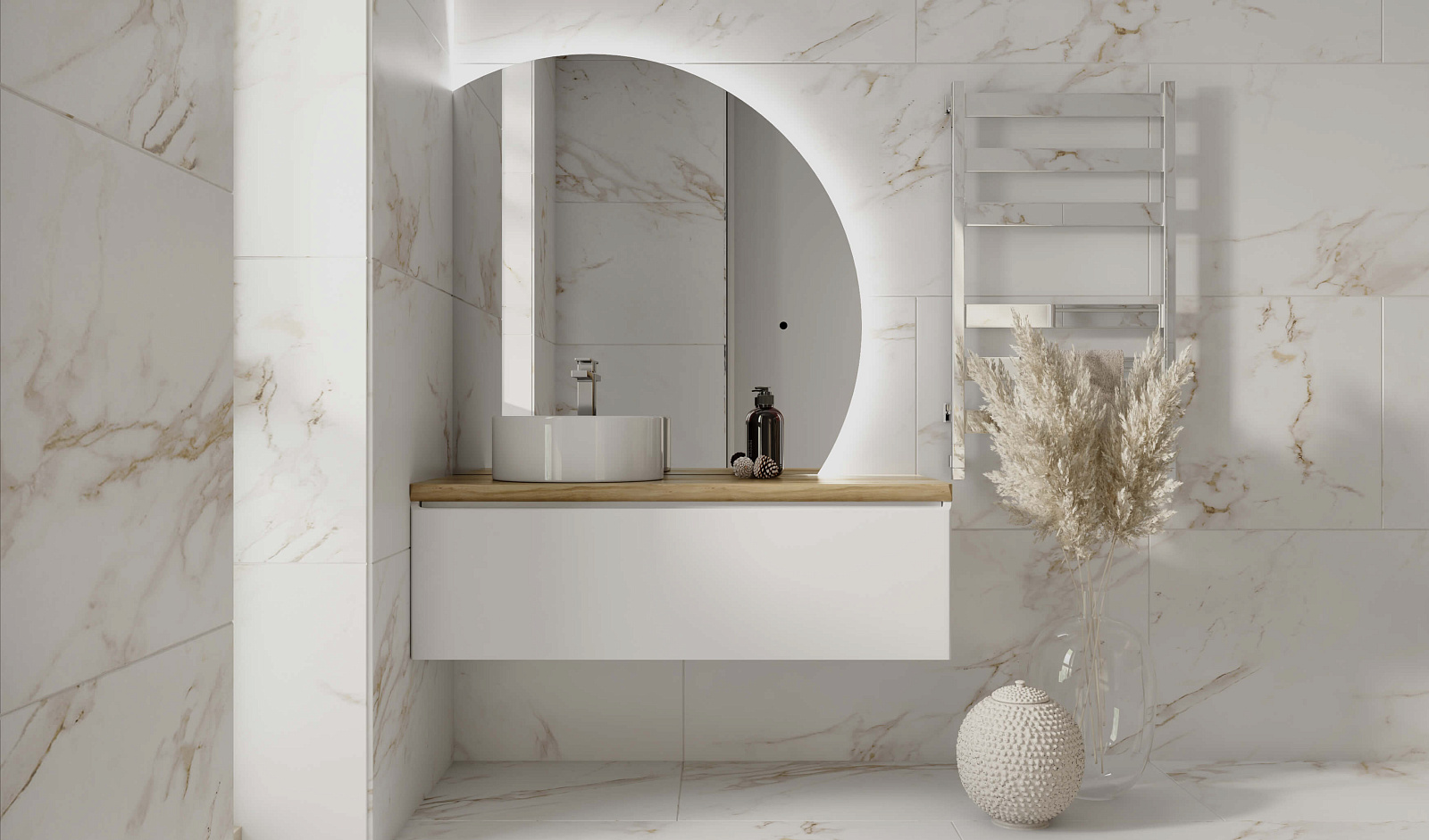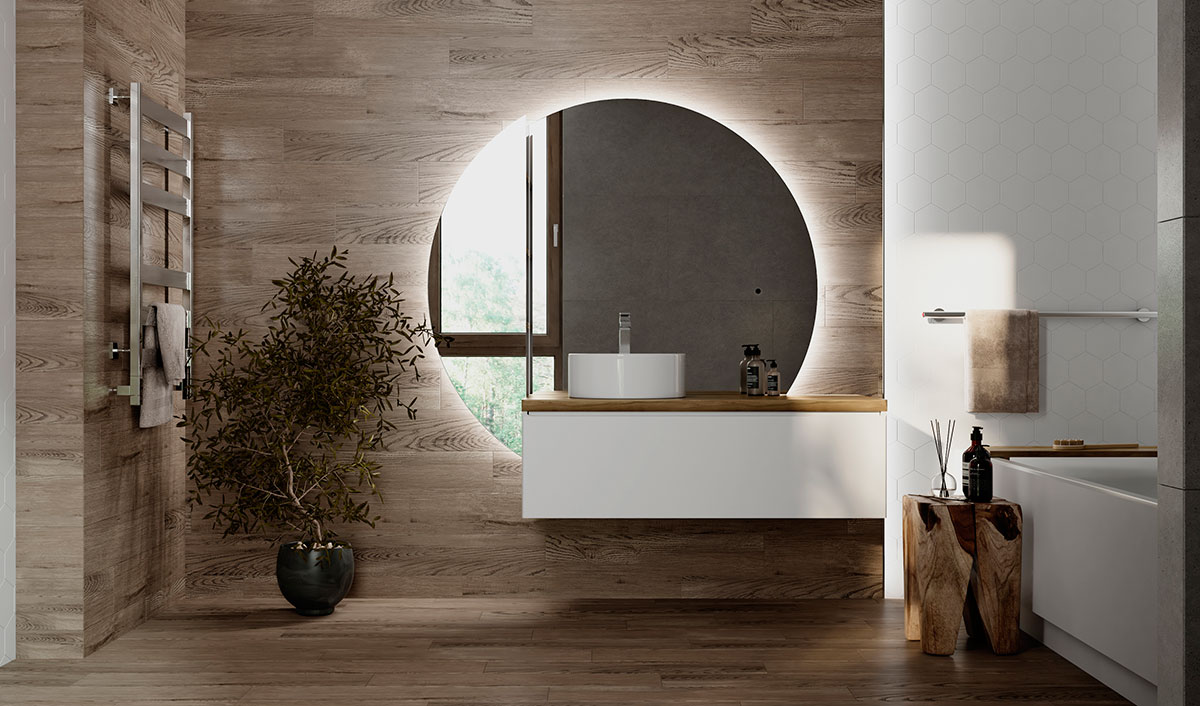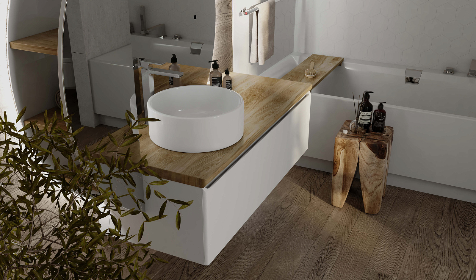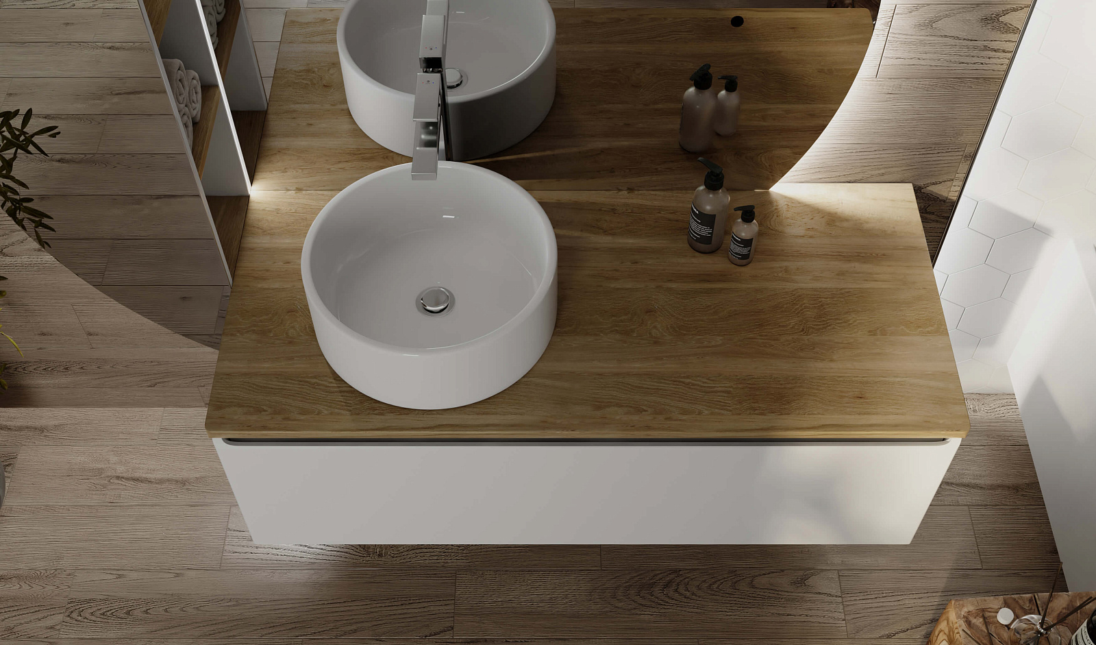 Корпус тумбы Solis 120 с изящной интегрированной ручкой на фасаде выполнен из МДФ в белой глянцевой пленке ПВХ. Столешница из цельного массива бука.