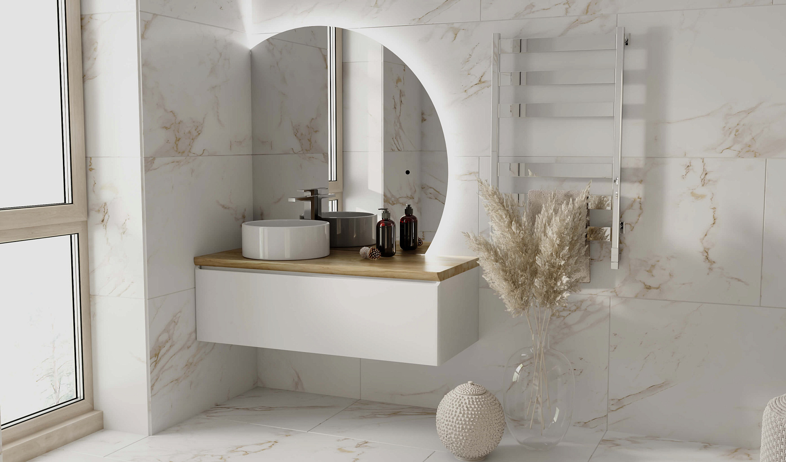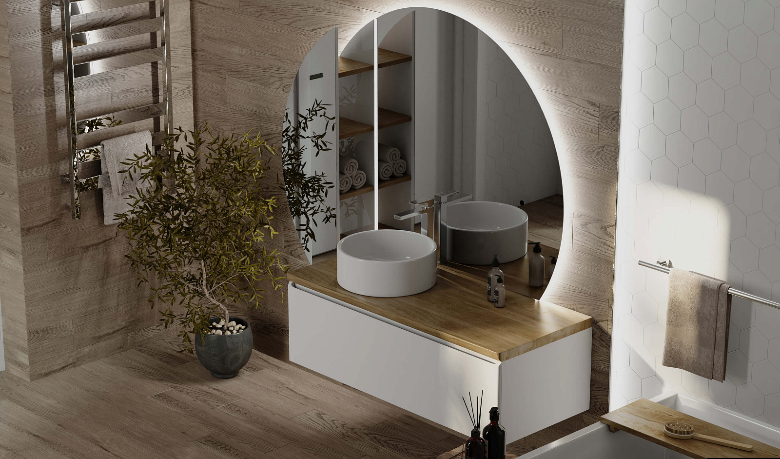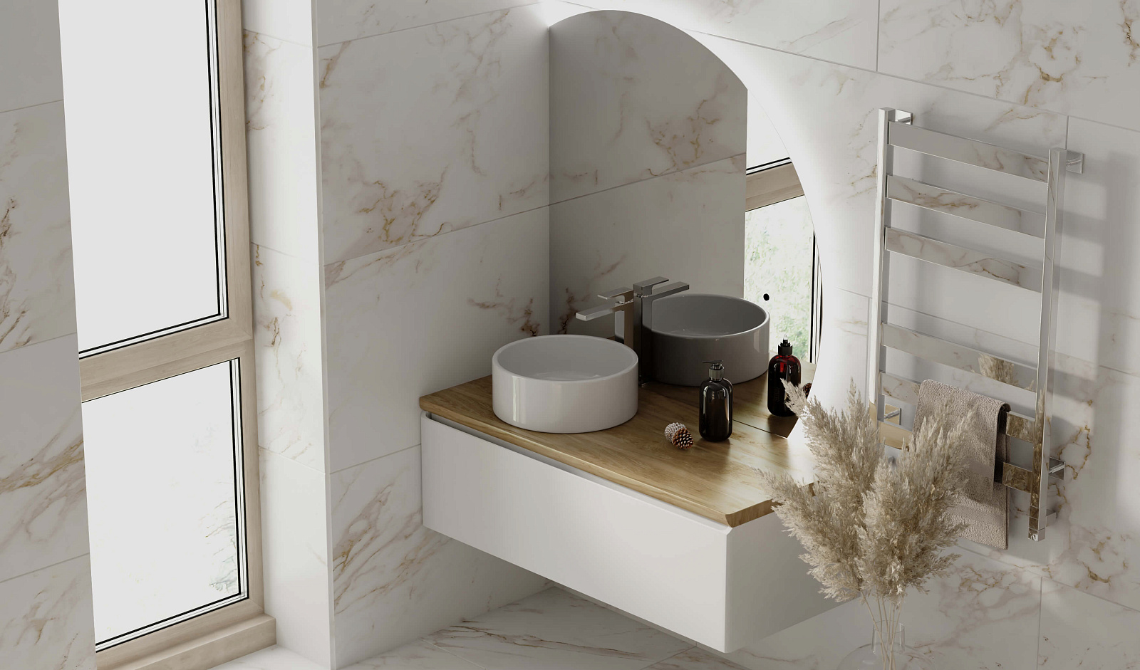 Зеркало оснащено светодиодной подсветкой по периметру с бесконтактным включателем. Возможна комплектация тремя разными вариантами зеркала. У тумбы есть большой вместительный ящик с системой метабокс дополнительный скрытый ящик, который увеличивает место хранения.