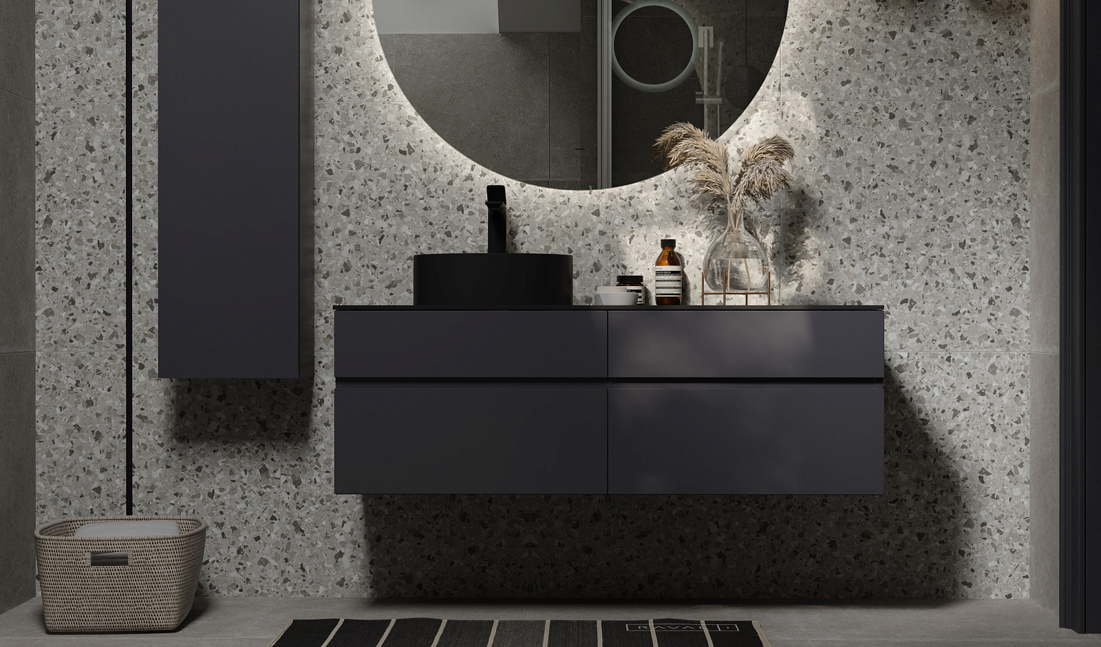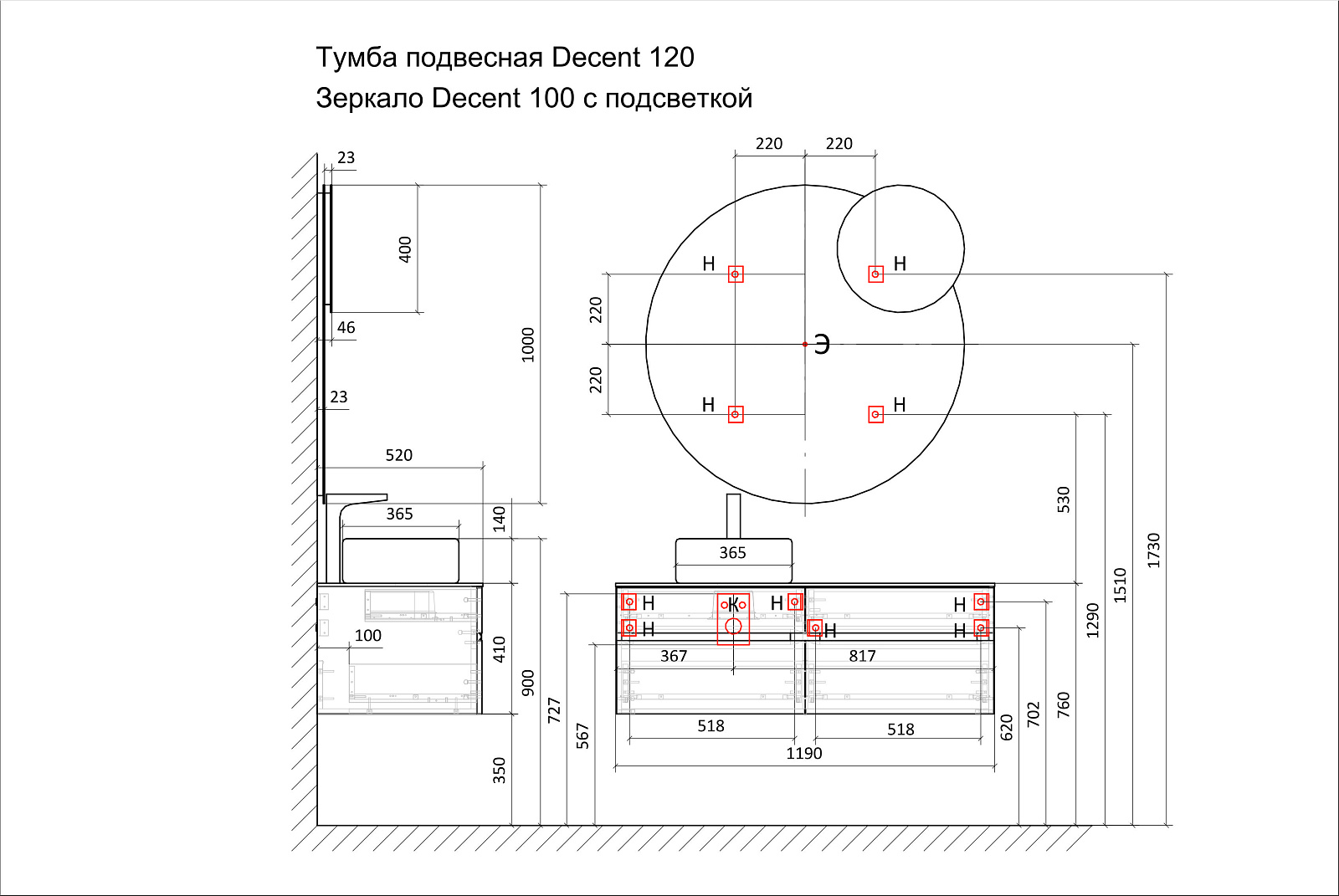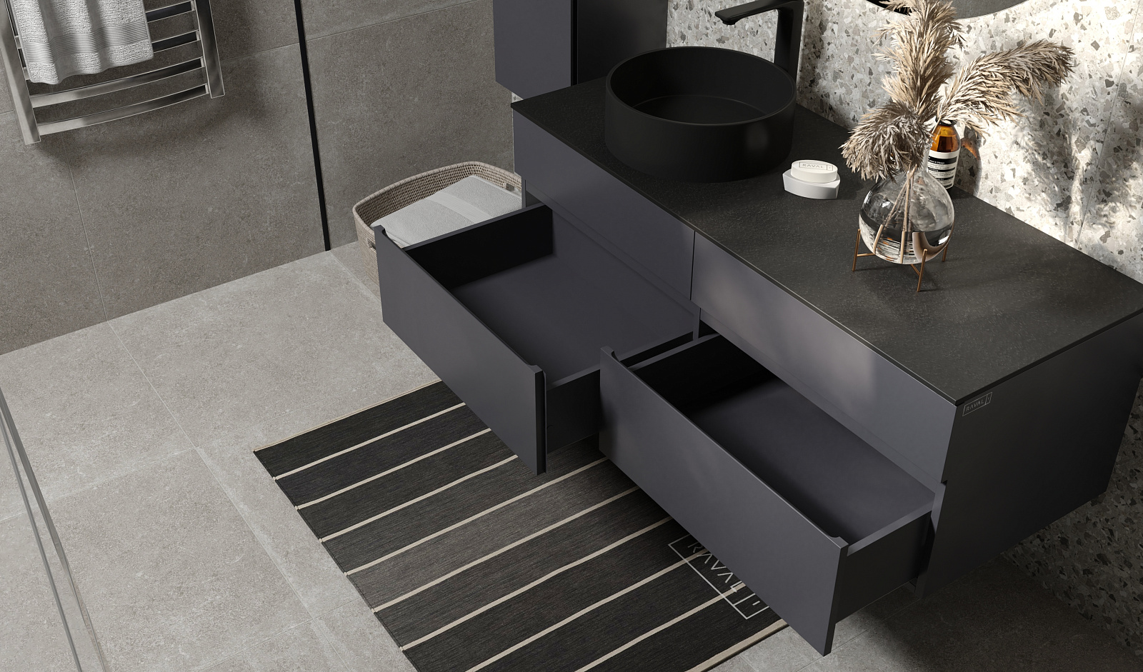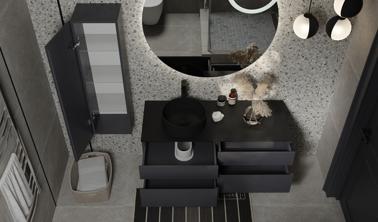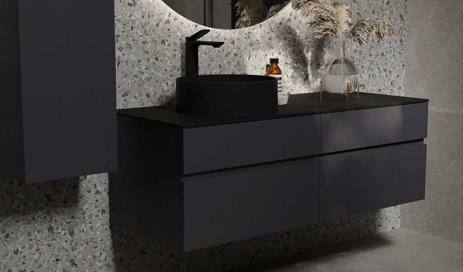 Ящики тумб оснащены доводчиками. Зеркало в комплекте - c подсветкой и бесконтактным включением.
