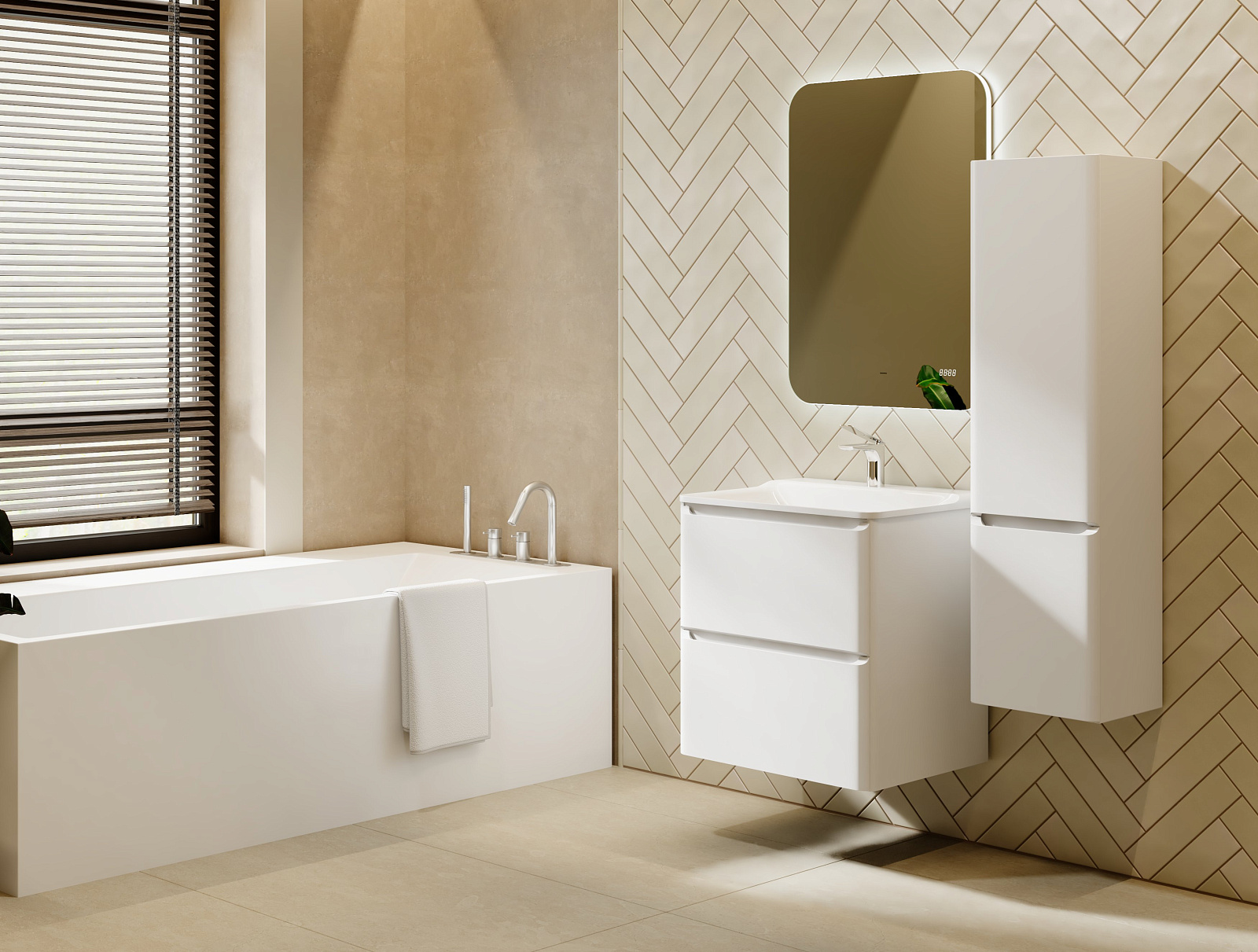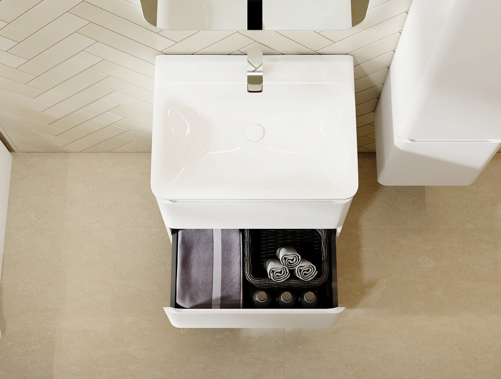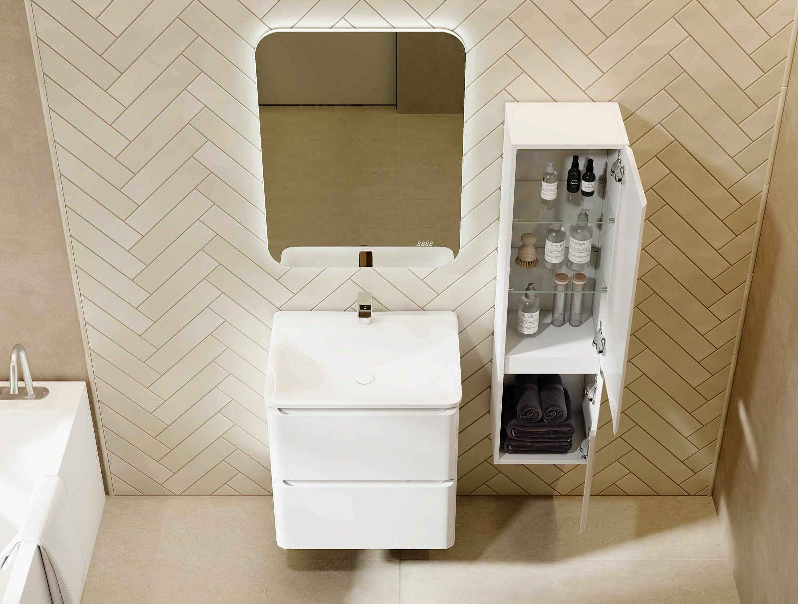 Коллекция Welto разработана в сдержанном, современном стиле. Компактный выдвижной ящик освобождает пространство под тумбой для дополнительного использования. Встроенный органайзер помогает удобно разместить все мелкие предметы и поддерживать порядок в ванной комнате. Плавное скругление углов и интегрированные ручки делают комплект мебели максимально безопасным. Полноразмерная вкладная раковина авторского дизайна с пологими бортами проста в уходе. Корпуса и фасады пенала и тумбы изготовлены из МДФ и покрыты глянцевой пленкой ПВХ.