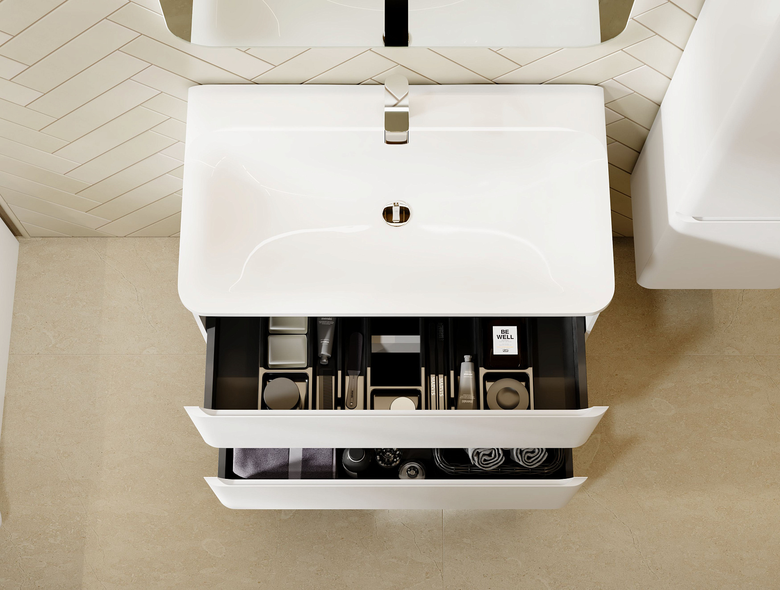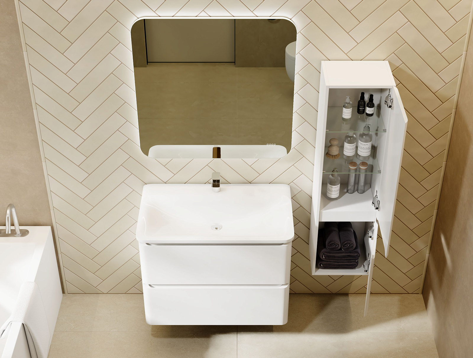 Коллекция Welto разработана в сдержанном, современном стиле. Компактный выдвижной ящик освобождает пространство под тумбой для дополнительного использования. Встроенный органайзер помогает удобно разместить все мелкие предметы и поддерживать порядок в ванной комнате. Плавное скругление углов и интегрированные ручки делают комплект мебели максимально безопасным. Полноразмерная вкладная раковина авторского дизайна с пологими бортами проста в уходе. Корпуса и фасады пенала и тумбы изготовлены из МДФ и покрыты глянцевой пленкой ПВХ.