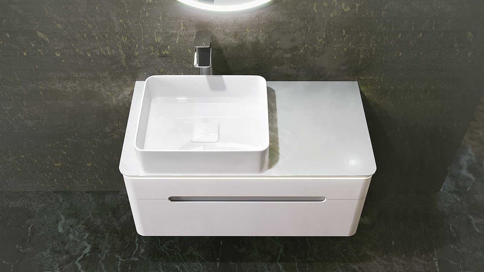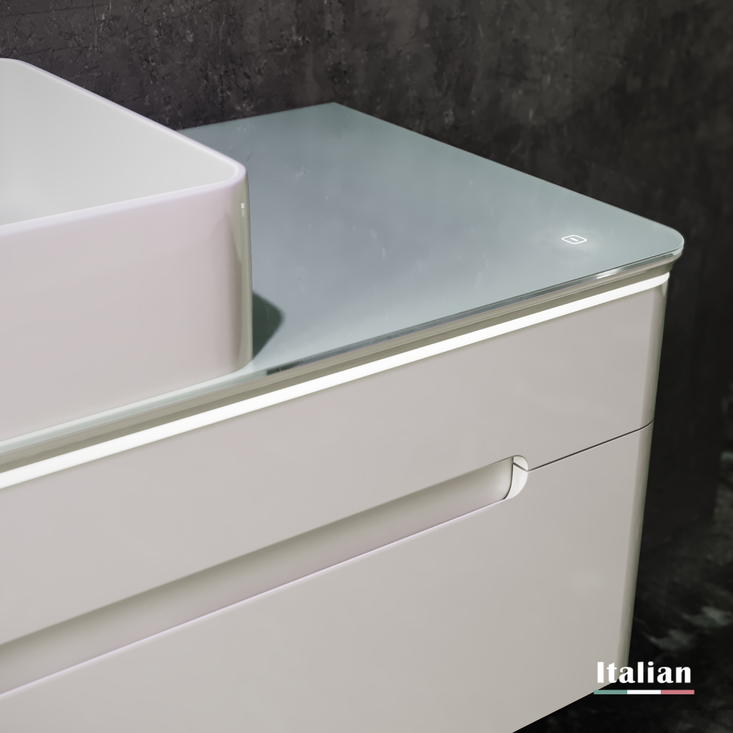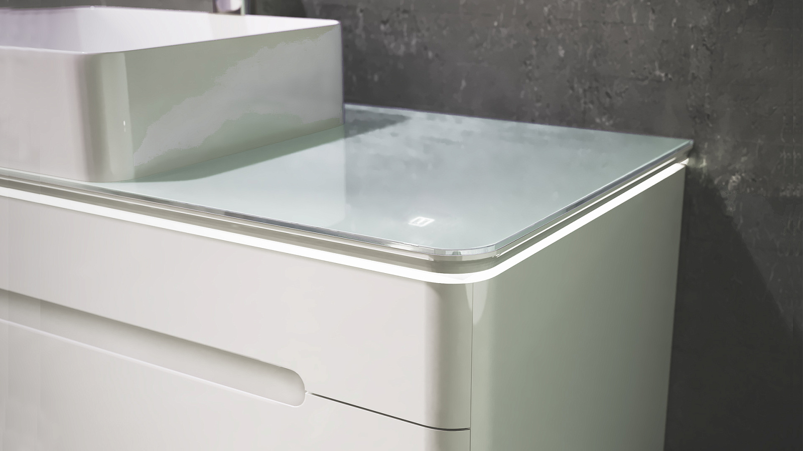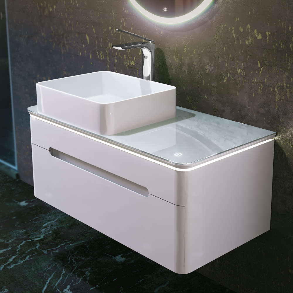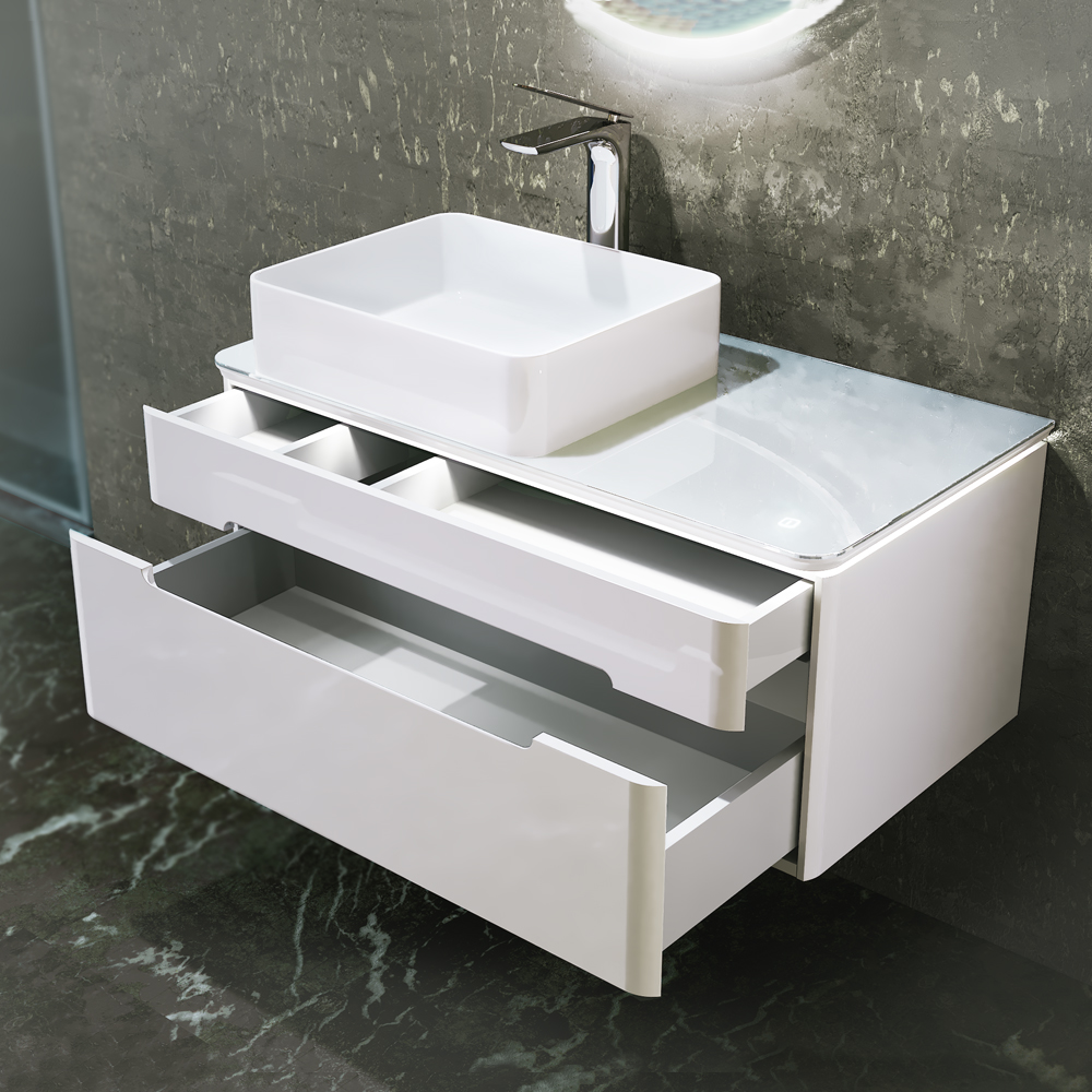 Тумба устойчива к царапинам и перепаду температур. Столешница из стекла Lacobel придает легкость композиции. Бесконтактное включение подсветки. Система плавного закрывания ящиков. Внутренний дополнительный ящик для мелочей. Само название коллекции говорит о том, что одним из основных достоинств данного комплекта является подсветка. Свет столешницы тумбы можно регулировать от деликатного мягкого до более яркого.|