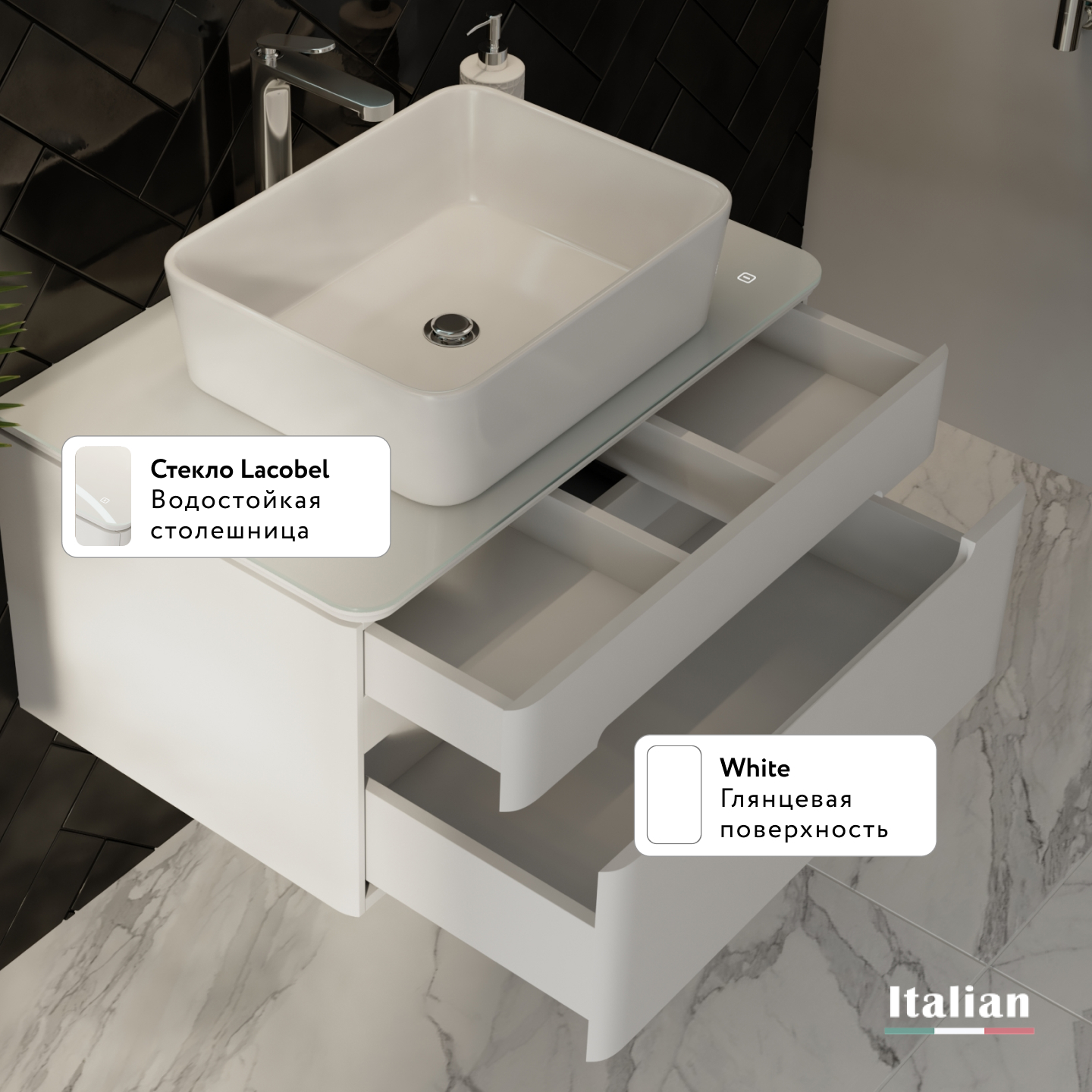 Тумба устойчива к царапинам и перепаду температур. Столешница из стекла Lacobel придает легкость композиции. Бесконтактное включение подсветки. Система плавного закрывания ящиков. Внутренний дополнительный ящик для мелочей. Само название коллекции говорит о том, что одним из основных достоинств данного комплекта является подсветка. Свет столешницы тумбы можно регулировать от деликатного мягкого до более яркого.|