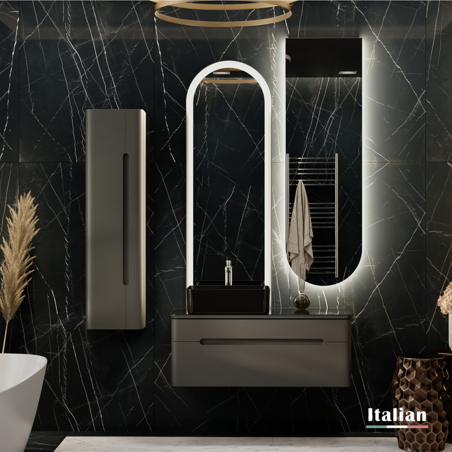Тумба для ванной встроенным Медиа Модулем. В столешницу встроен многофункциональный модуль, который показывает температуру, время и дату, а также Bluetooth система с двумя динамиками.