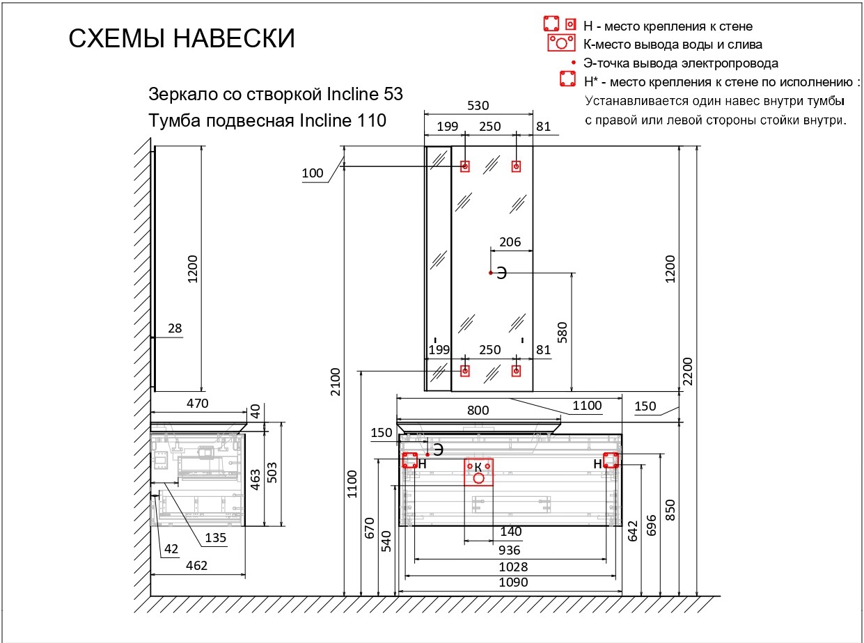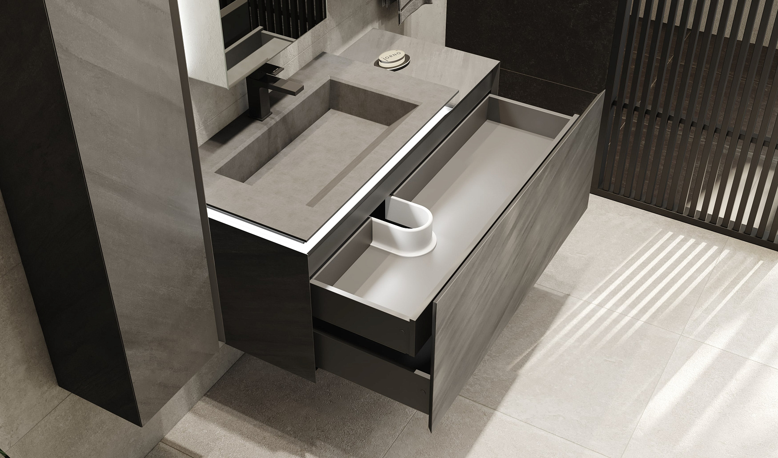 Подвесная тумба Incline 110 оснащена полочкой и выдвижным ящиком с интегрированной ручкой в верхней части фасада ящика.