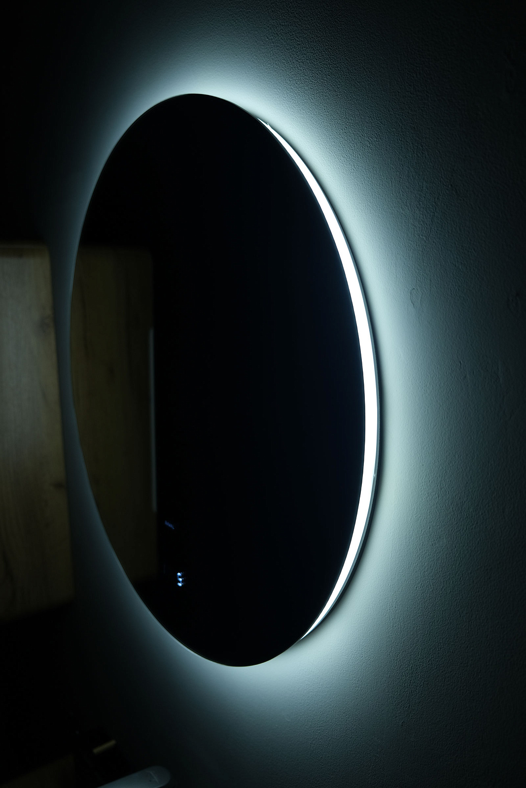 Контурное свечение выделяет его на фоне окружающих предметов и подчеркивает фактуру отделки (необычная штукатурка, рельефная плитка). Рассеиватель в край зеркала с диодной подсветкой создает эффект парящего в воздухе зеркала. Зеркало оснащено датчиком включения на взмах, встроенными часами и логотипом бренда Raval с подсветкой.