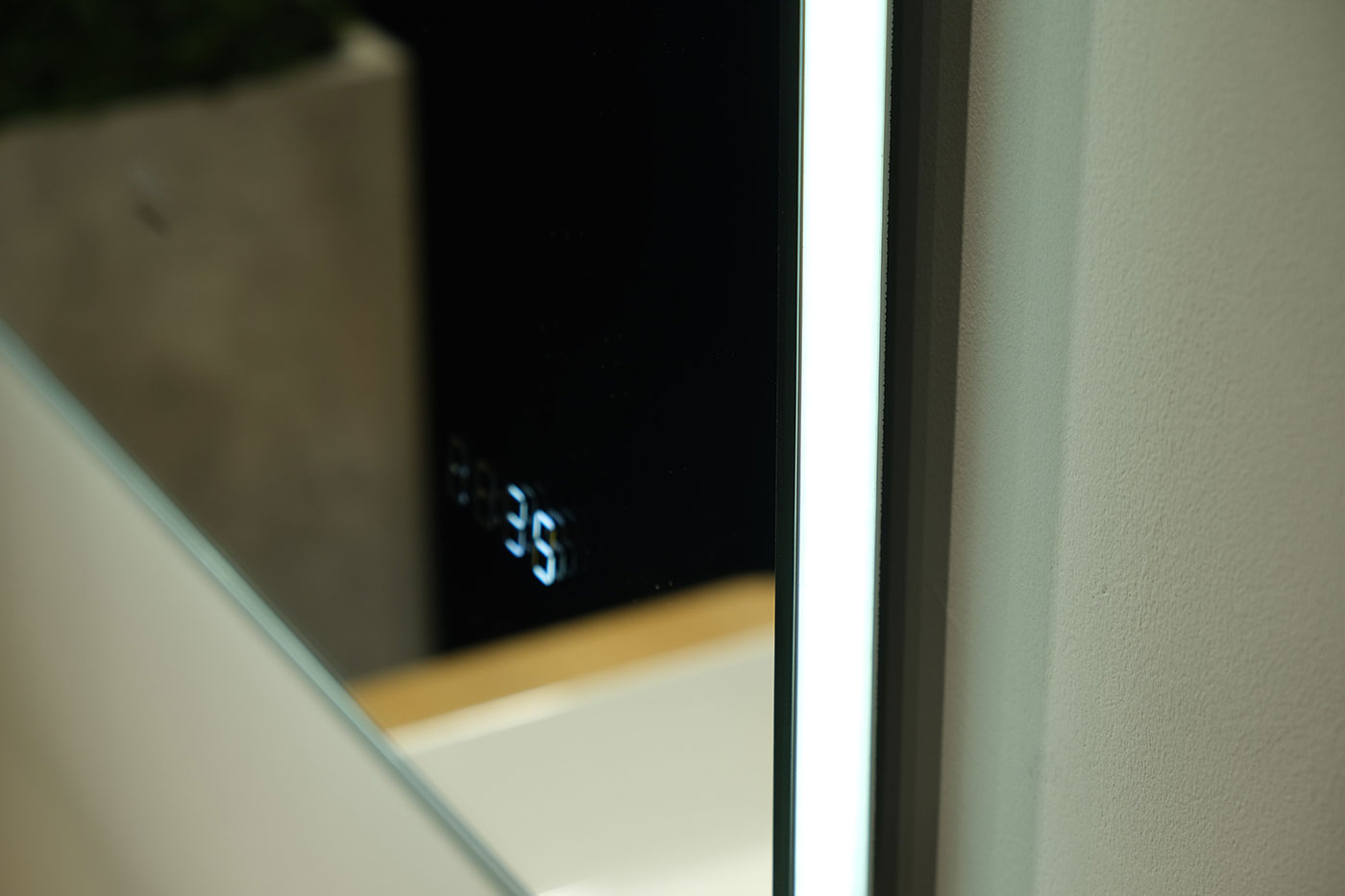 Контурное свечение выделяет его на фоне окружающих предметов и подчеркивает фактуру отделки (необычная штукатурка, рельефная плитка). Рассеиватель в край зеркала с диодной подсветкой создает эффект парящего в воздухе зеркала. Зеркало оснащено датчиком включения на взмах, встроенными часами и логотипом бренда Raval с подсветкой.