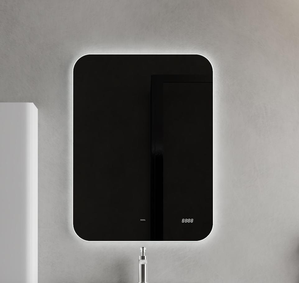 Контурное свечение выделяет его на фоне окружающих предметов и подчеркивает фактуру отделки (необычная штукатурка, рельефная плитка). Рассеиватель в край зеркала с диодной подсветкой создает эффект парящего в воздухе зеркала. Зеркало оснащено датчиком включения на взмах, встроенными часами и логотипом бренда Raval с подсветкой.