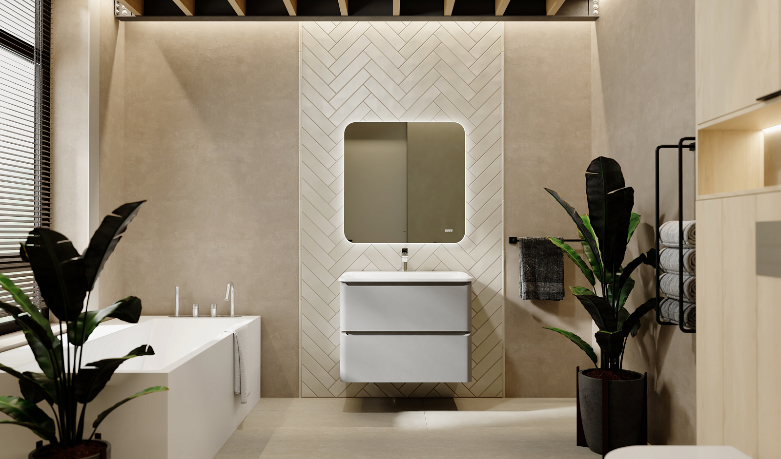 Контурное свечение выделяет его на фоне окружающих предметов и подчеркивает фактуру отделки (необычная штукатурка, рельефная плитка). Рассеиватель в край зеркала с диодной подсветкой создает эффект парящего в воздухе зеркала. Зеркало оснащено датчиком включения на взмах, встроенными часами и логотипом бренда Raval с подсветкой.