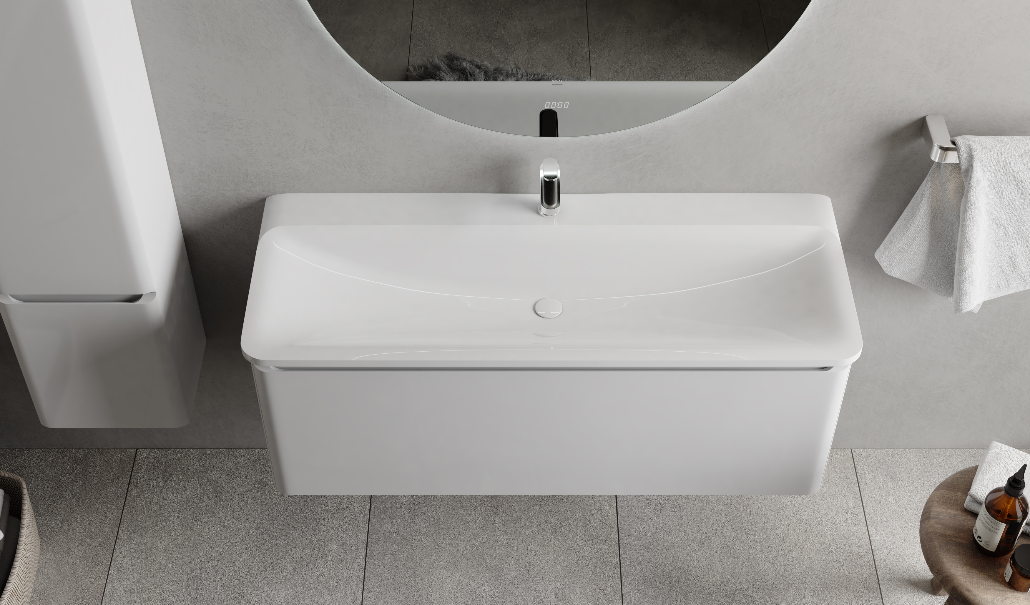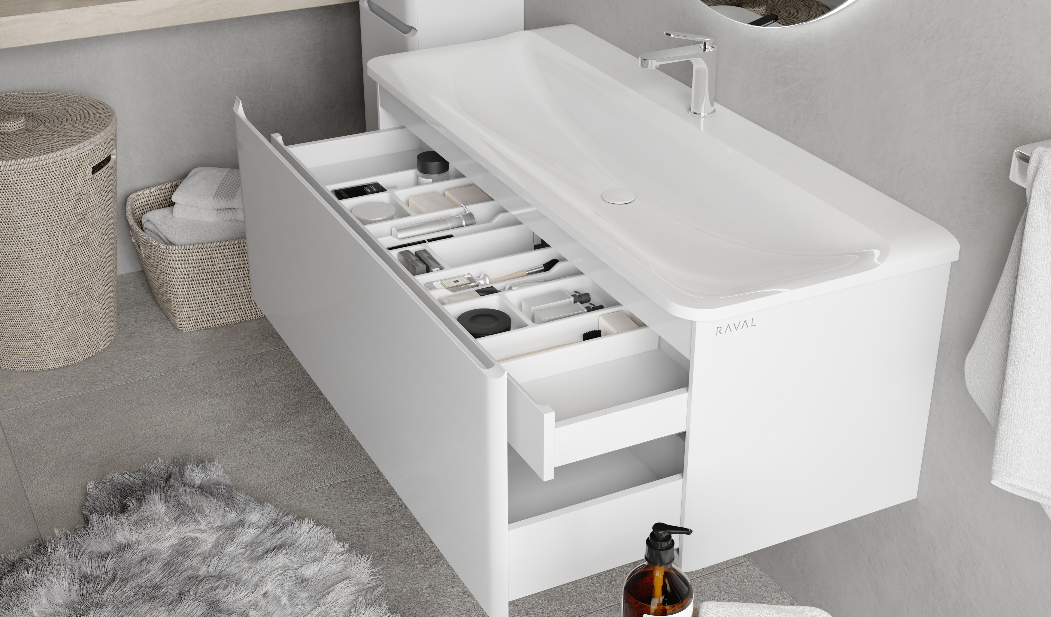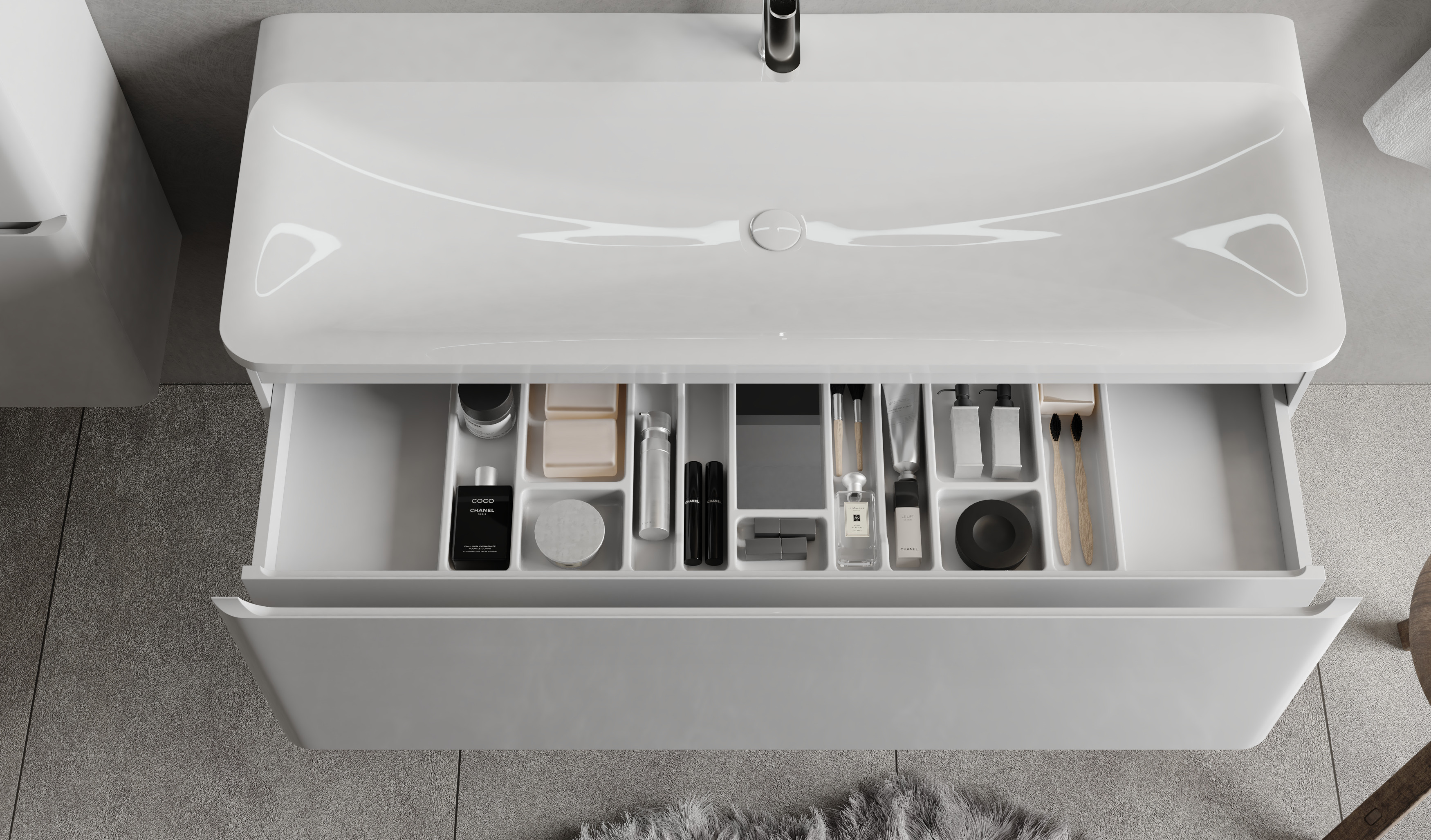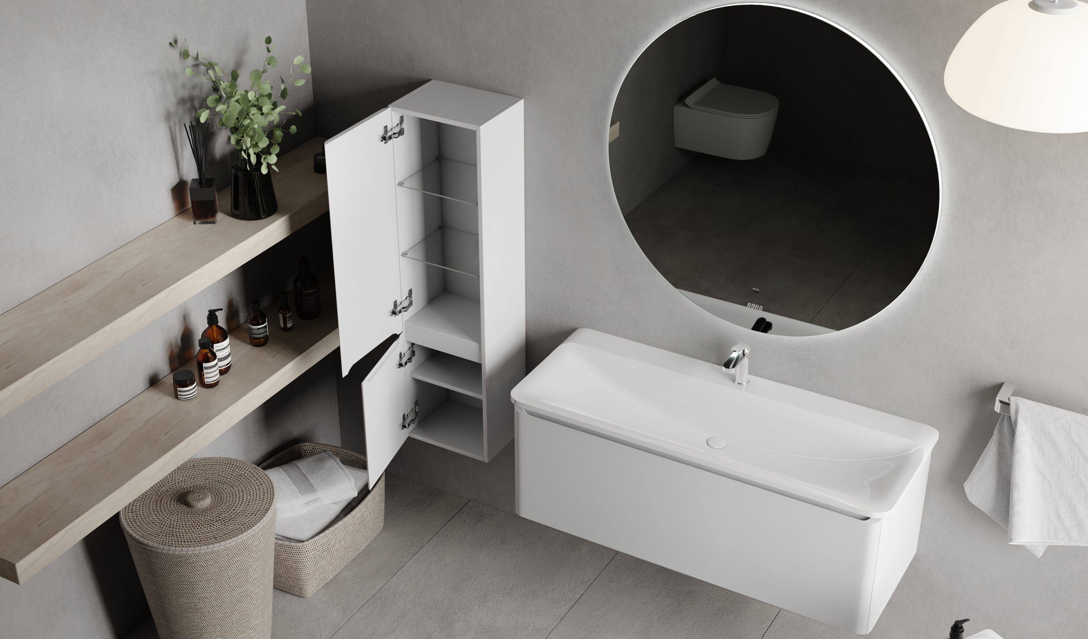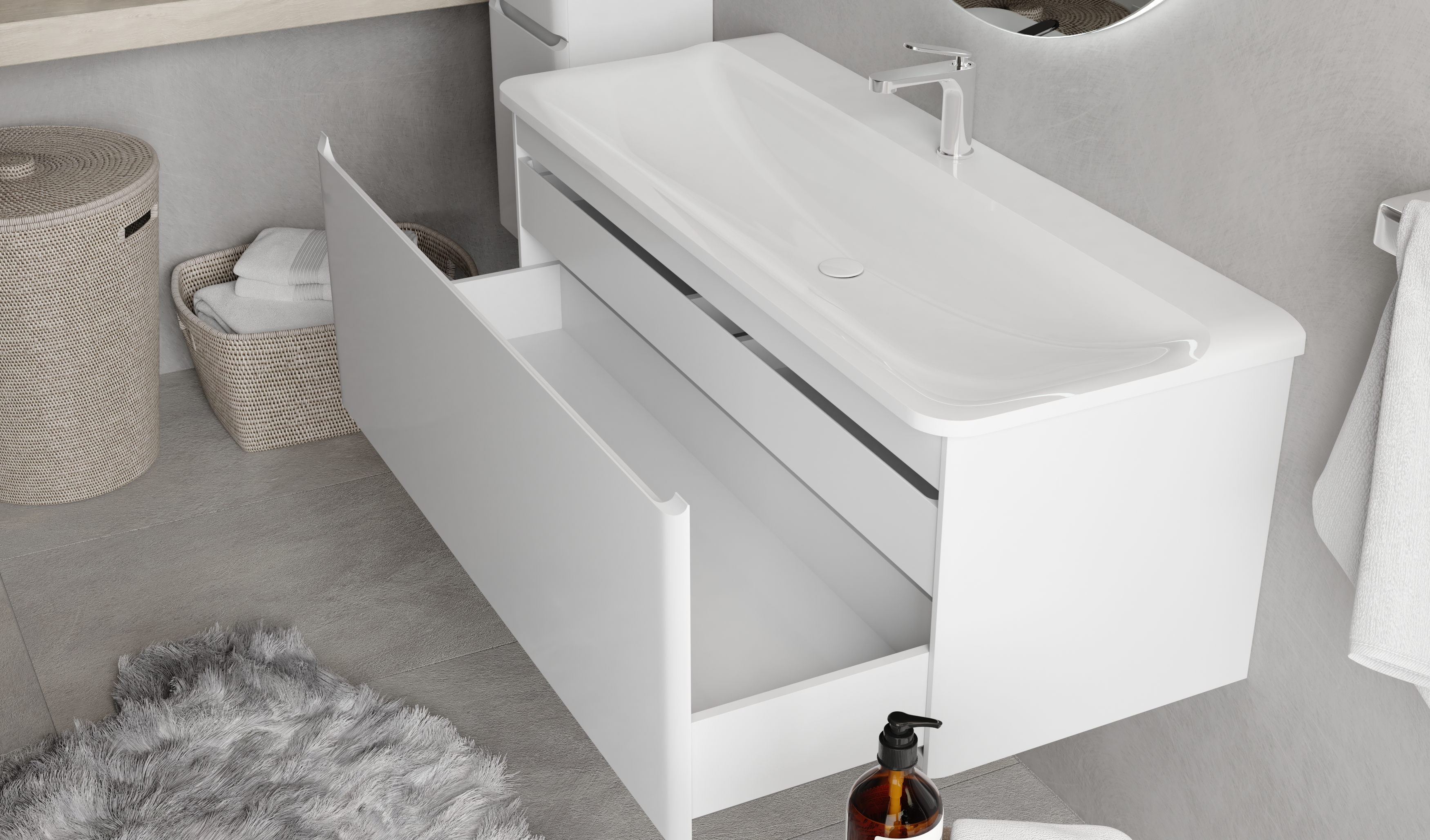 Коллекция Welto разработана в сдержанном, современном стиле. Компактный выдвижной ящик освобождает пространство под тумбой для дополнительного использования. Встроенный органайзер помогает удобно разместить все мелкие предметы и поддерживать порядок в ванной комнате. Плавное скругление углов и интегрированные ручки делают комплект мебели максимально безопасным. Полноразмерная вкладная раковина авторского дизайна с пологими бортами проста в уходе. Корпуса и фасады пенала и тумбы изготовлены из МДФ и покрыты глянцевой пленкой ПВХ.