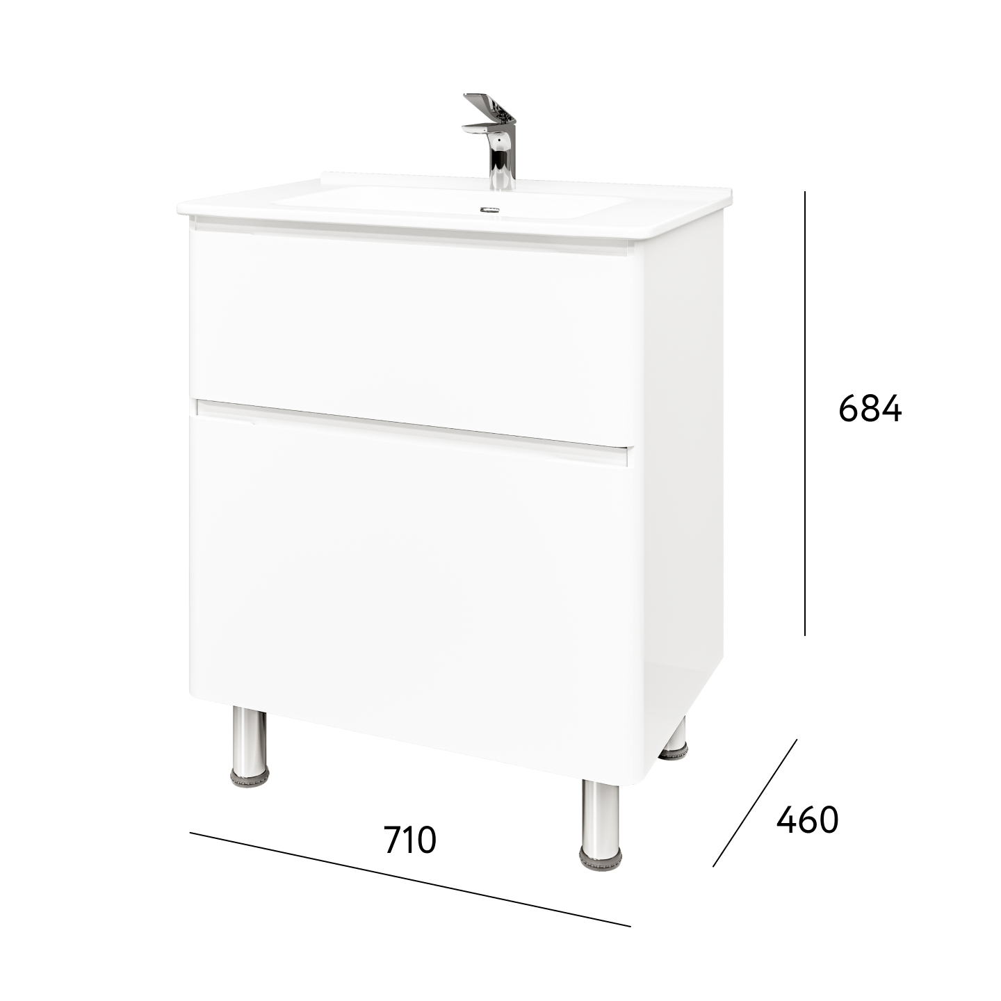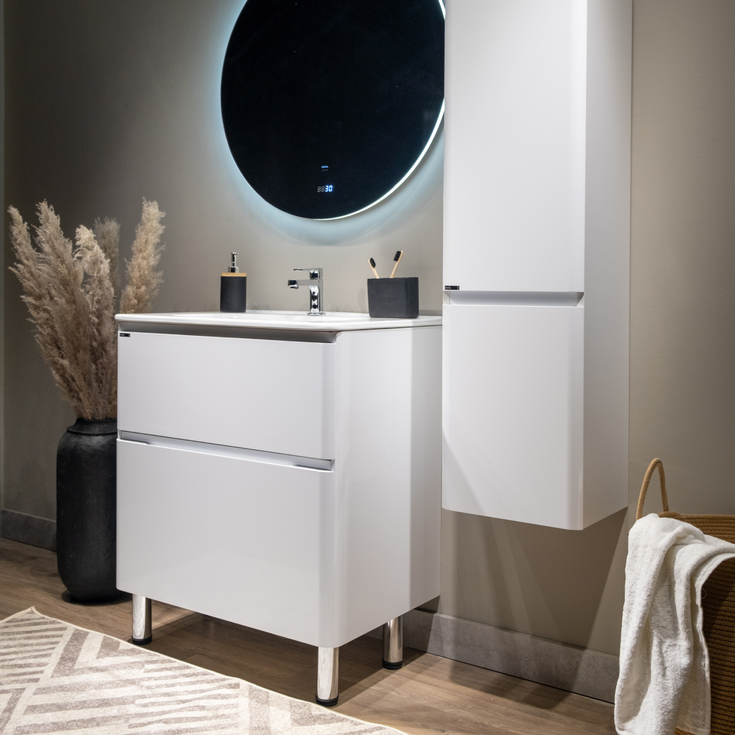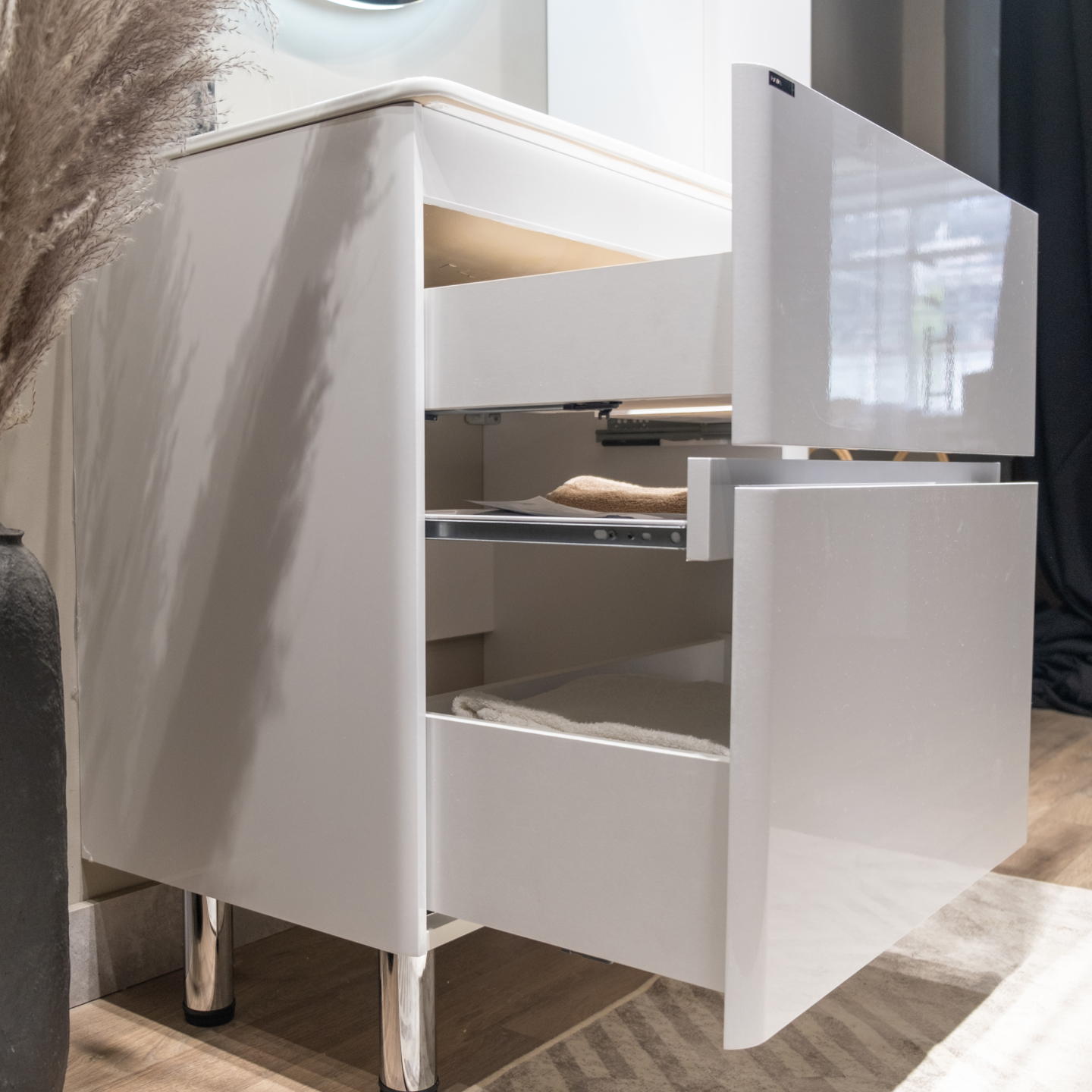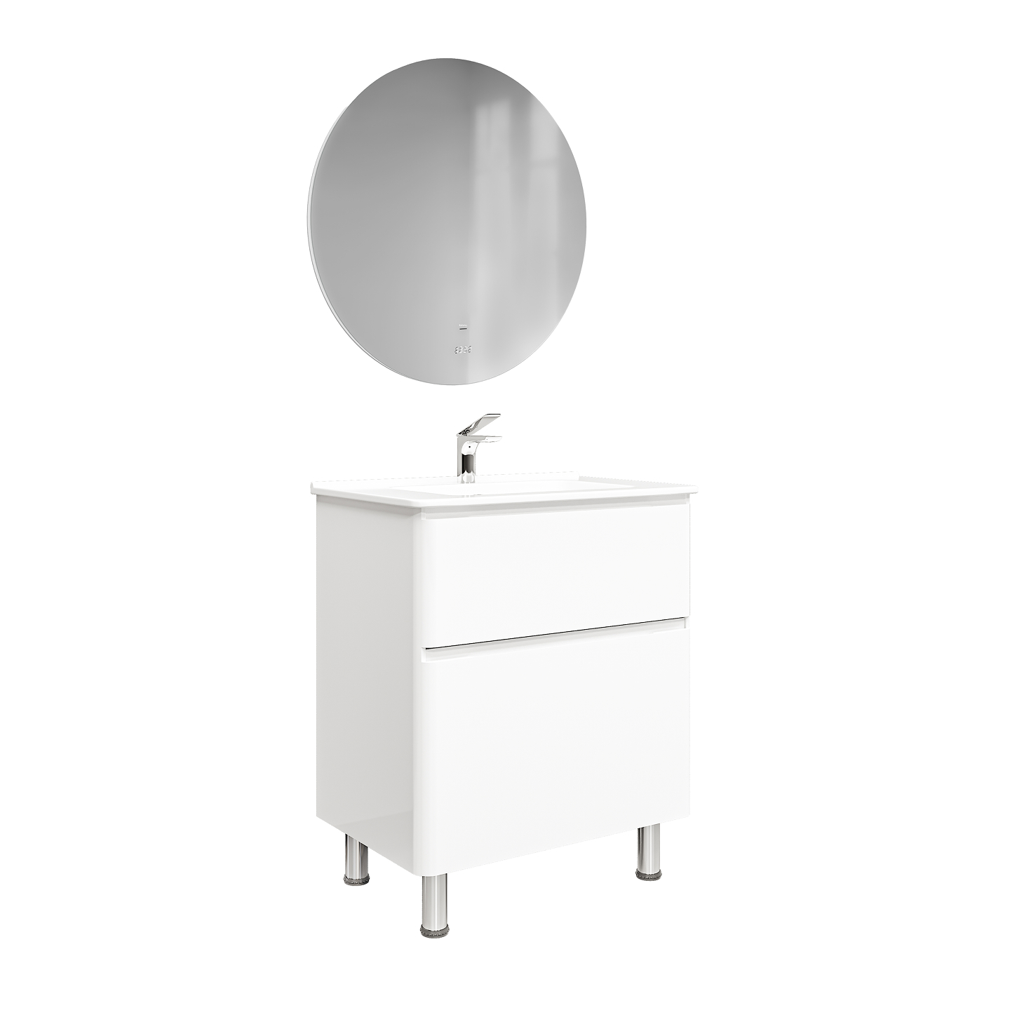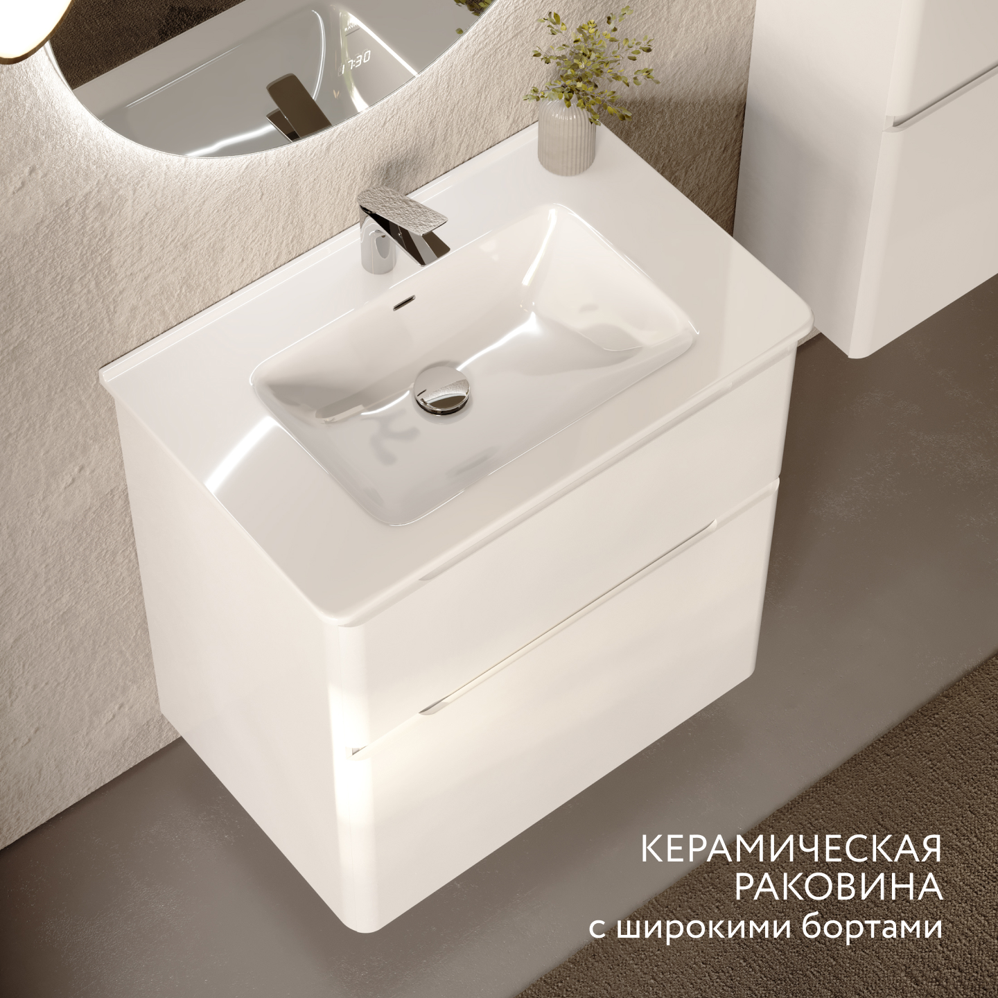 Скругленные углы мебели повторяют плавные изгибы чаши раковины, придавая комплекту мягкости и уюта.