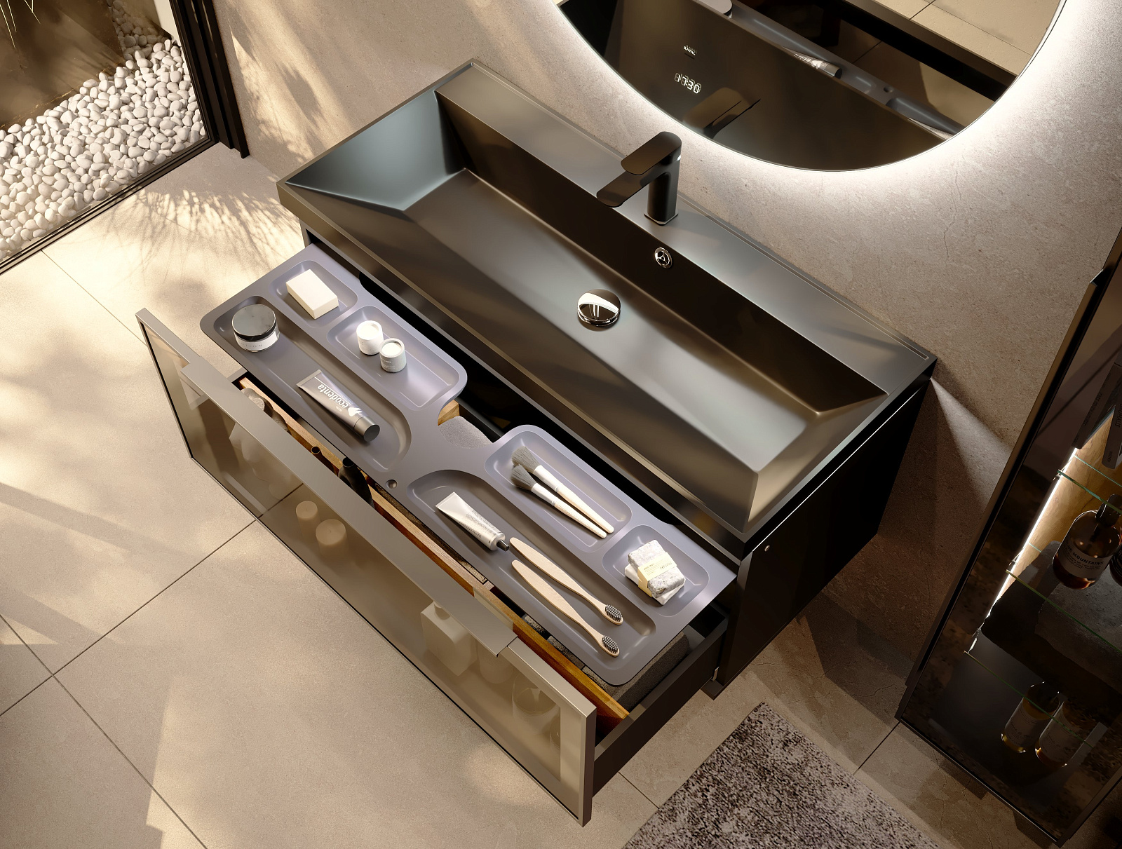 Выдвижной ящик-органайзер помогает поддерживать порядок в ящиках тумбы и обеспечивает лёгкий доступ к необходимым вещам. Чёрная вкладная раковина с подсветкой по периметру прекрасно вписываются в общую концепцию гармонии противоречий – силы и легкости. Влагостойкие корпуса и внутренние элементы обеспечивают мебели надёжность и долговечность.