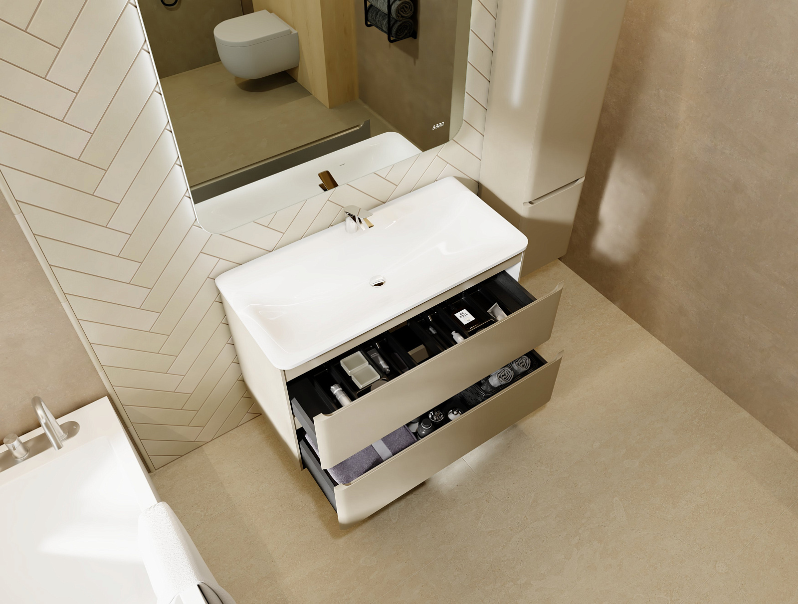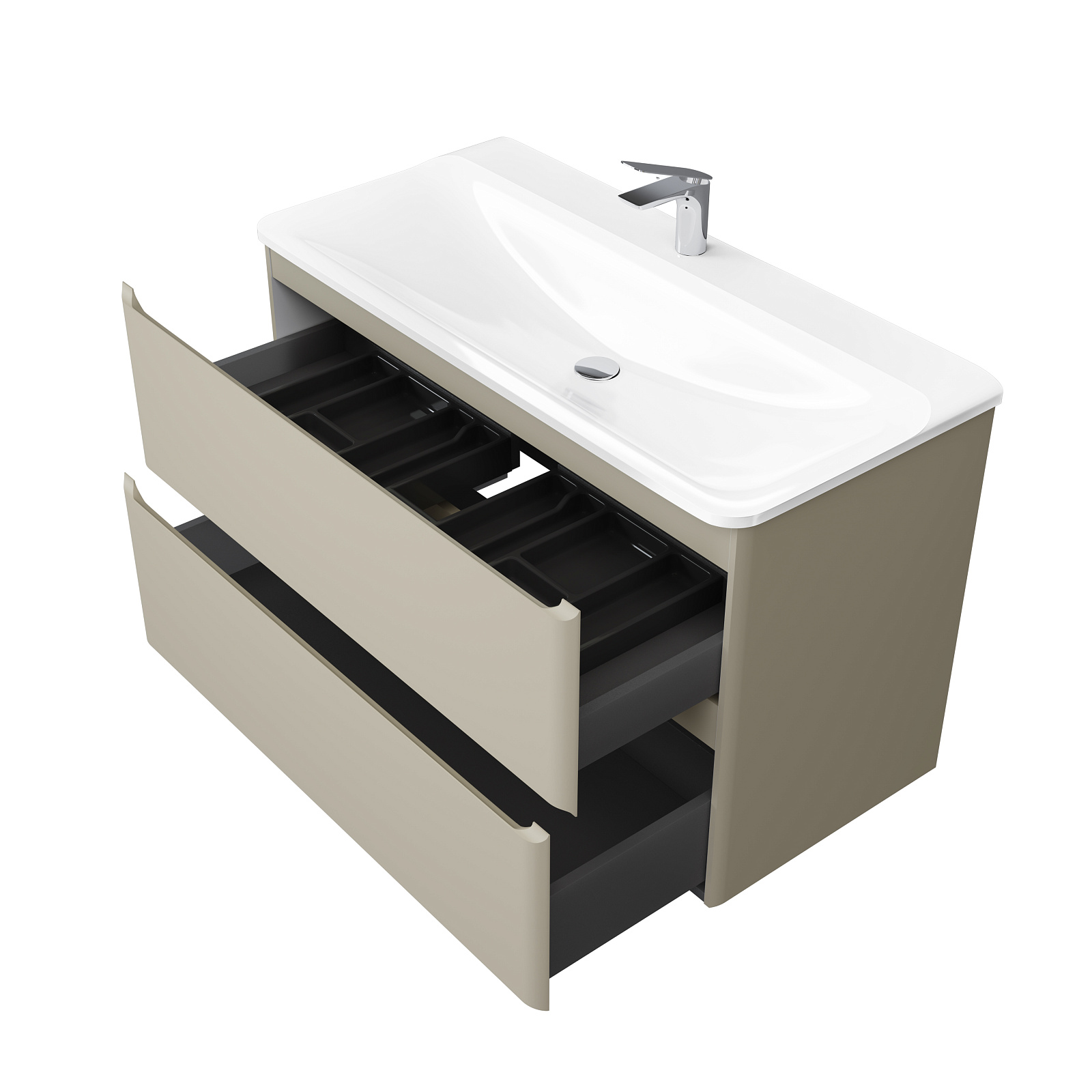 Коллекция Welto с 2 ящиками разработана в сдержанном, современном стиле. Встроенный органайзер помогает удобно разместить все мелкие предметы и поддерживать порядок в ванной комнате. Плавное скругление углов и интегрированные ручки делают комплект мебели максимально безопасным. Полноразмерная вкладная раковина авторского дизайна с пологими бортами проста в уходе. Корпуса и фасады пенала и тумбы изготовлены из МДФ и покрыты глянцевой пленкой ПВХ.