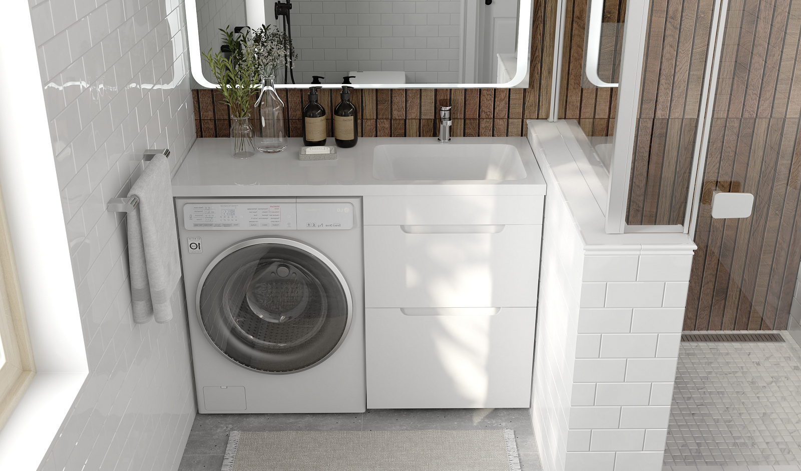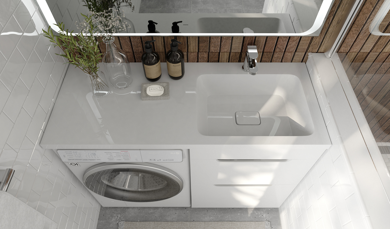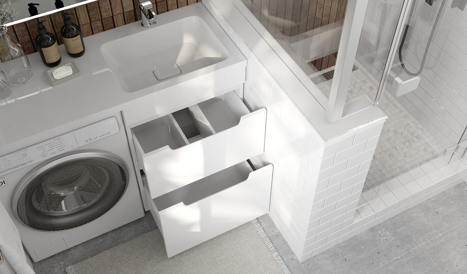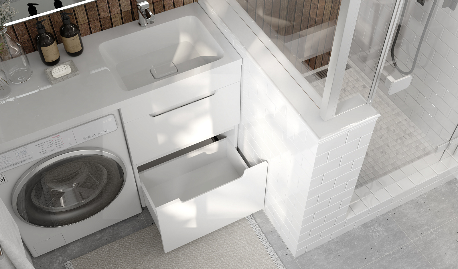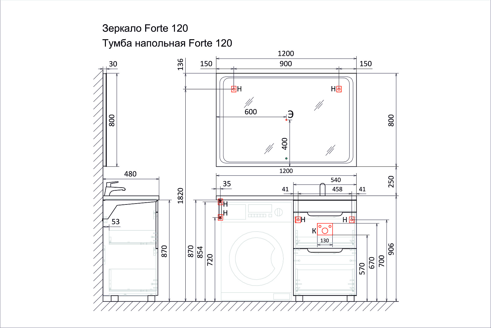 Комплект мебели для ванных комнат Forte под стиральную машину представлен в 2 размерах 110 и 120 см, возможна установка правой и левой раковин (литьевой мрамор).