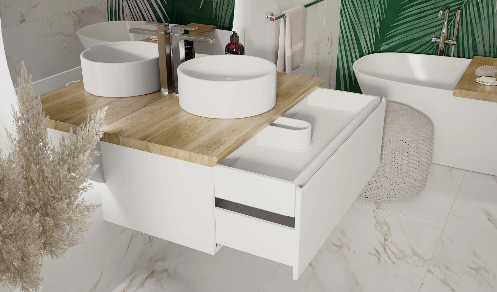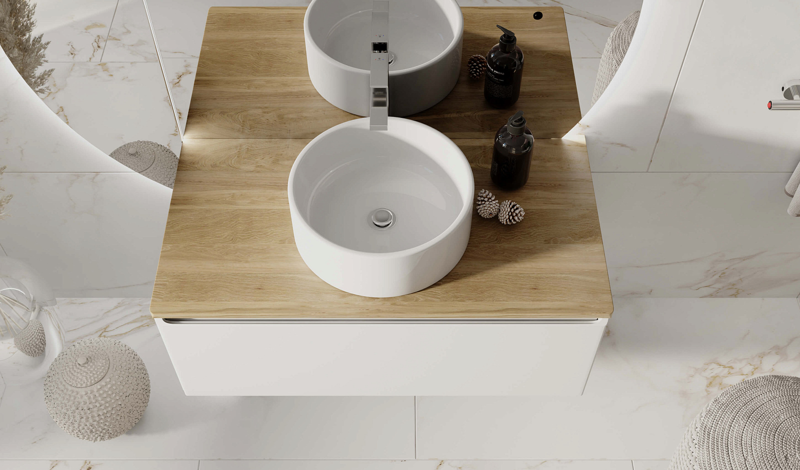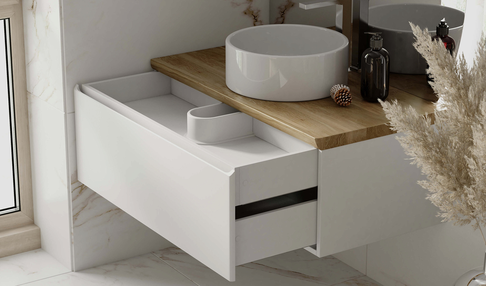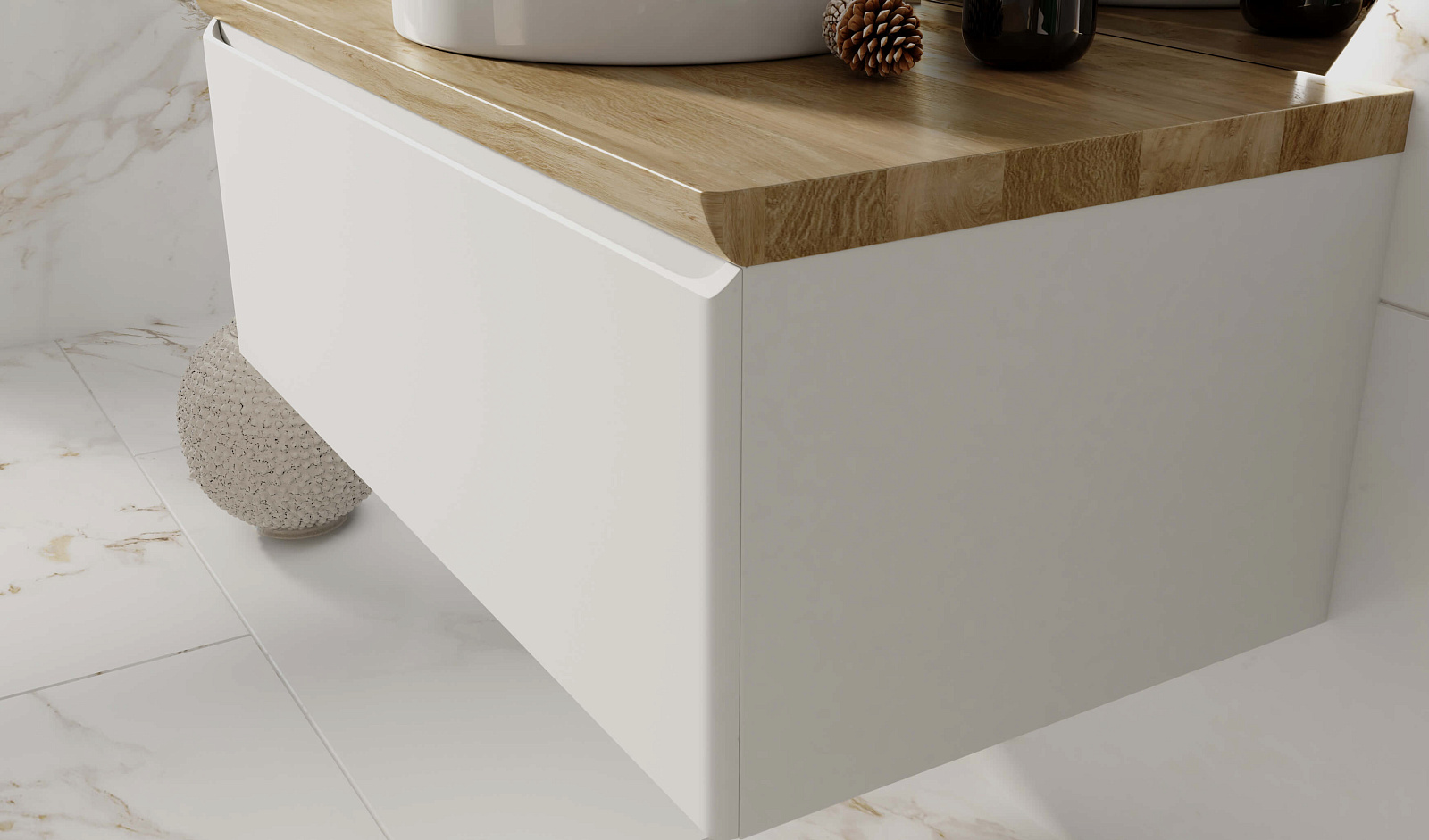 Корпус тумбы с изящной интегрированной ручкой на фасаде выполнен из МДФ в белой глянцевой пленке ПВХ. Столешница из цельного массива бука.