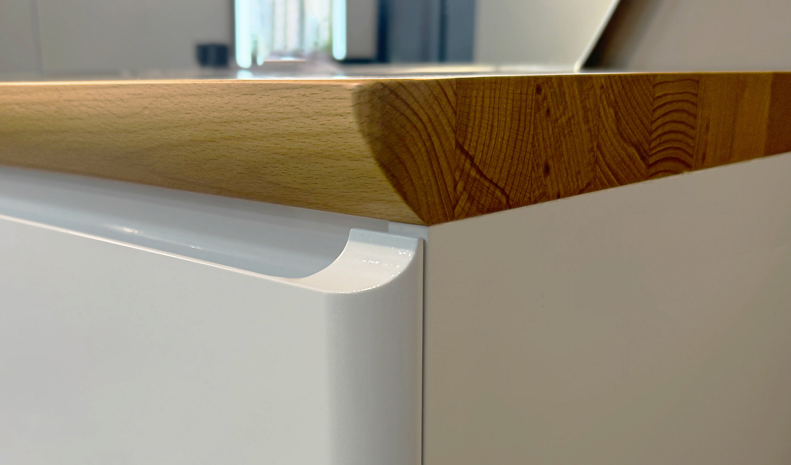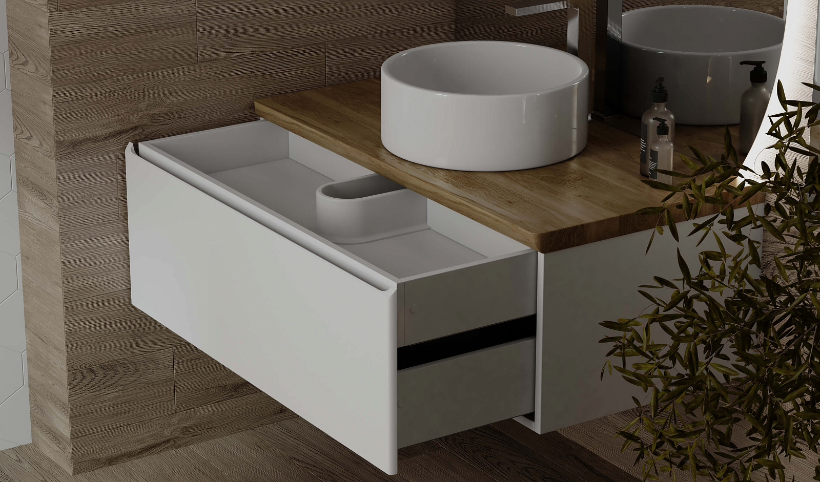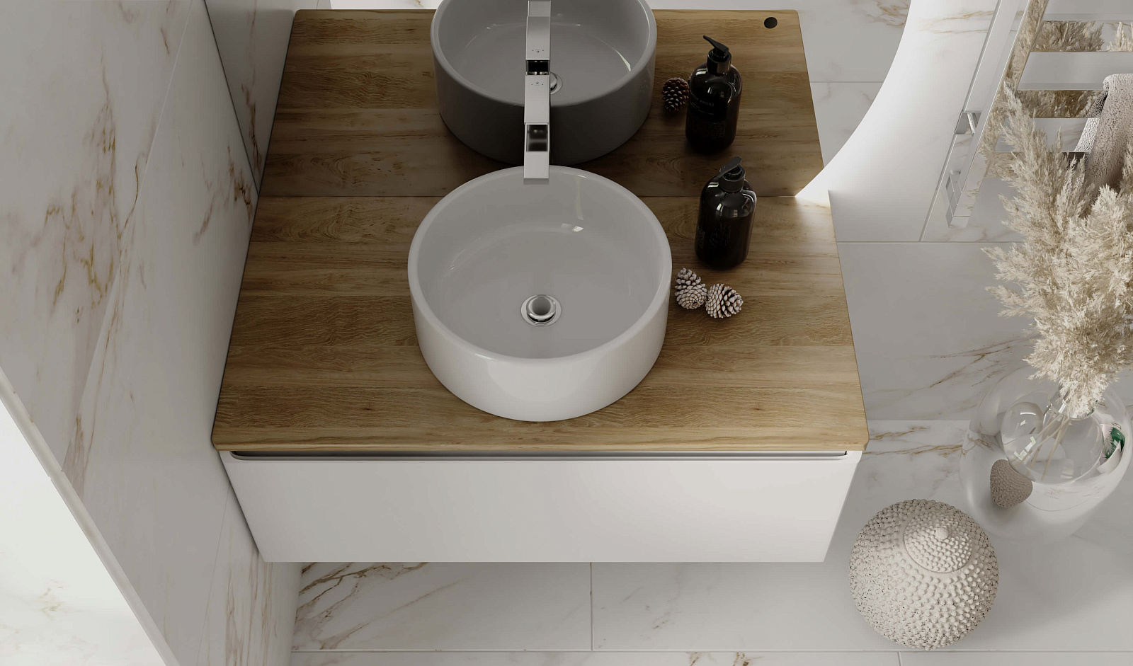 Корпус тумбы с изящной интегрированной ручкой на фасаде выполнен из МДФ в белой глянцевой пленке ПВХ. Столешница из цельного массива бука.