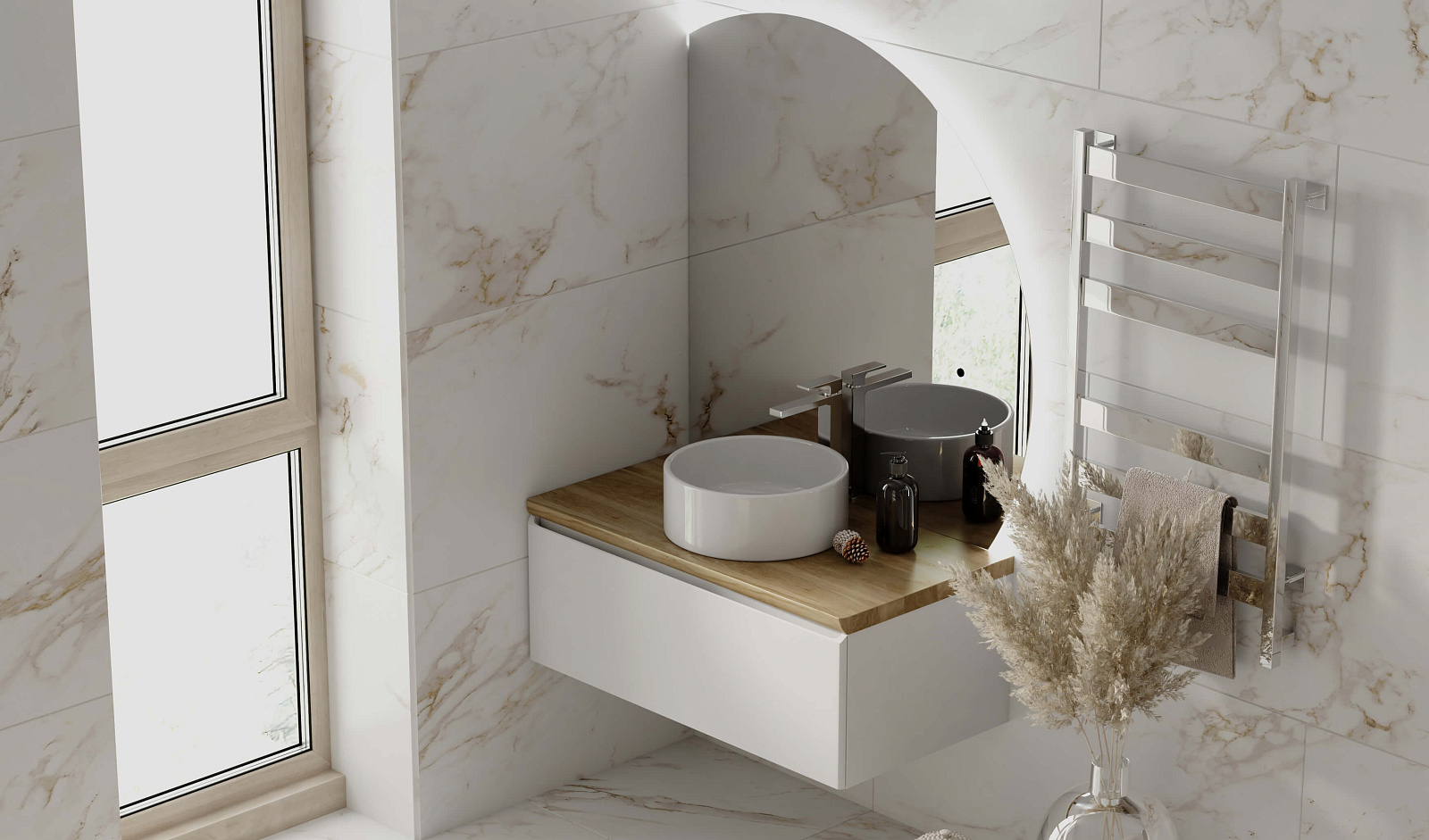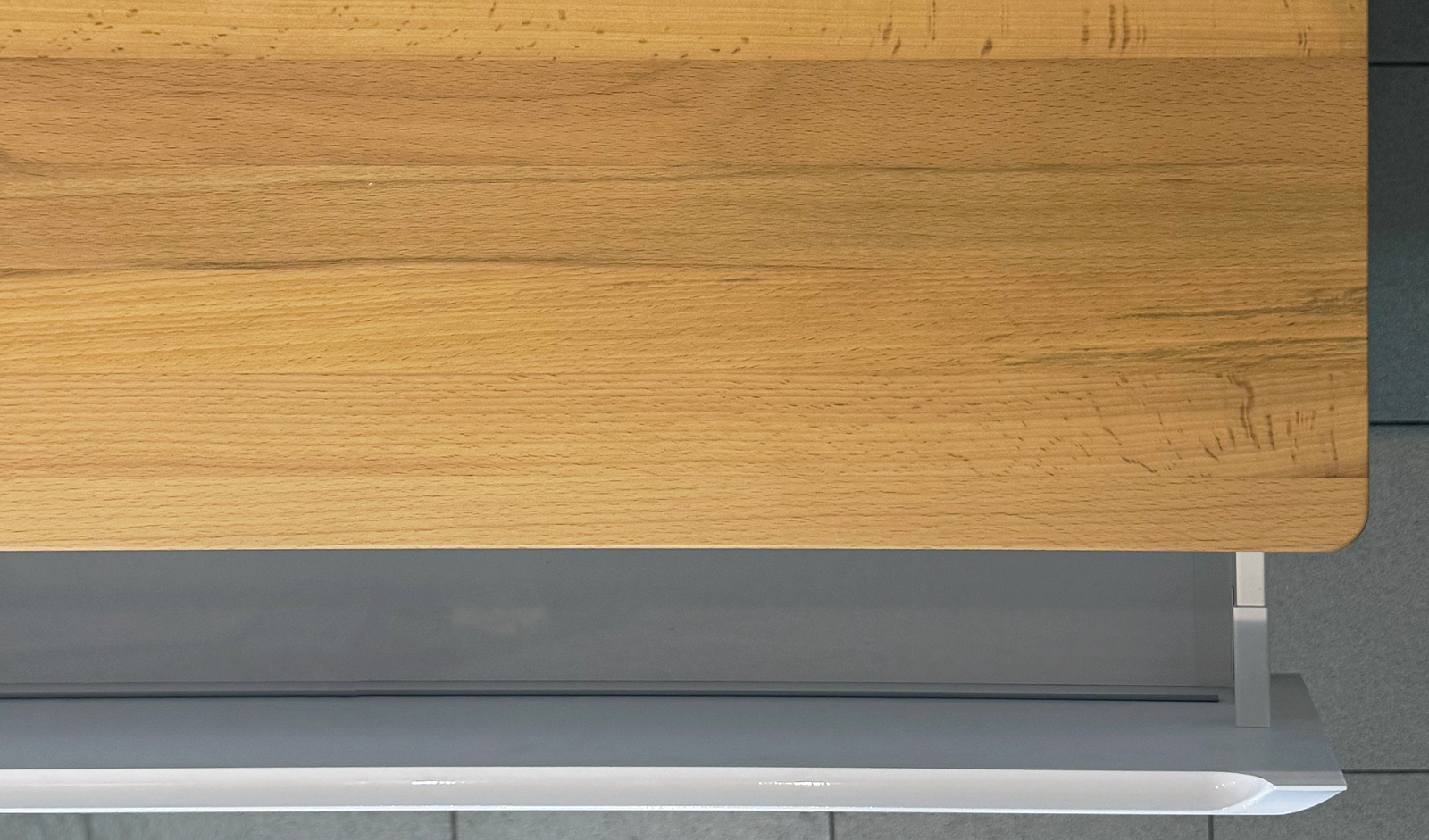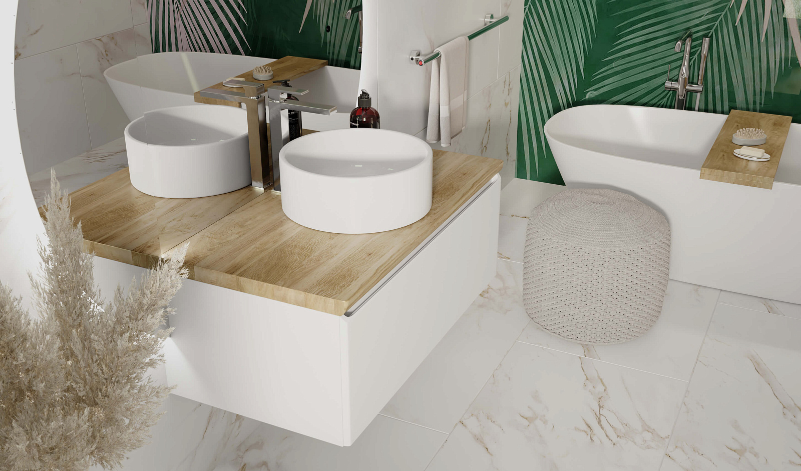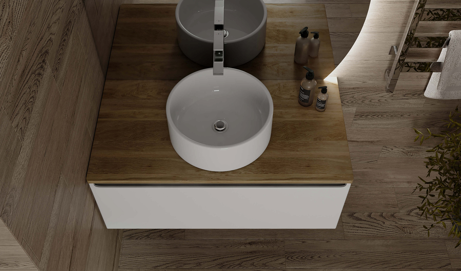 Корпус тумбы с изящной интегрированной ручкой на фасаде выполнен из МДФ в белой глянцевой пленке ПВХ. Столешница из цельного массива бука.