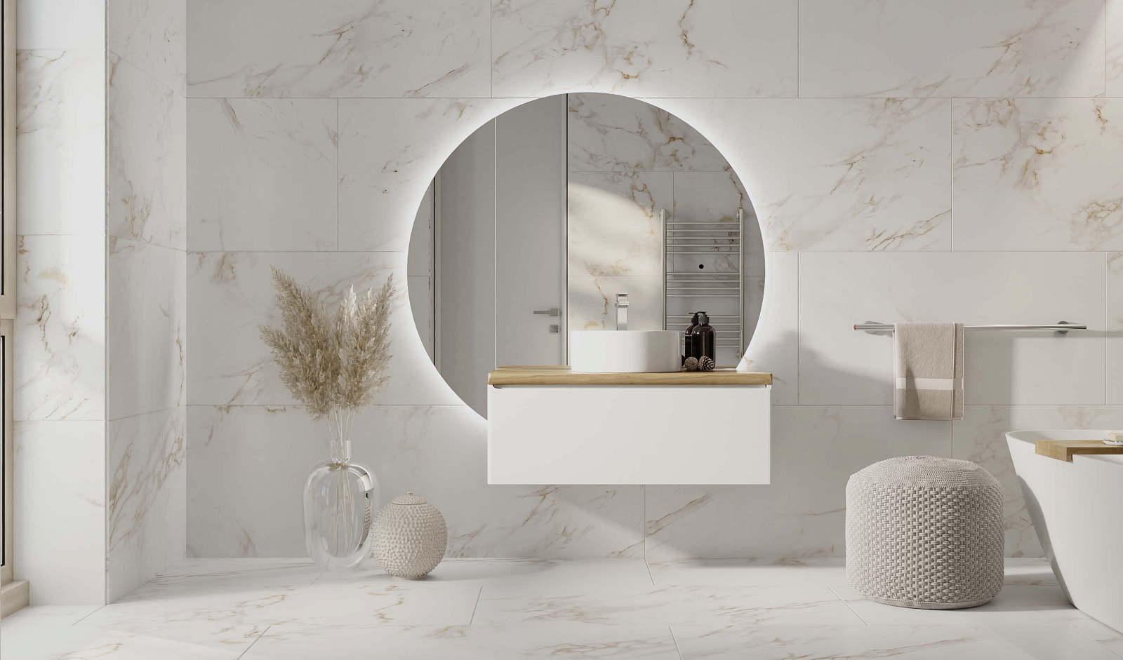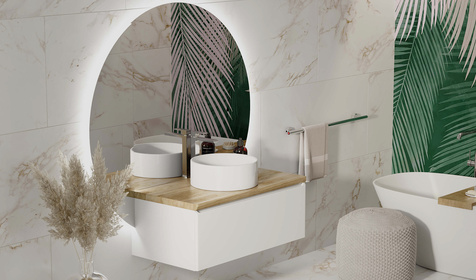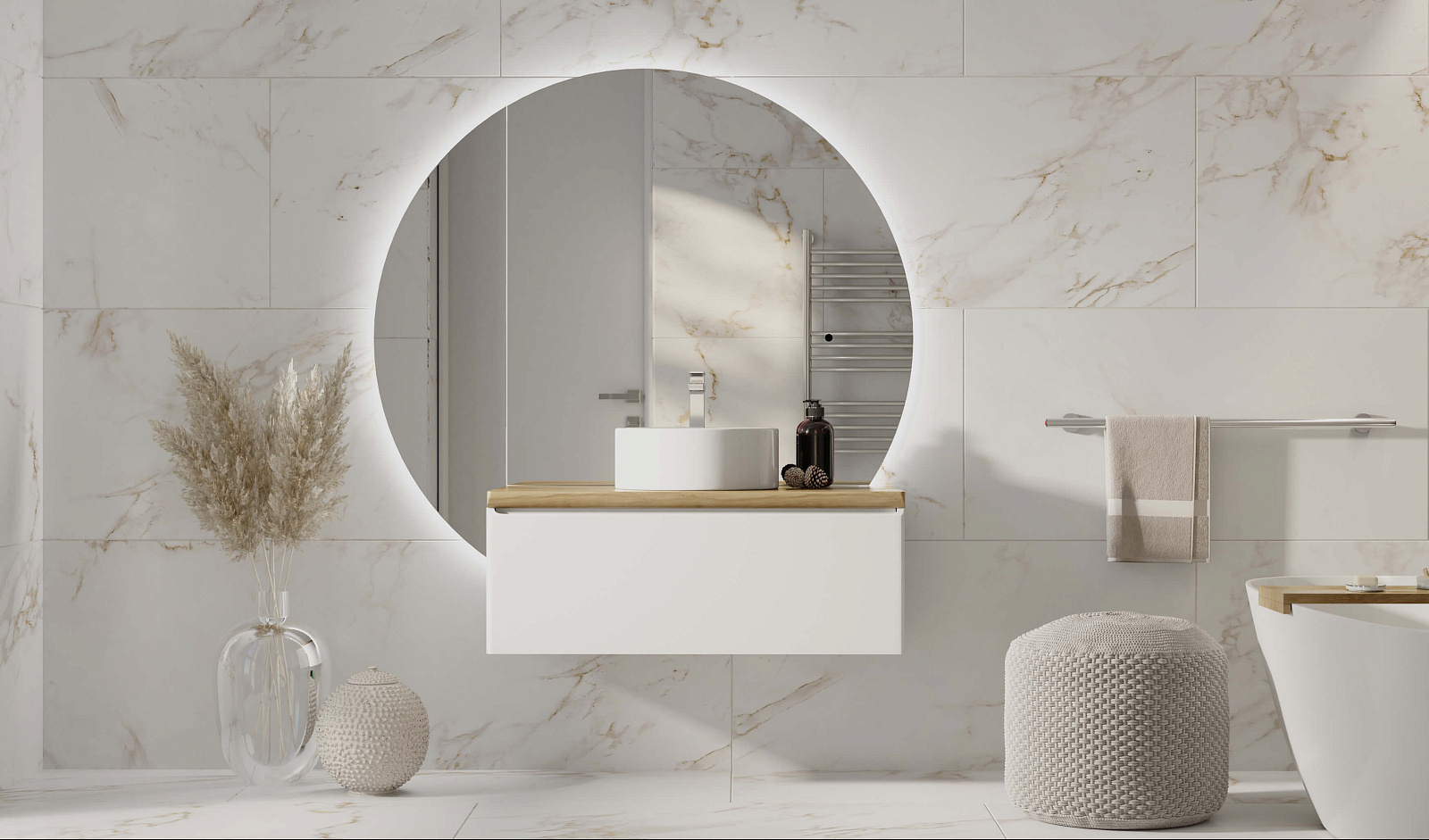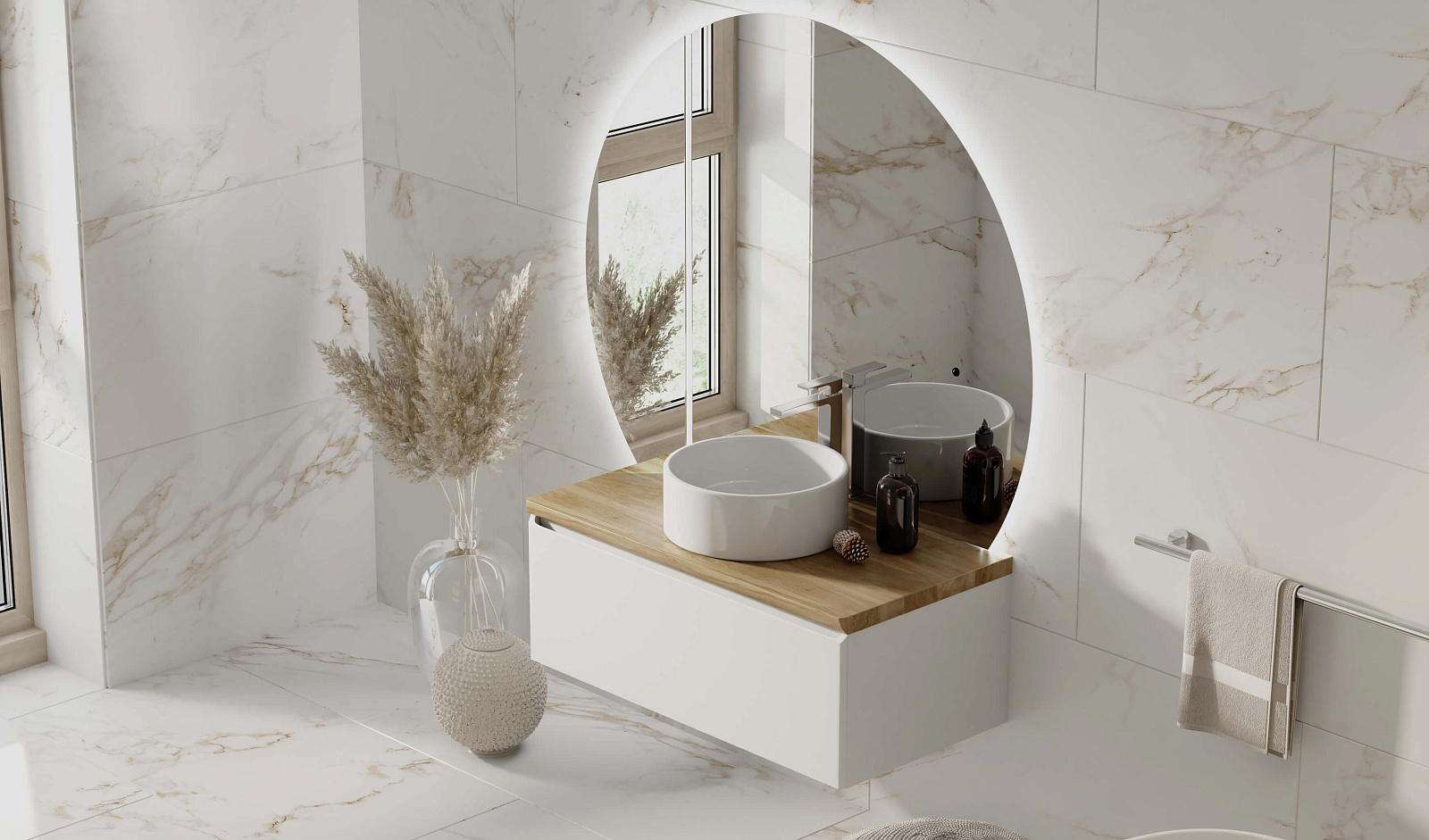 Зеркало оснащено светодиодной подсветкой по периметру с бесконтактным включателем. Возможна комплектация тремя разными вариантами зеркала. У тумбы есть большой вместительный ящик с системой метабокс дополнительный скрытый ящик, который увеличивает место хранения.