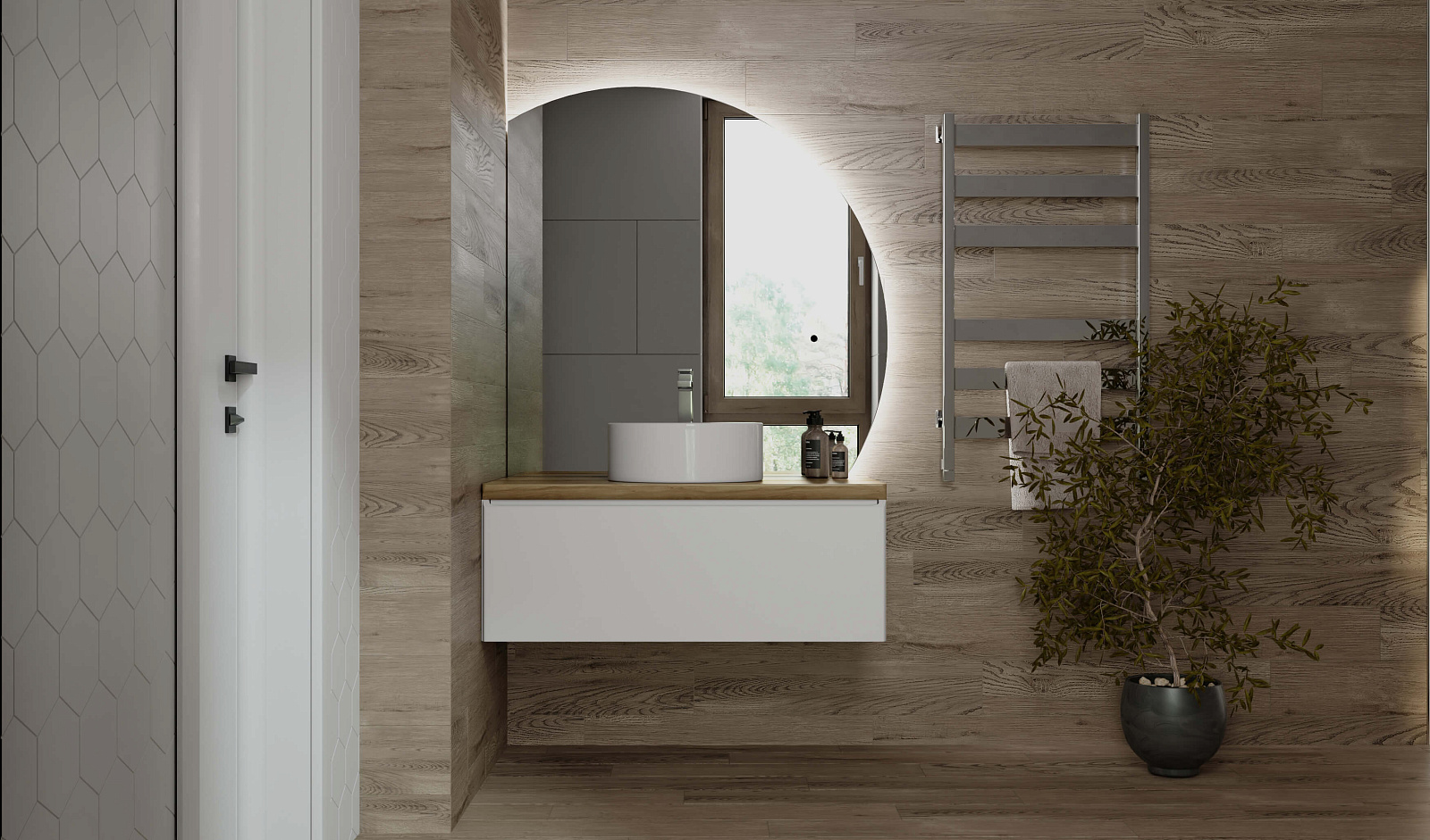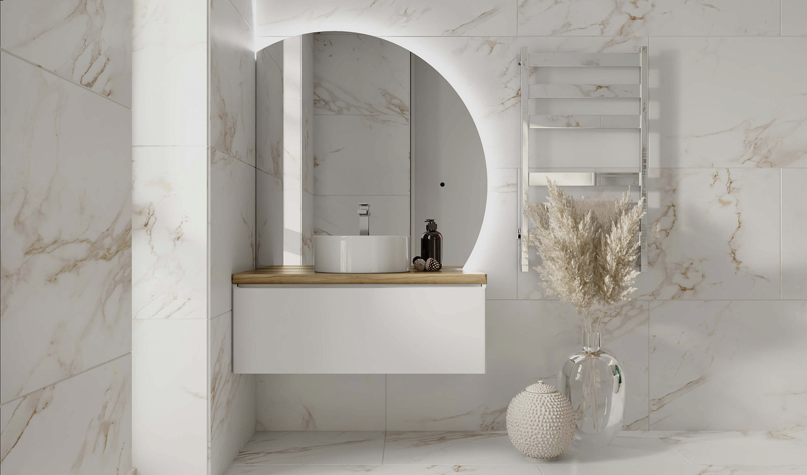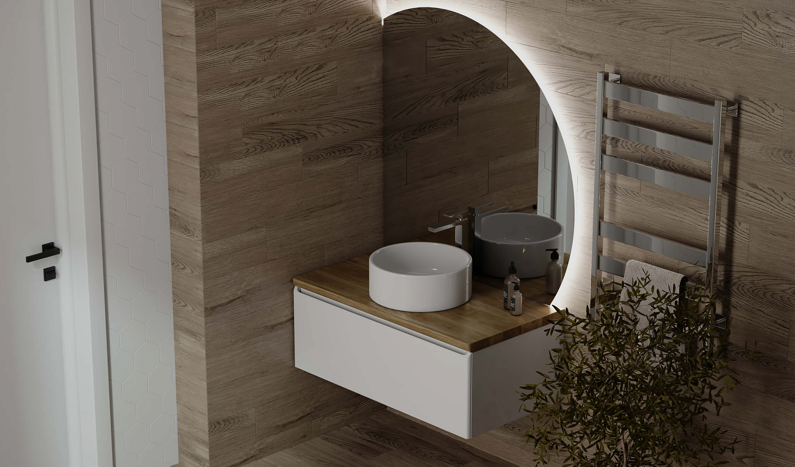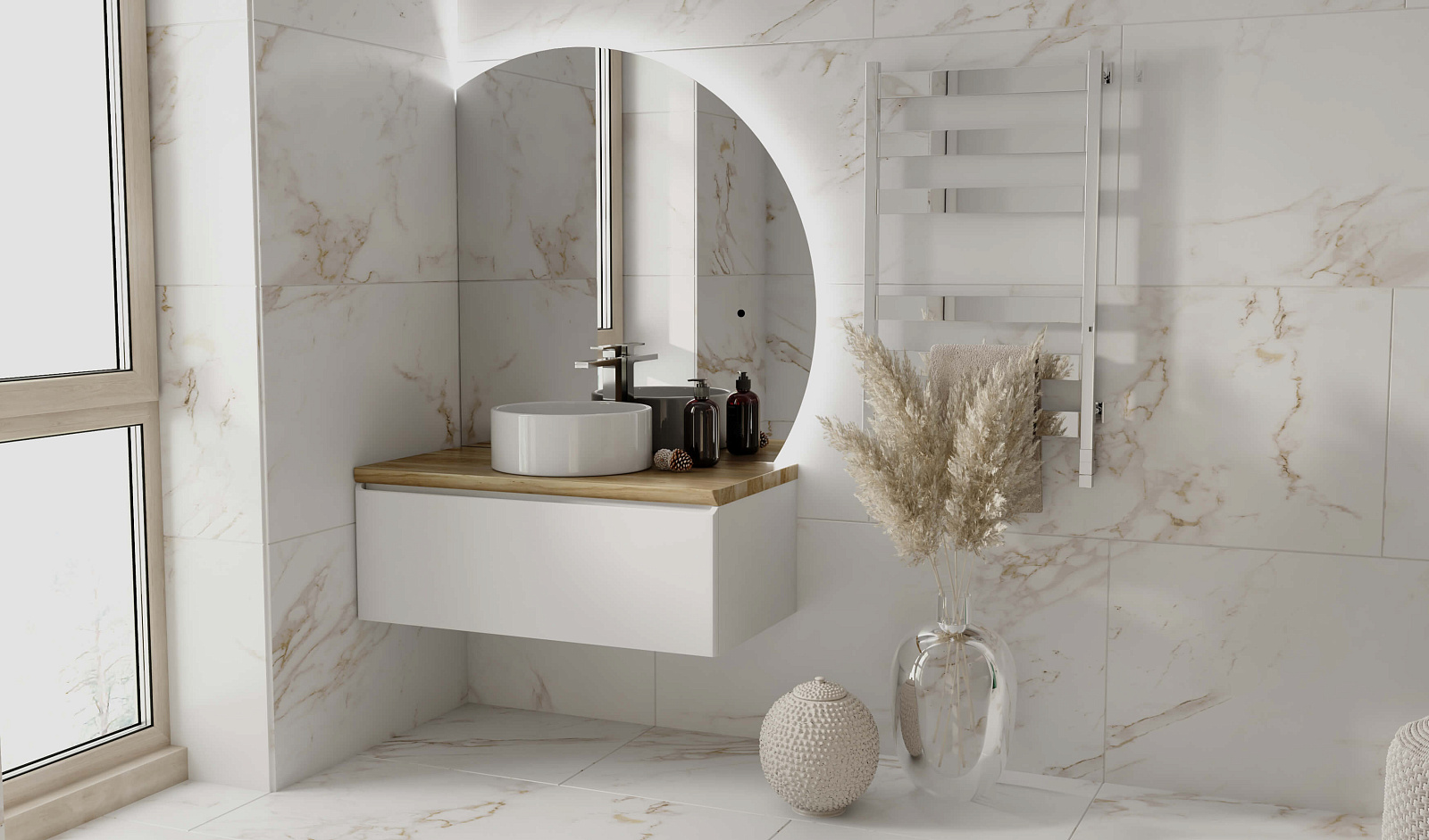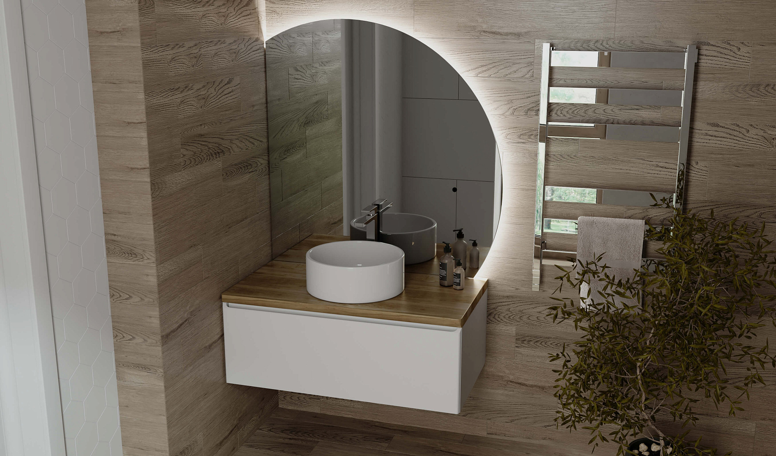 Зеркало оснащено светодиодной подсветкой по периметру с бесконтактным включателем. Возможна комплектация тремя разными вариантами зеркала. У тумбы есть большой вместительный ящик с системой метабокс дополнительный скрытый ящик, который увеличивает место хранения.