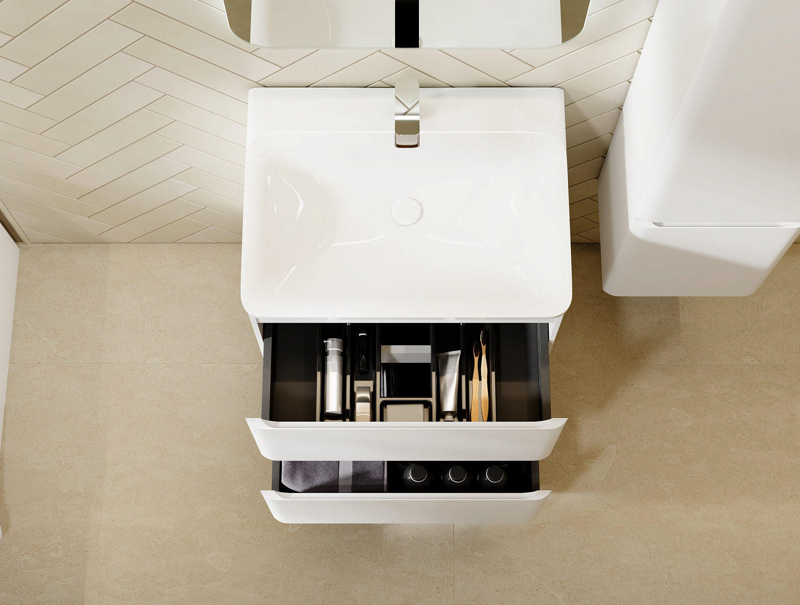 Коллекция Welto разработана в сдержанном, современном стиле. Компактный выдвижной ящик освобождает пространство под тумбой для дополнительного использования. Встроенный органайзер помогает удобно разместить все мелкие предметы и поддерживать порядок в ванной комнате. Плавное скругление углов и интегрированные ручки делают комплект мебели максимально безопасным. Полноразмерная вкладная раковина авторского дизайна с пологими бортами проста в уходе. Корпуса и фасады пенала и тумбы изготовлены из МДФ и покрыты глянцевой пленкой ПВХ.