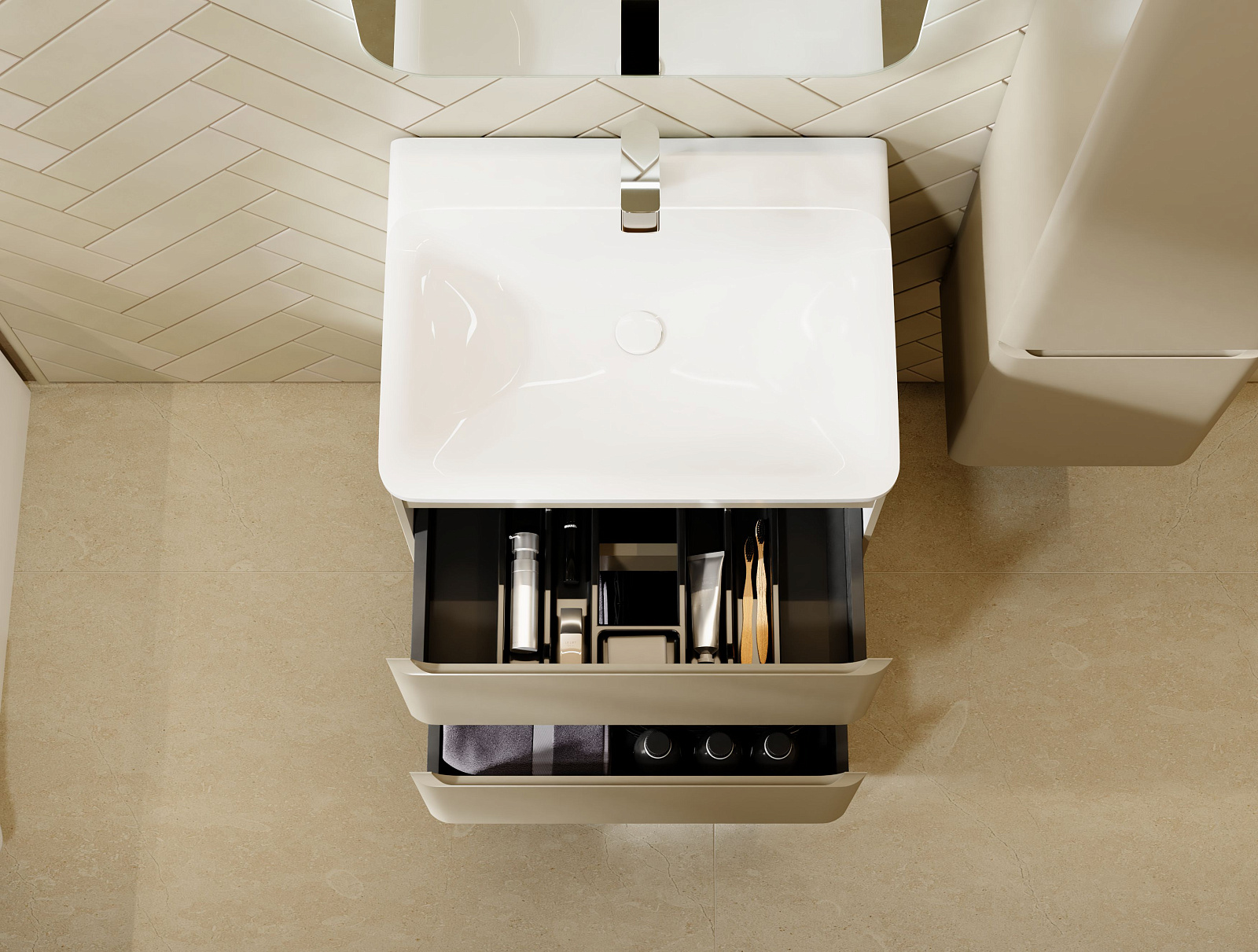 Коллекция Welto разработана в сдержанном, современном стиле. Компактный выдвижной ящик освобождает пространство под тумбой для дополнительного использования. Встроенный органайзер помогает удобно разместить все мелкие предметы и поддерживать порядок в ванной комнате. Плавное скругление углов и интегрированные ручки делают комплект мебели максимально безопасным. Полноразмерная вкладная раковина авторского дизайна с пологими бортами проста в уходе. Корпуса и фасады пенала и тумбы изготовлены из МДФ и покрыты глянцевой пленкой ПВХ.