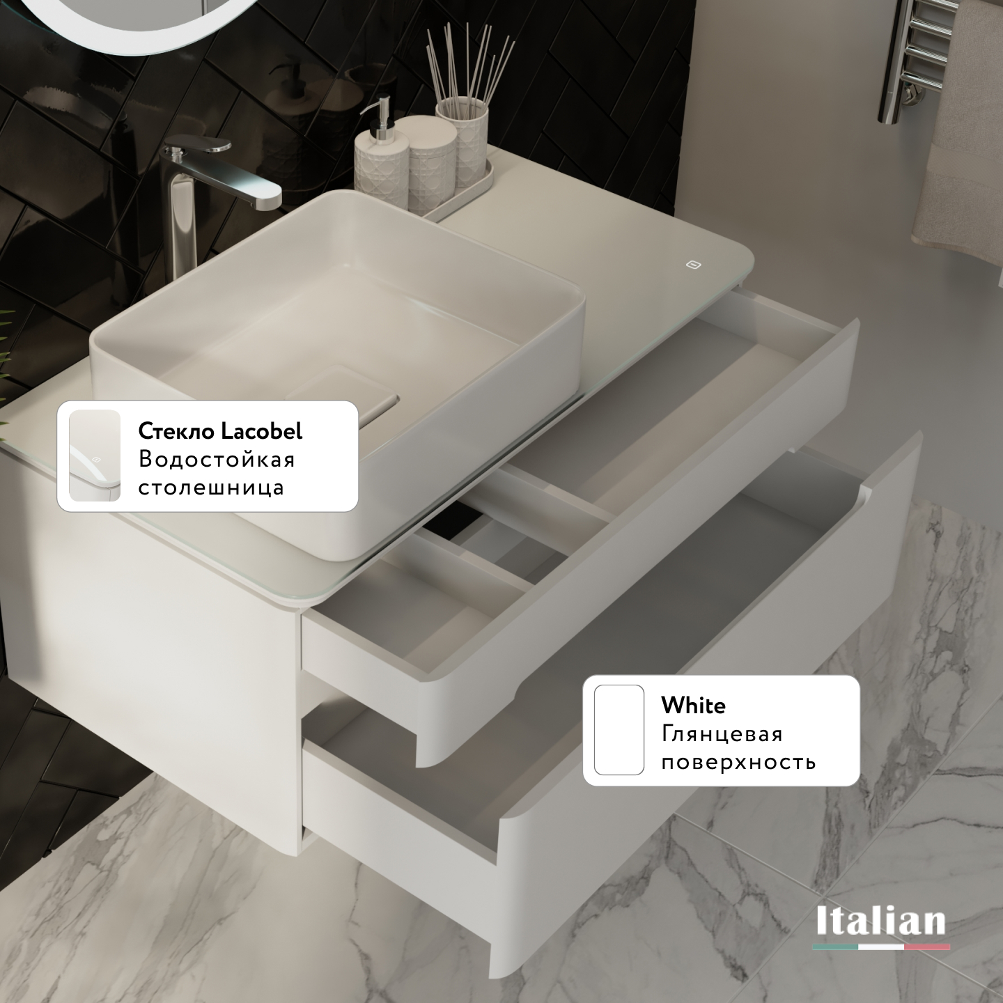 Тумба устойчива к царапинам и перепаду температур. Столешница из стекла Lacobel придает легкость композиции. Бесконтактное включение подсветки. Система плавного закрывания ящиков. Внутренний дополнительный ящик для мелочей. Само название коллекции говорит о том, что одним из основных достоинств данного комплекта является подсветка. Свет столешницы тумбы можно регулировать от деликатного мягкого до более яркого.|
