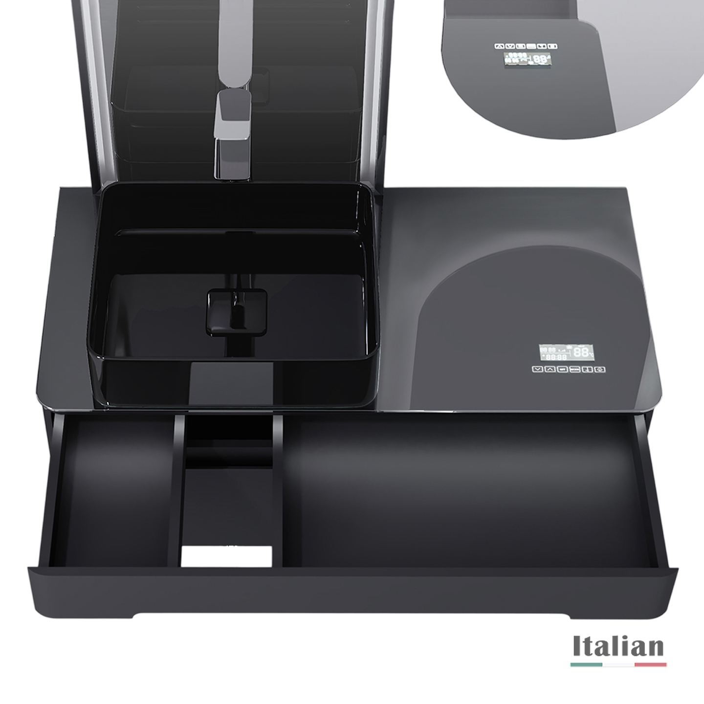 Тумба для ванной встроенным Медиа Модулем. В столешницу встроен многофункциональный модуль, который показывает температуру, время и дату, а также Bluetooth система с двумя динамиками.