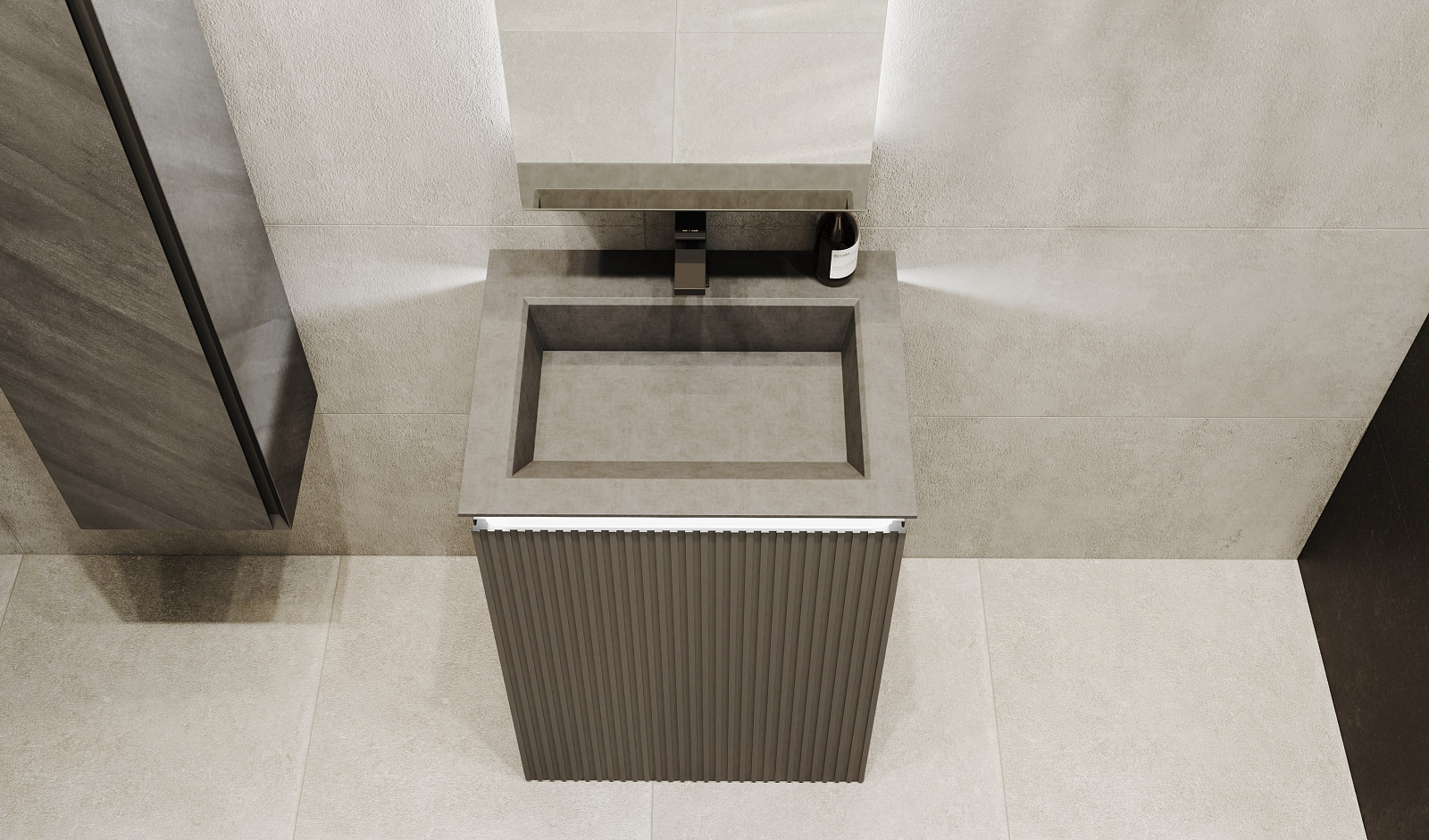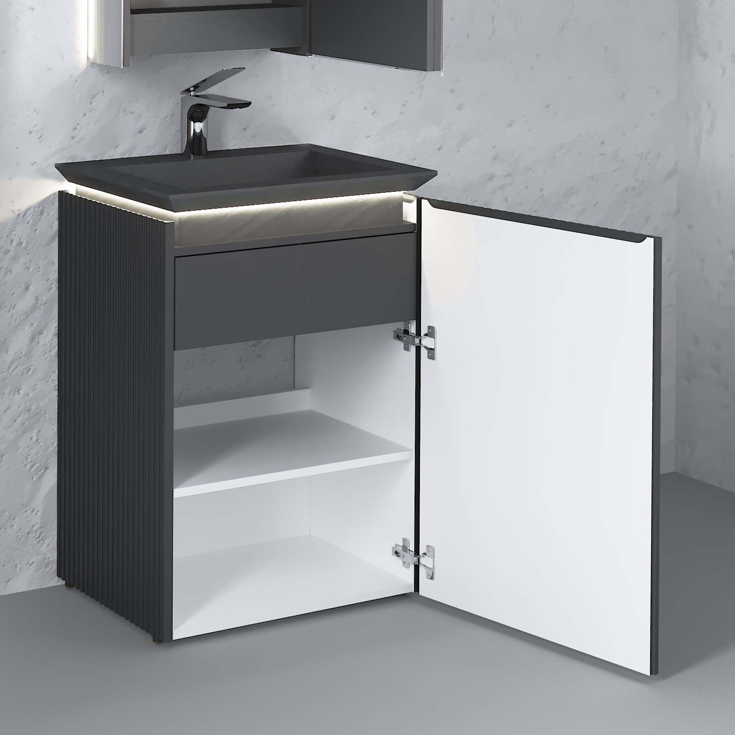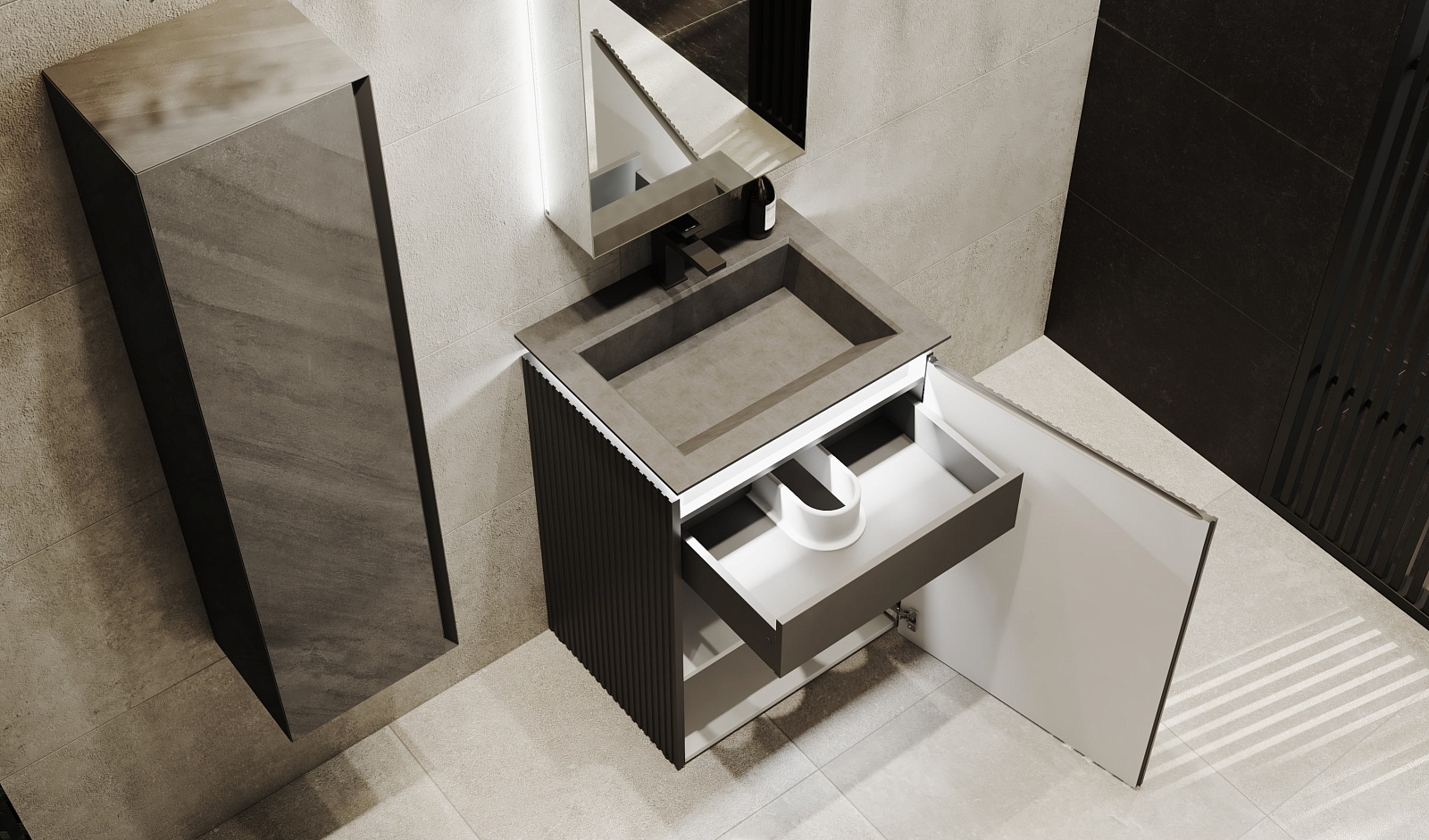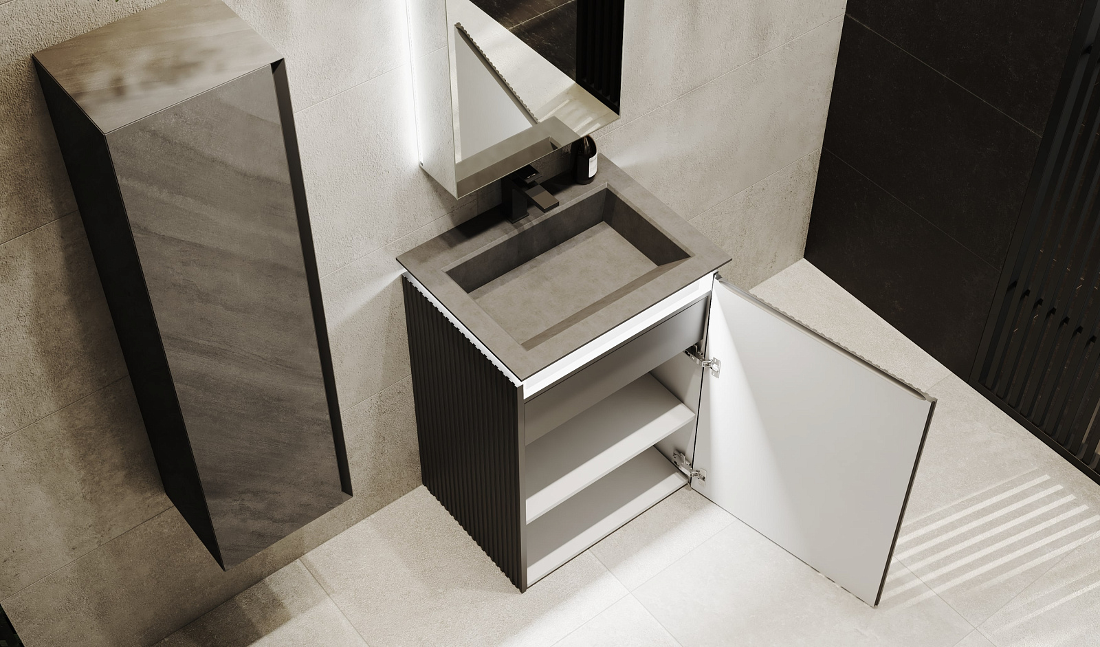 Фасад и корпус изделия выполнены из МДФ, покрытым пластиком HPL цвета антрацит.