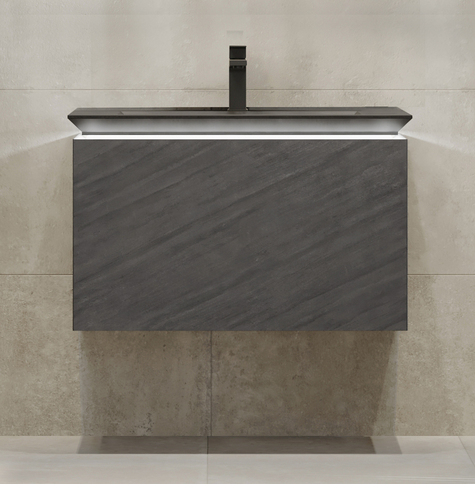 Сама тумба выполнена из экстра-прочного корпуса из МДФ в итальянском HPL пластике. Тумба оснащена подсветкой раковины и комплектуется архитектурными бетонными раковинами (приобретается отдельно).