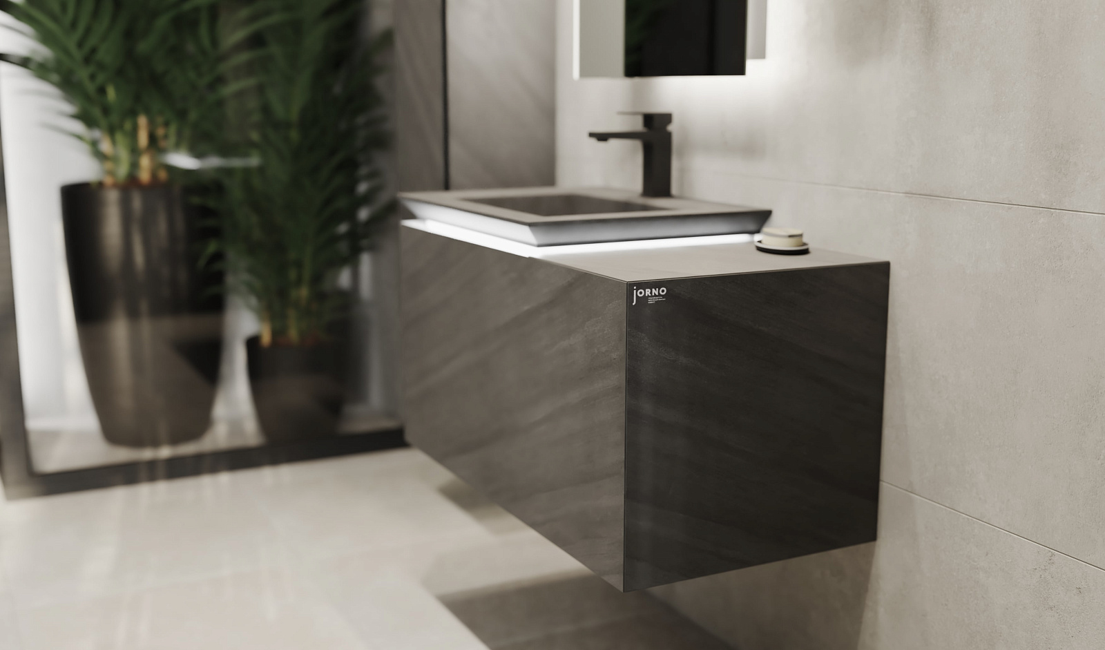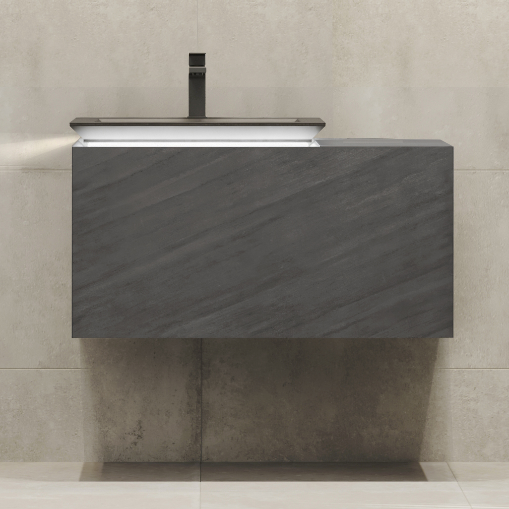 Подвесная тумба Incline 90 оснащена полочкой и выдвижным ящиком с интегрированной ручкой в верхней части фасада ящика.