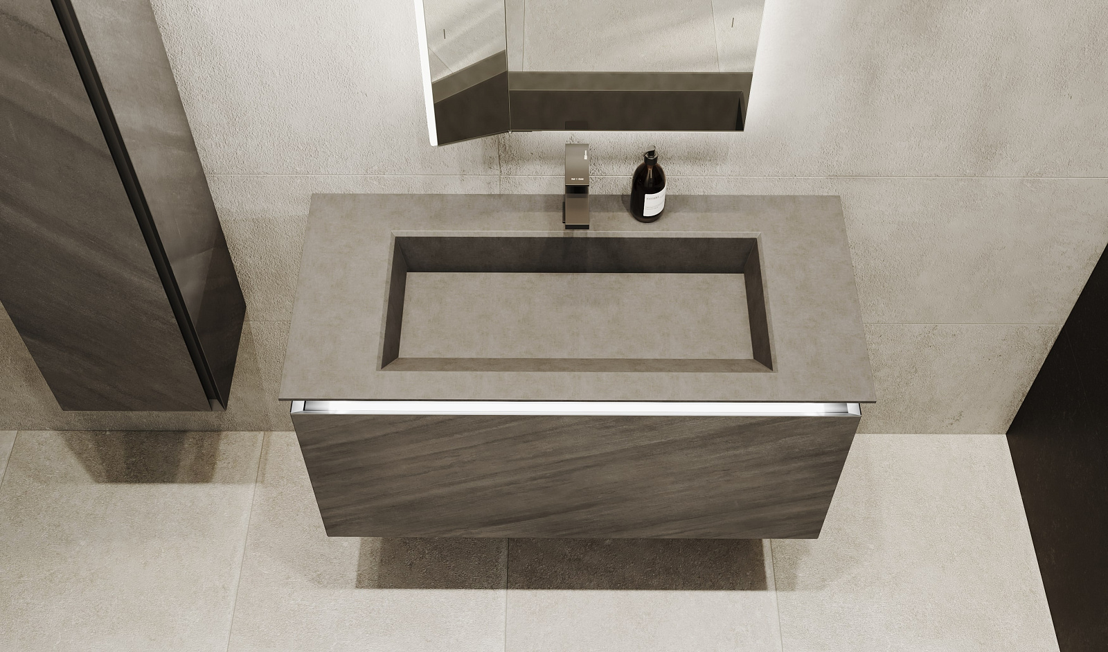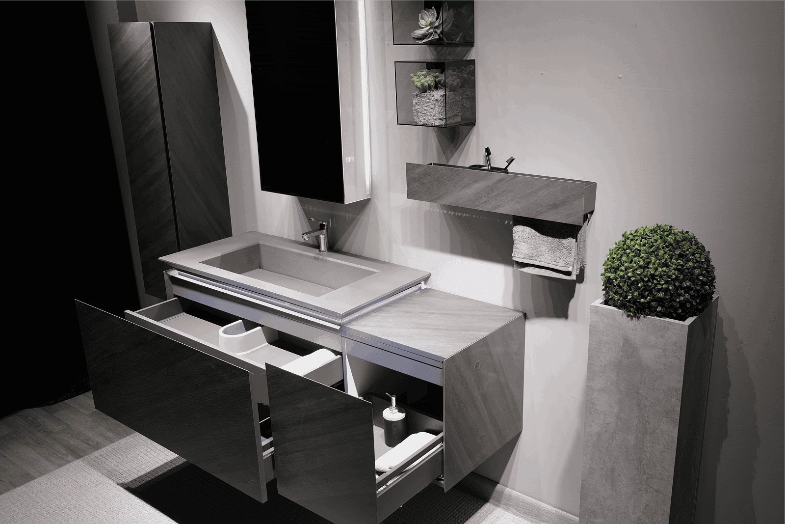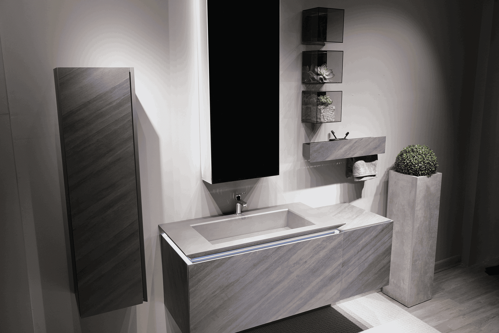 Сама тумба выполнена из экстра-прочного корпуса из МДФ в HPL пластике. Тумба оснащена подсветкой раковины и комплектуется архитектурными бетонными раковинами (приобретается отдельно).
