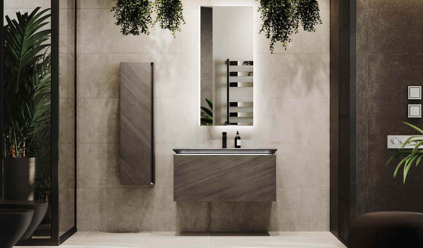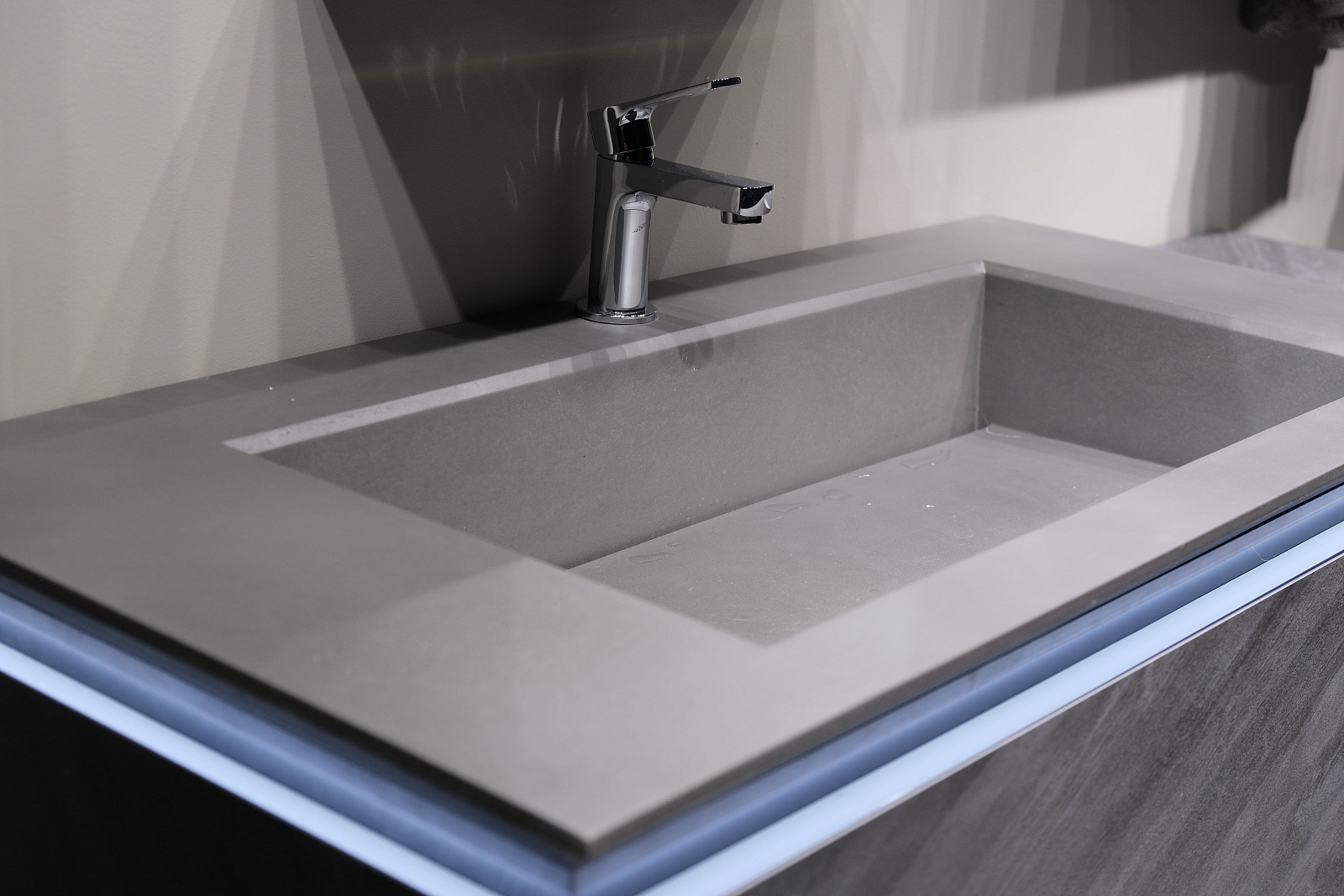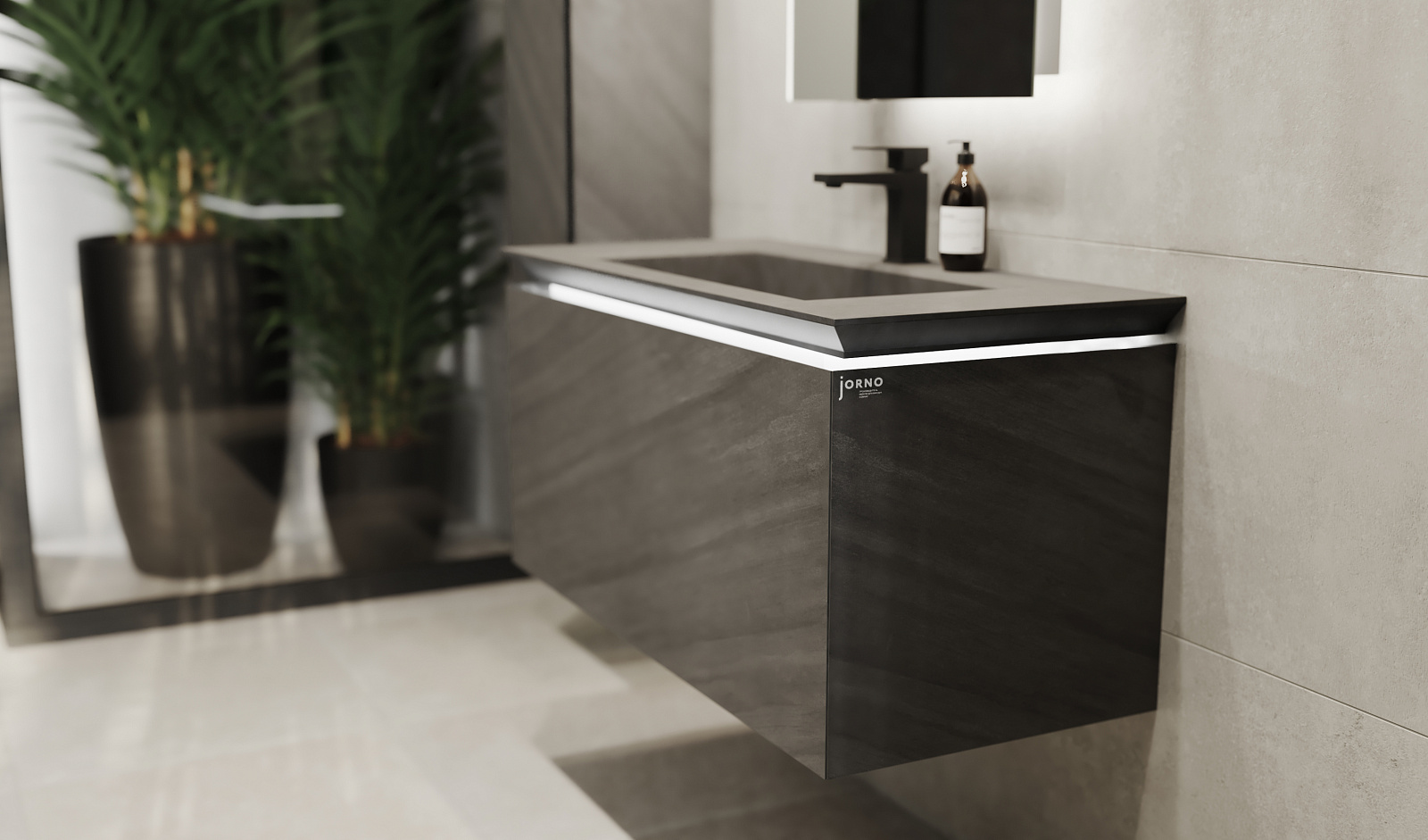 Сама тумба выполнена из экстра-прочного корпуса из МДФ в HPL пластике. Тумба оснащена подсветкой раковины и комплектуется архитектурными бетонными раковинами (приобретается отдельно).