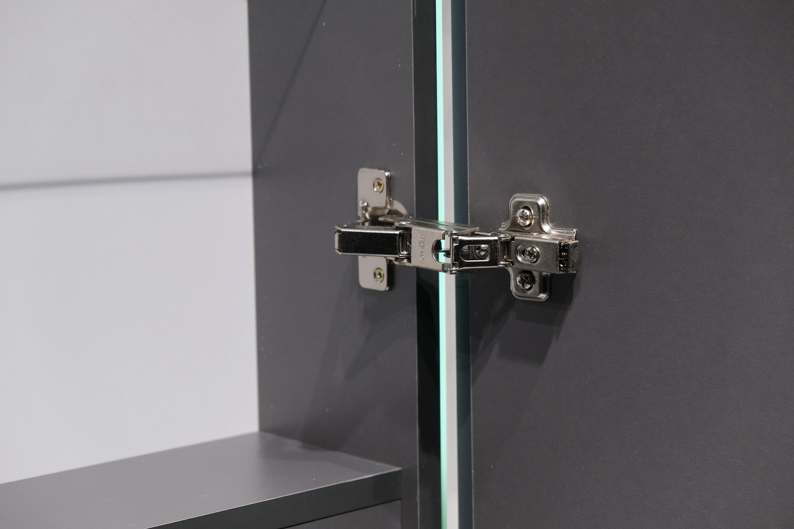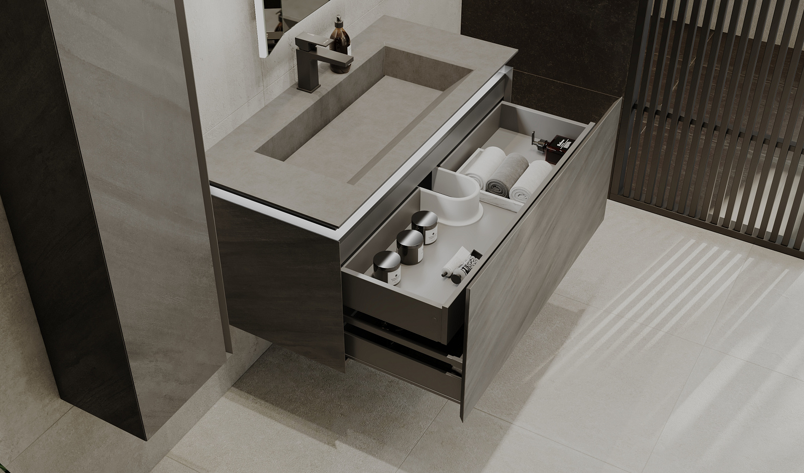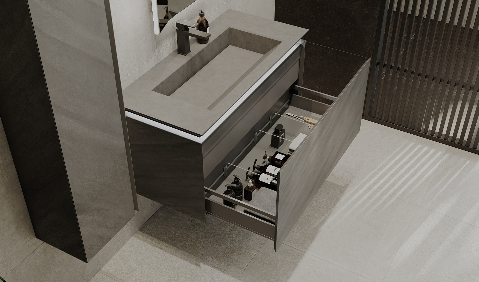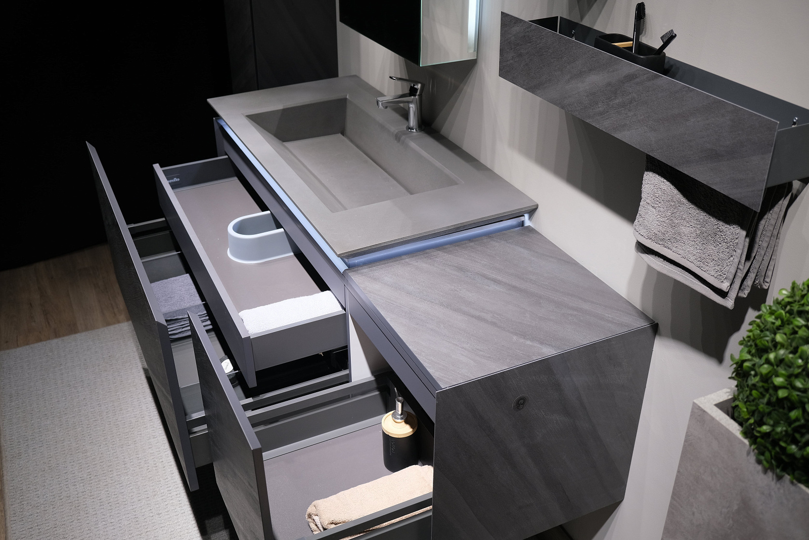 Скрытое сенсорное включение подсветки сбоку тумбы. Удобные и просторные выдвижные ящики оснащены системой плавного закрывания и системой MetaBox. Внутренний дополнительный ящик для мелочей.