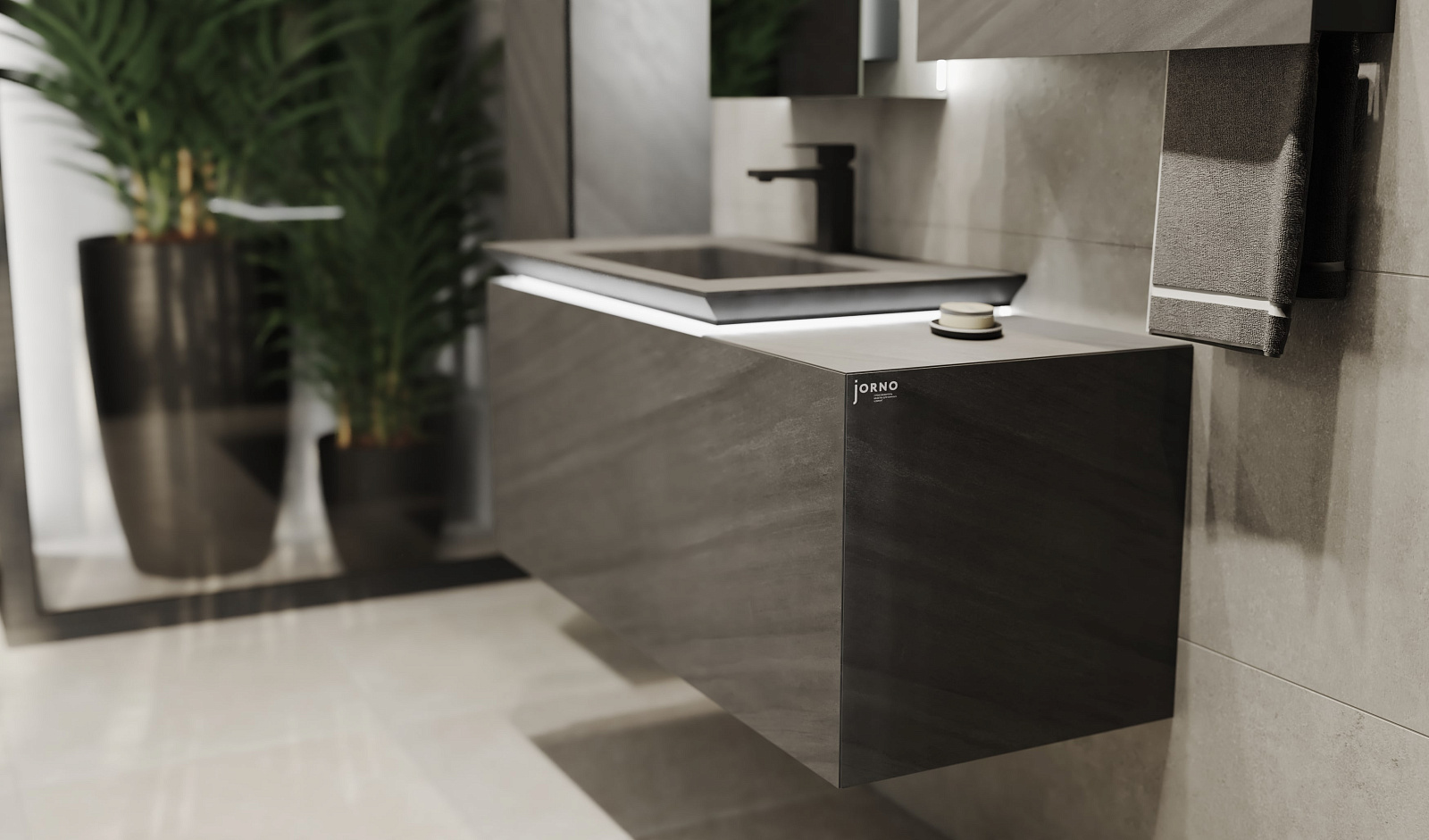 Подвесная тумба Incline 110 оснащена полочкой и выдвижным ящиком с интегрированной ручкой в верхней части фасада ящика.