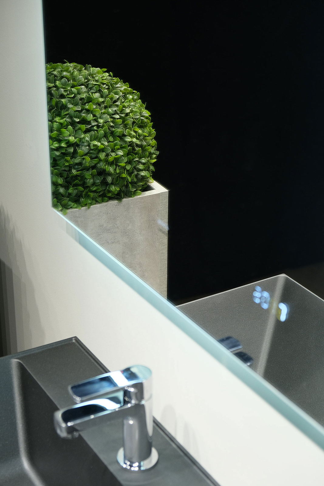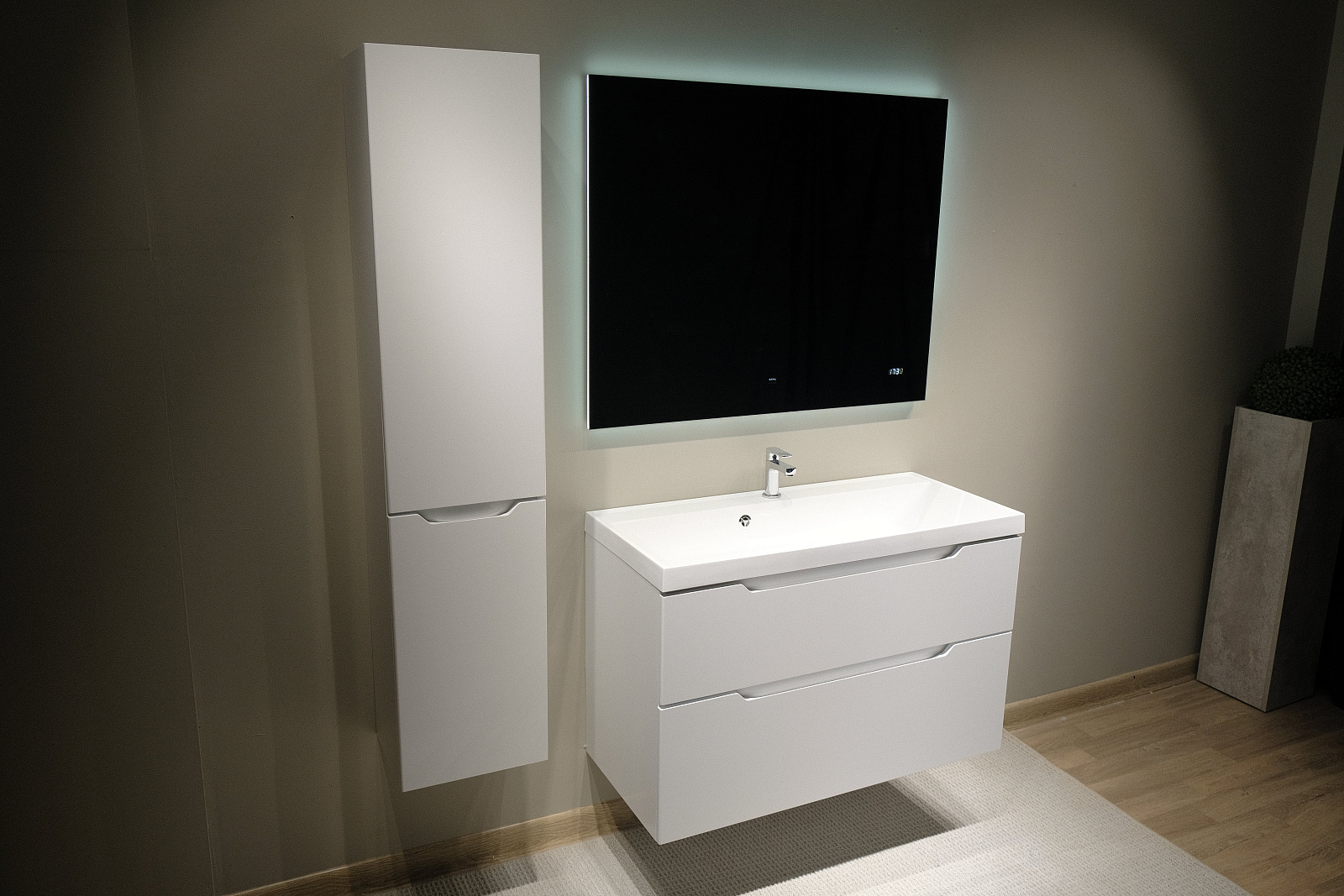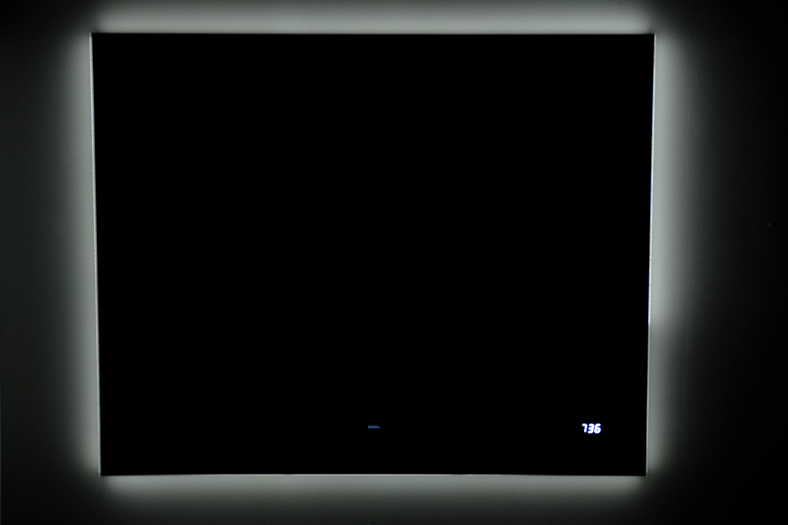 Контурное свечение выделяет его на фоне окружающих предметов и подчеркивает фактуру отделки (необычная штукатурка, рельефная плитка). Рассеиватель в край зеркала с диодной подсветкой создает эффект парящего в воздухе зеркала. Зеркало оснащено датчиком включения на взмах, встроенными часами и логотипом бренда Raval с подсветкой.